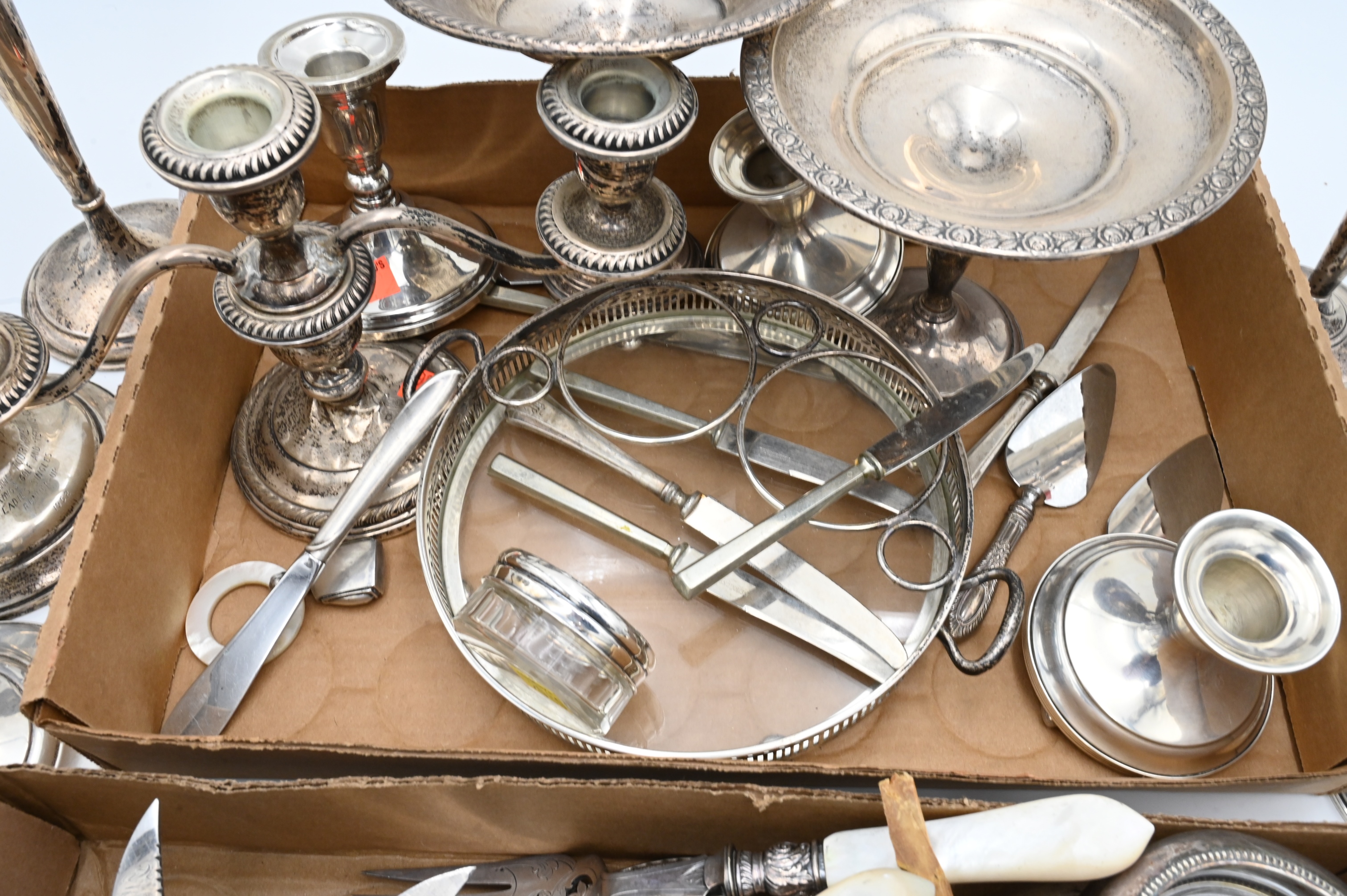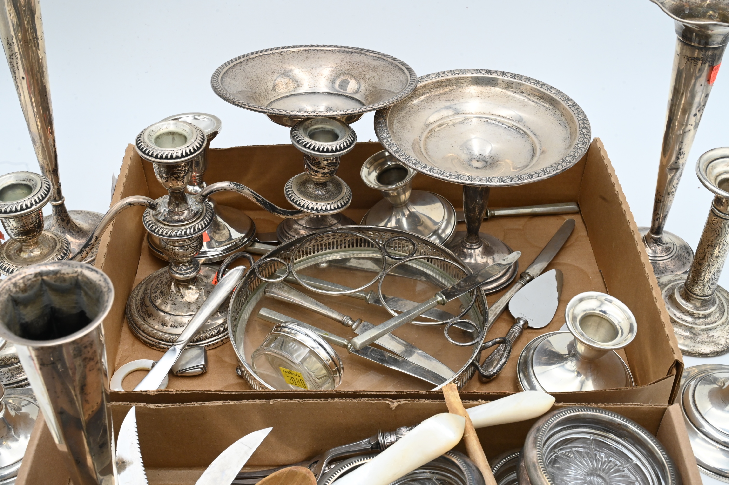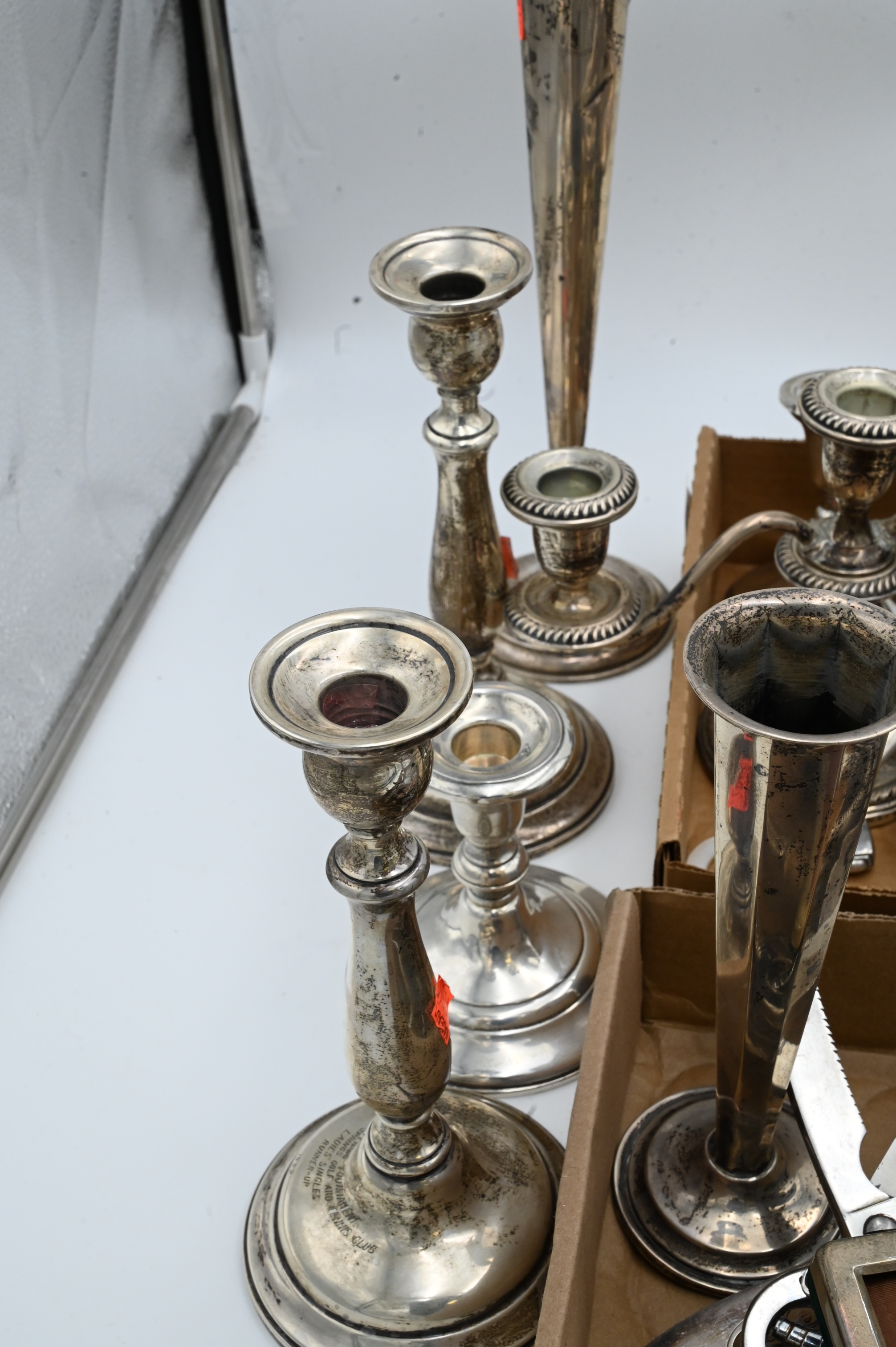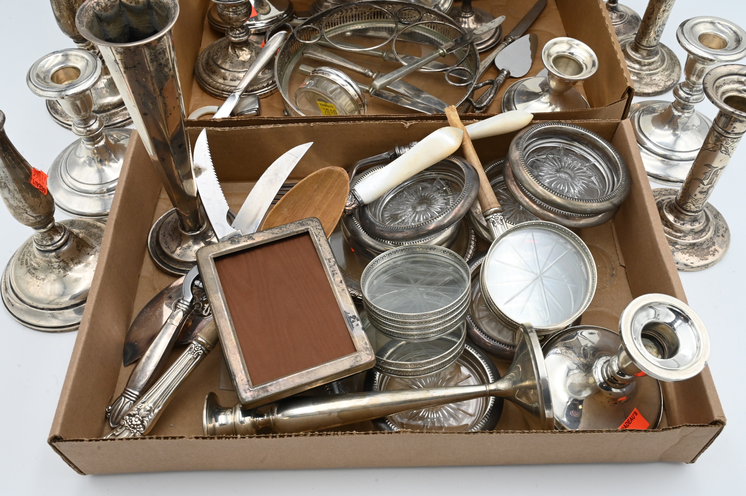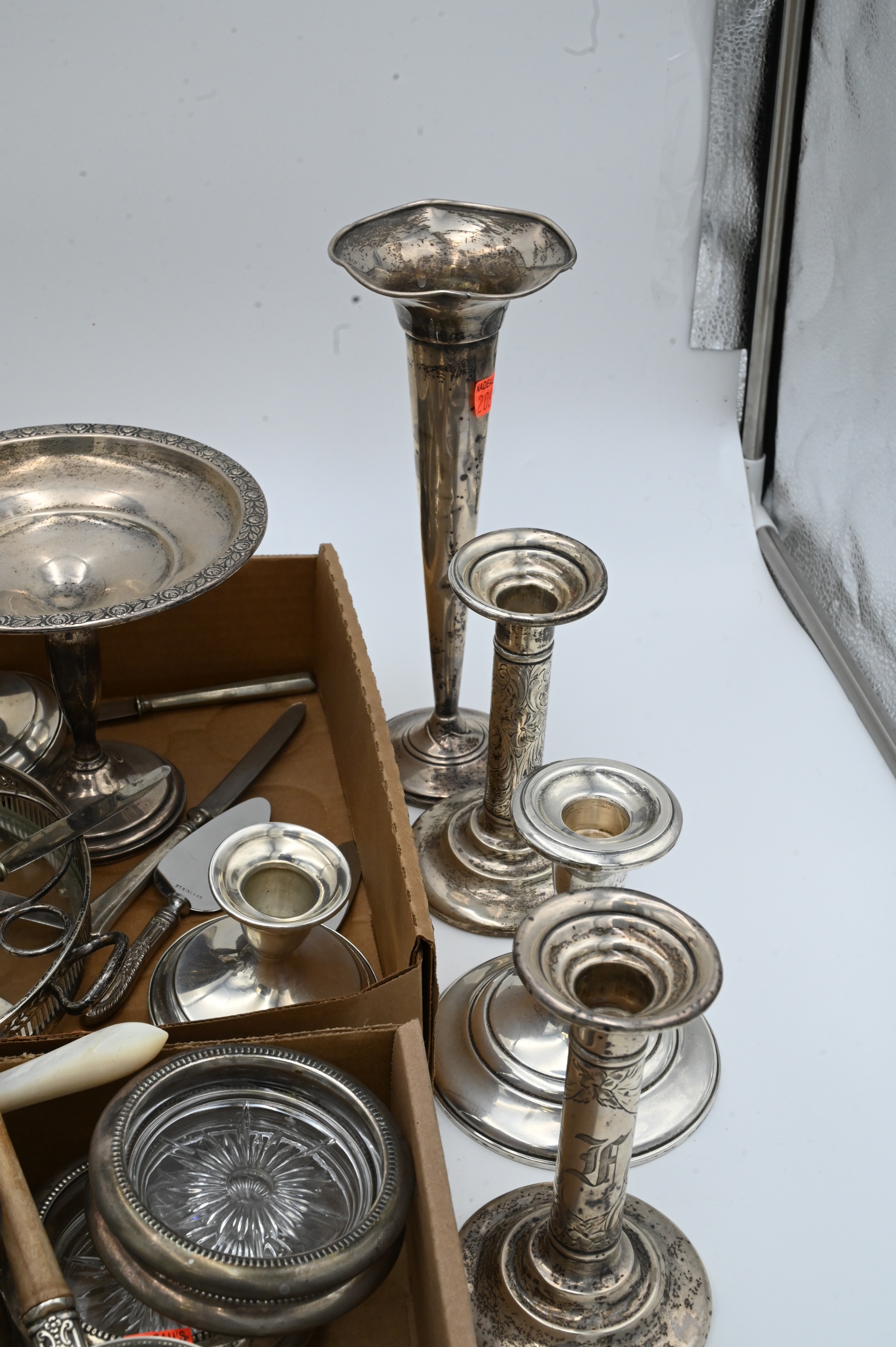 Two Tray Lots of Weighted Sterling Silver, to include candle sticks, casters and picture frame, etc.