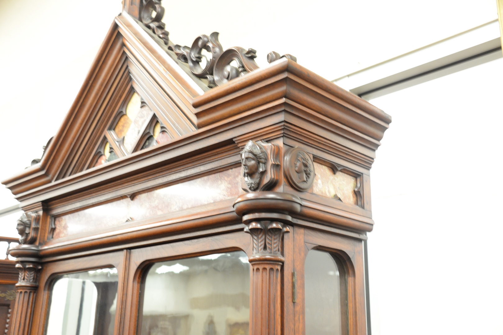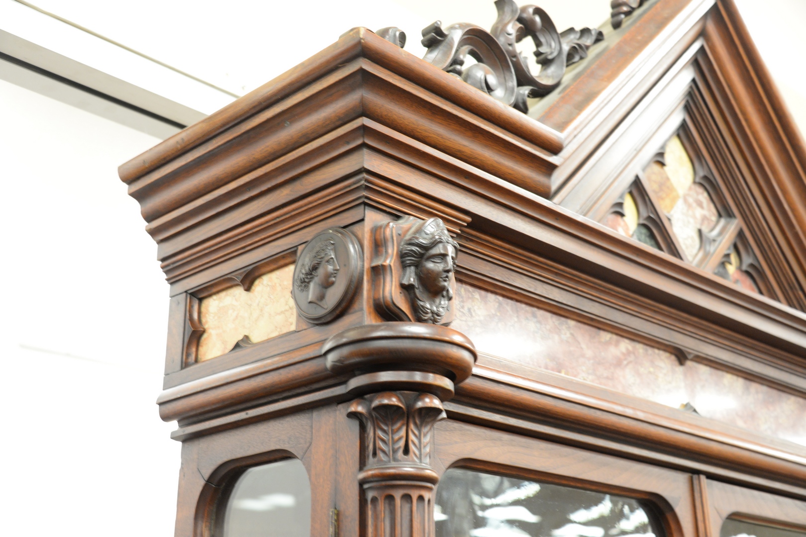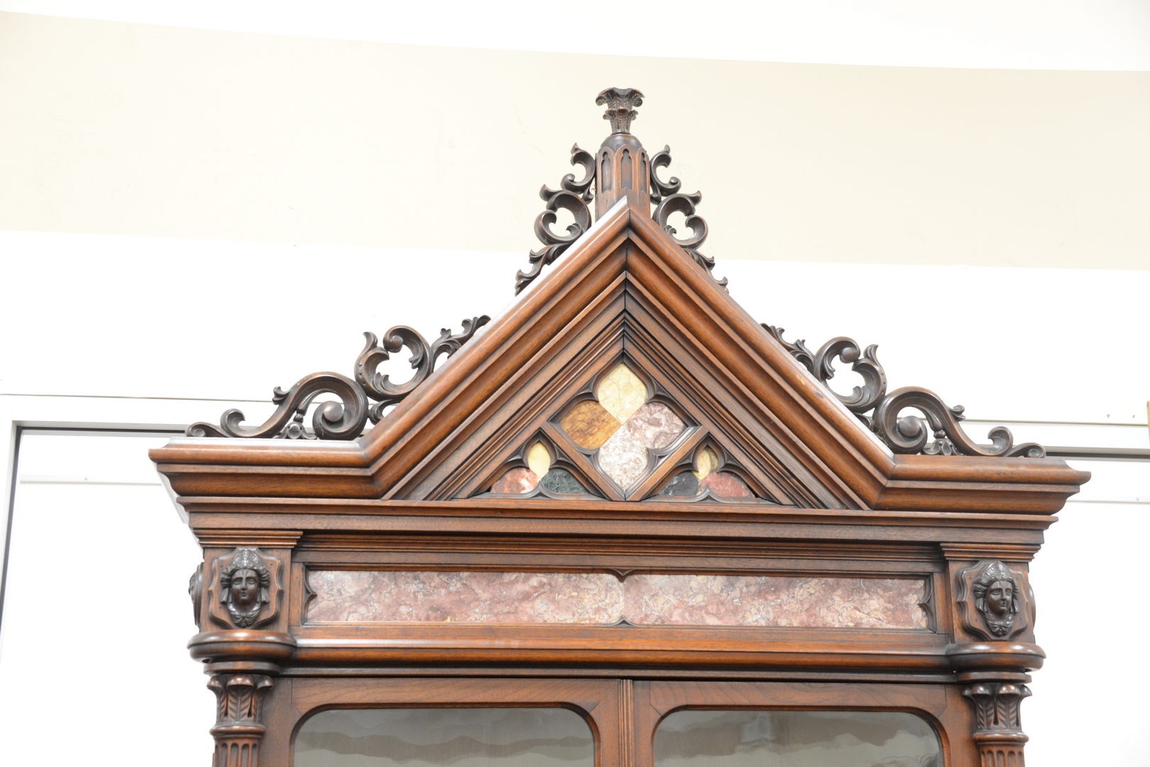 Lot 362: Victorian Walnut Gothic Cabinet having pierced carved pediment over specimen marble inlays flanked by two faces over two glass doors…