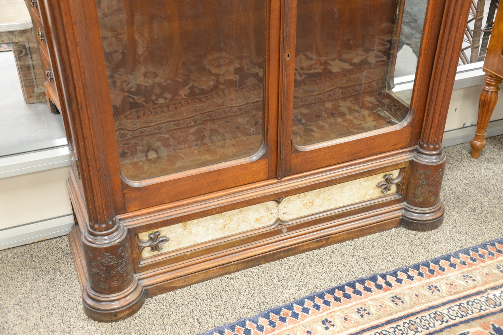 flanked by two faces over two glass doors flanked by large fluted columns, with inlaid marble bottom