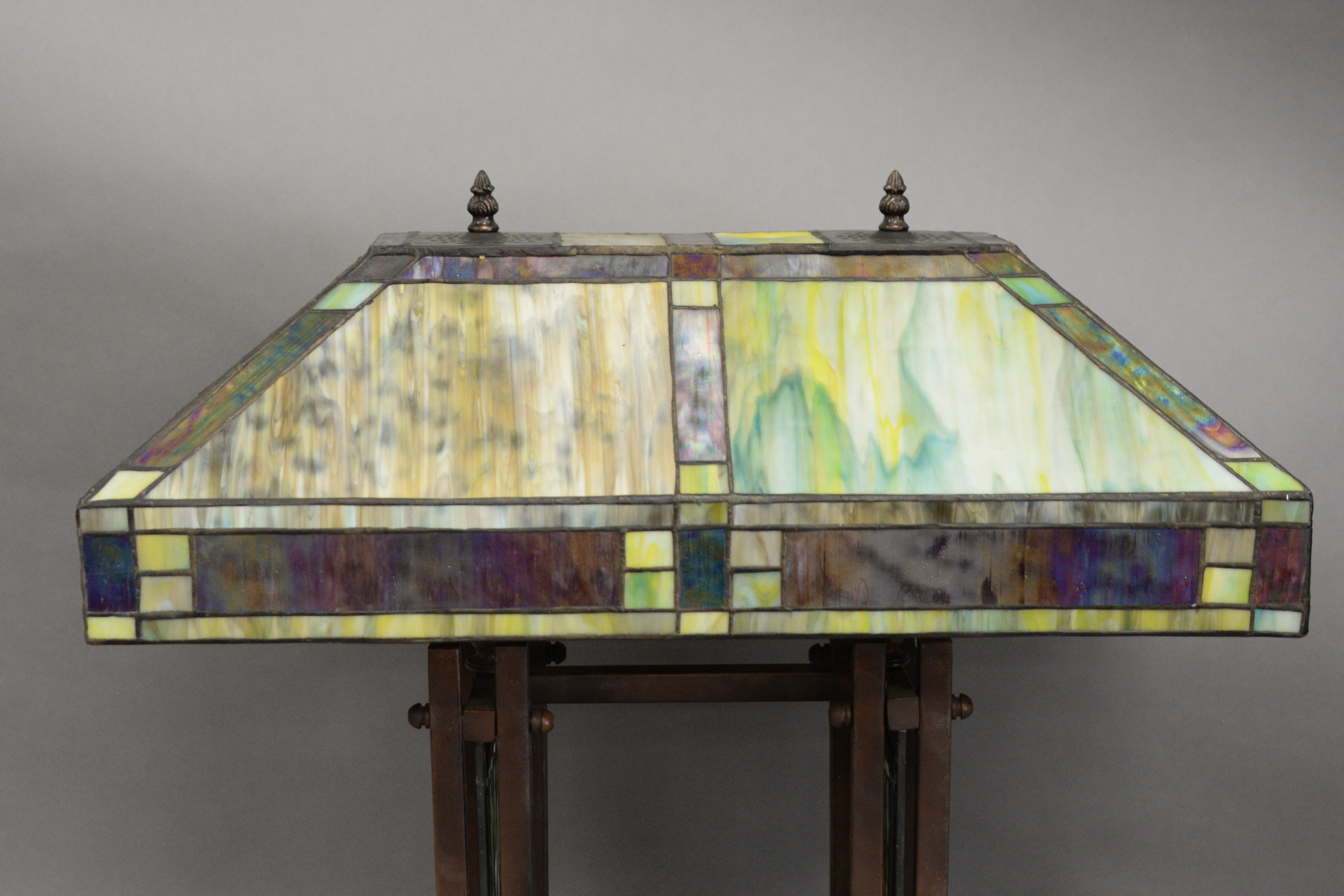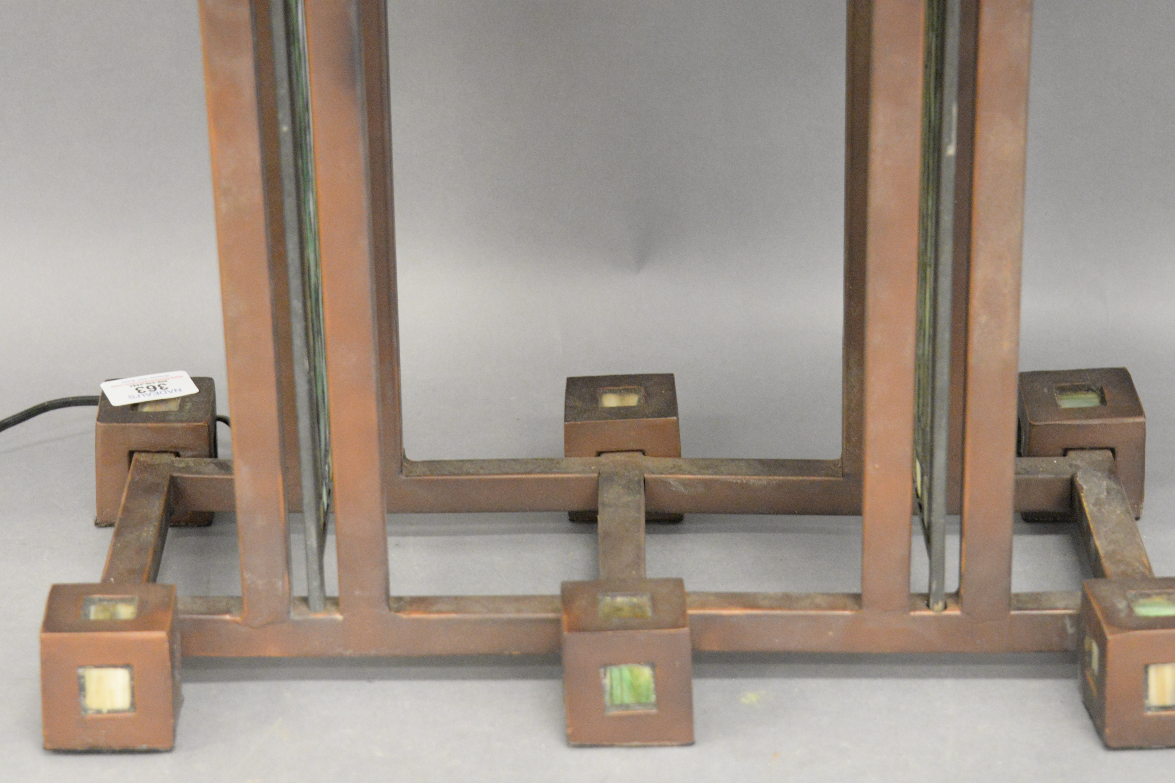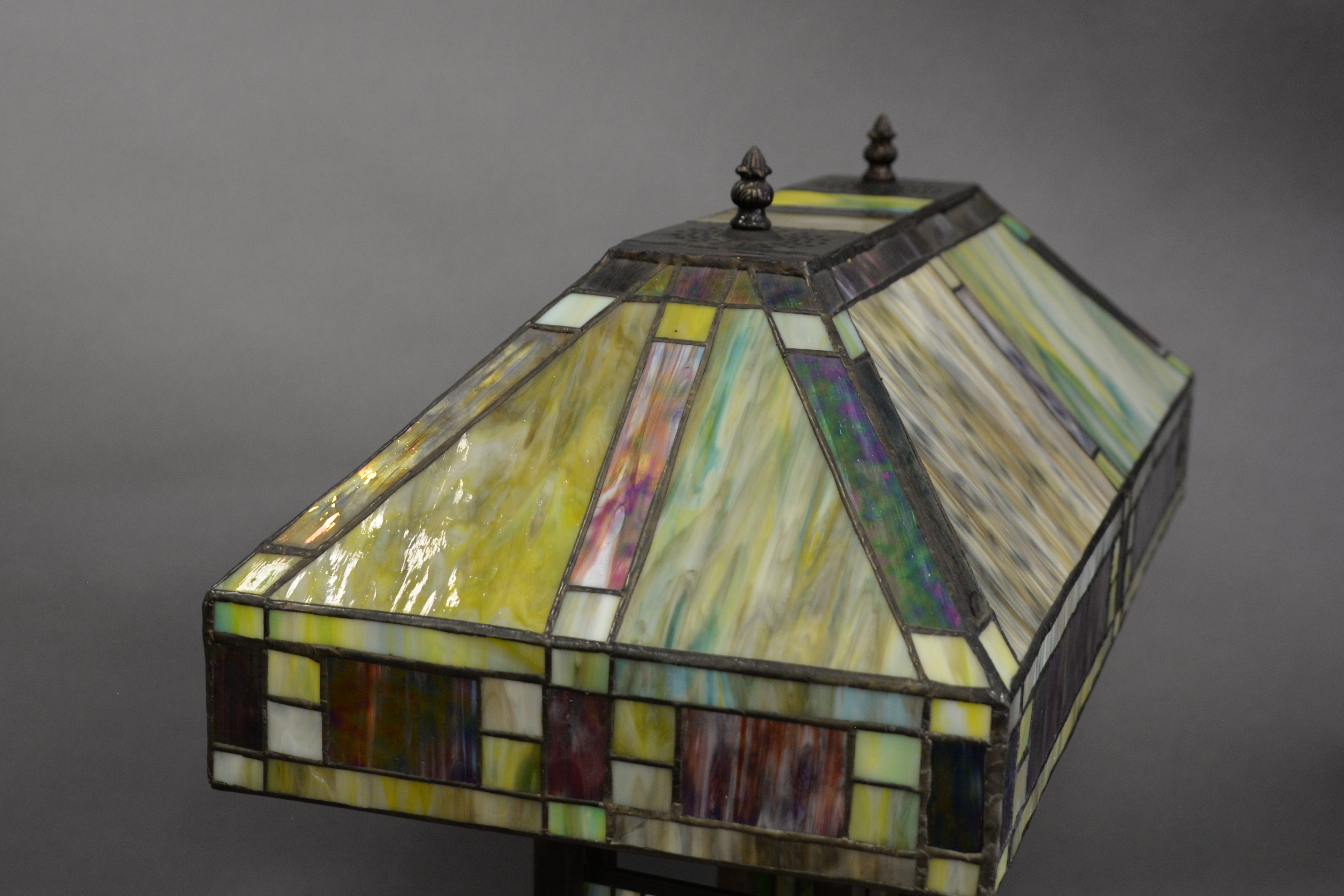 Arts And Crafts Double Slag Glass, table lamp having copper mission style base with square feet with slag glass panels, rectangular shade, height 27 inches, length 17 1/2 inches