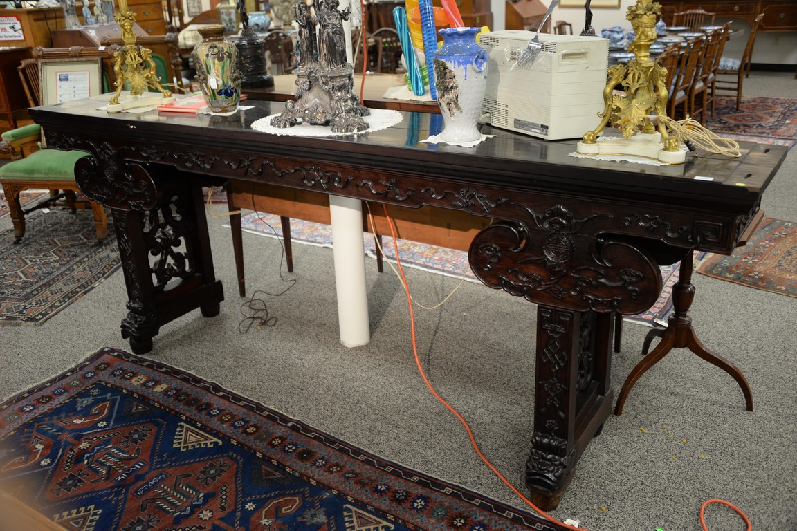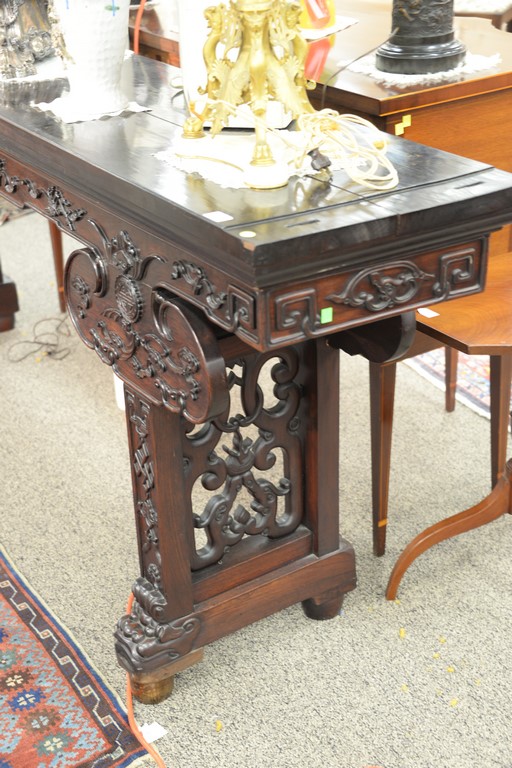 Chinese hardwood altar table having rectangular top over bat carved skirt and carved front with pierced carved supports set on dragon face base, now fitted with round feet, possibly hung mu. height 41 inches, length 107 inches, depth 18 inches