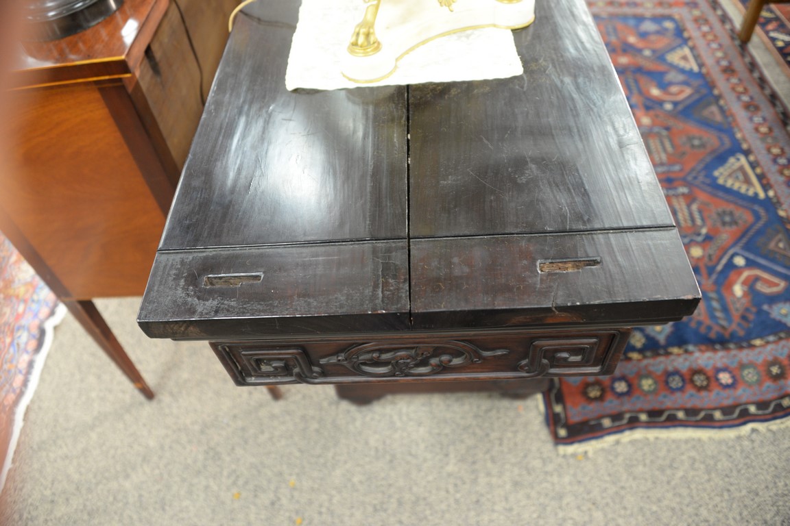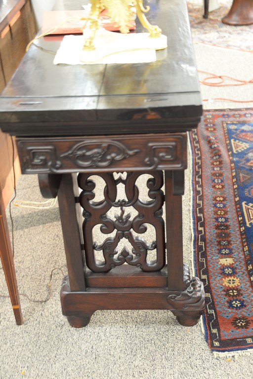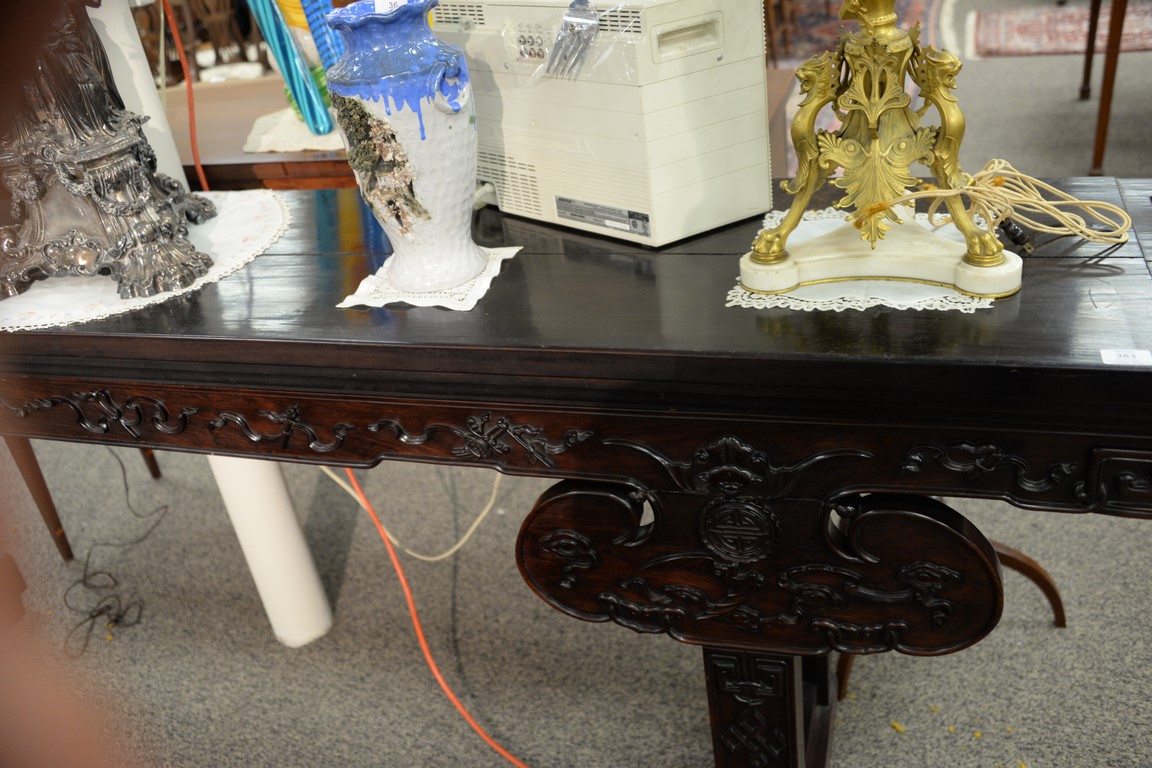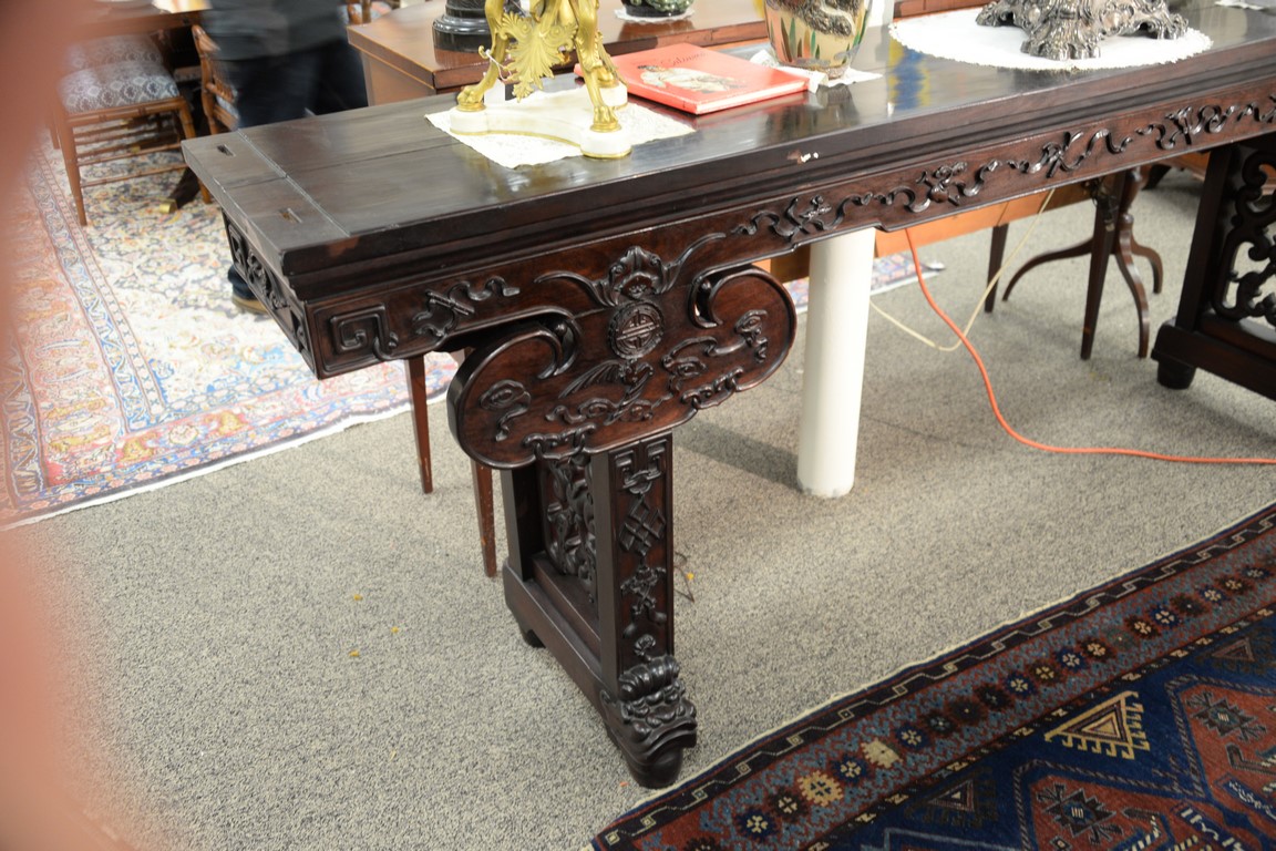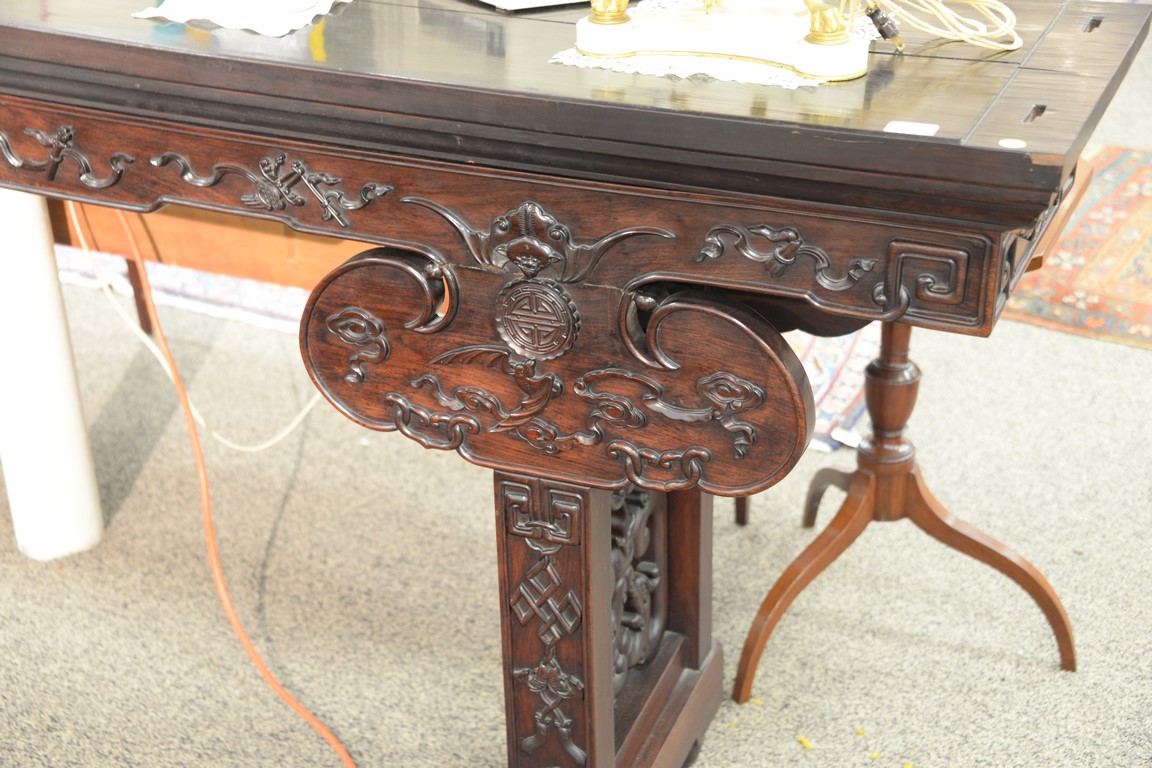 Lot 363: Chinese hardwood altar table having rectangular top over bat carved skirt and carved front with pierced carved supports set on drago…