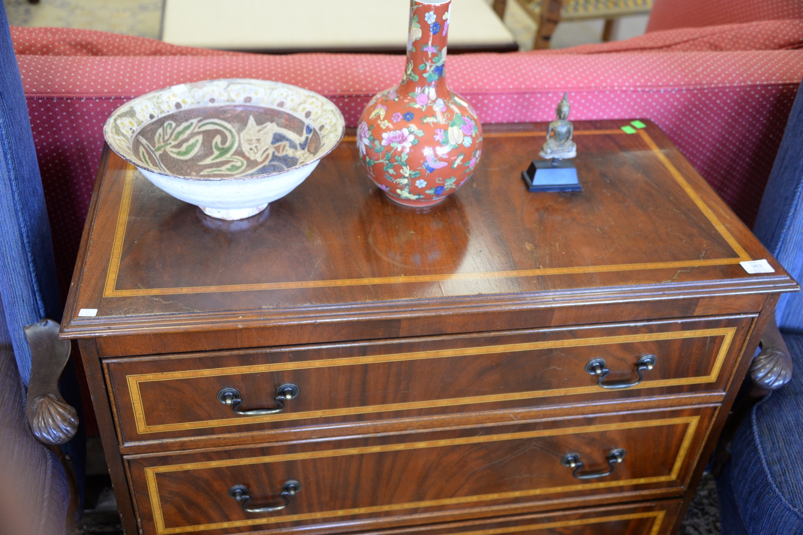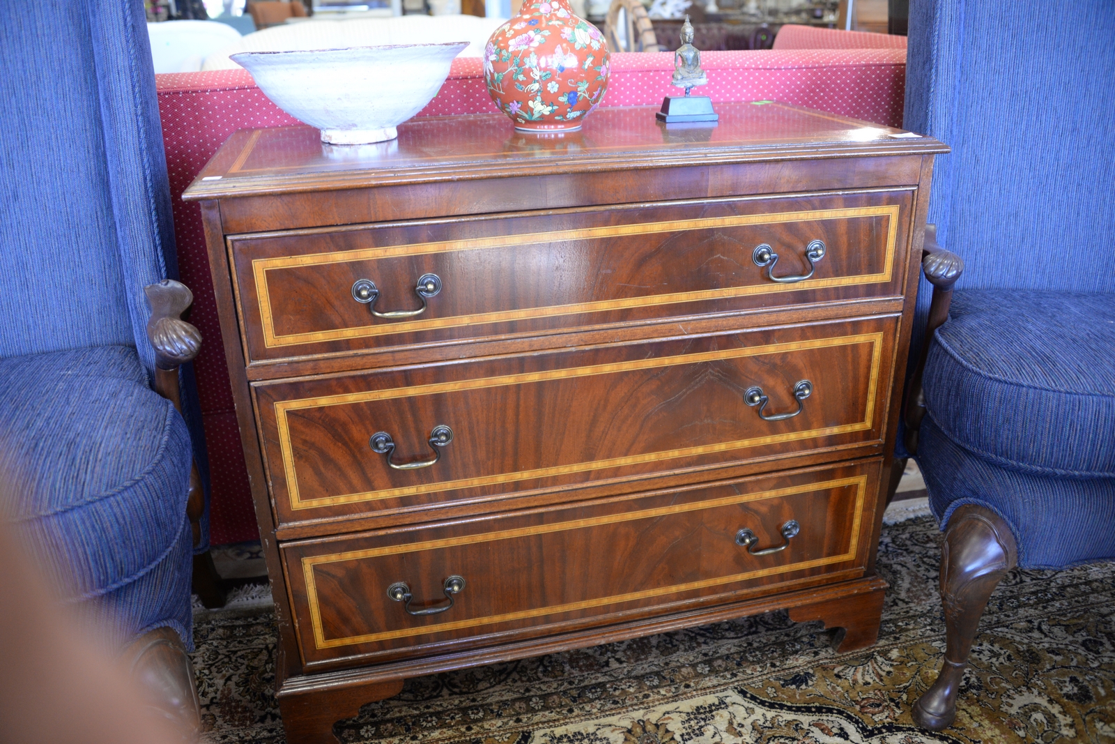 Custom mahogany inlaid three drawer chest. ht. 37in., wd. 37in., dp. 18in.