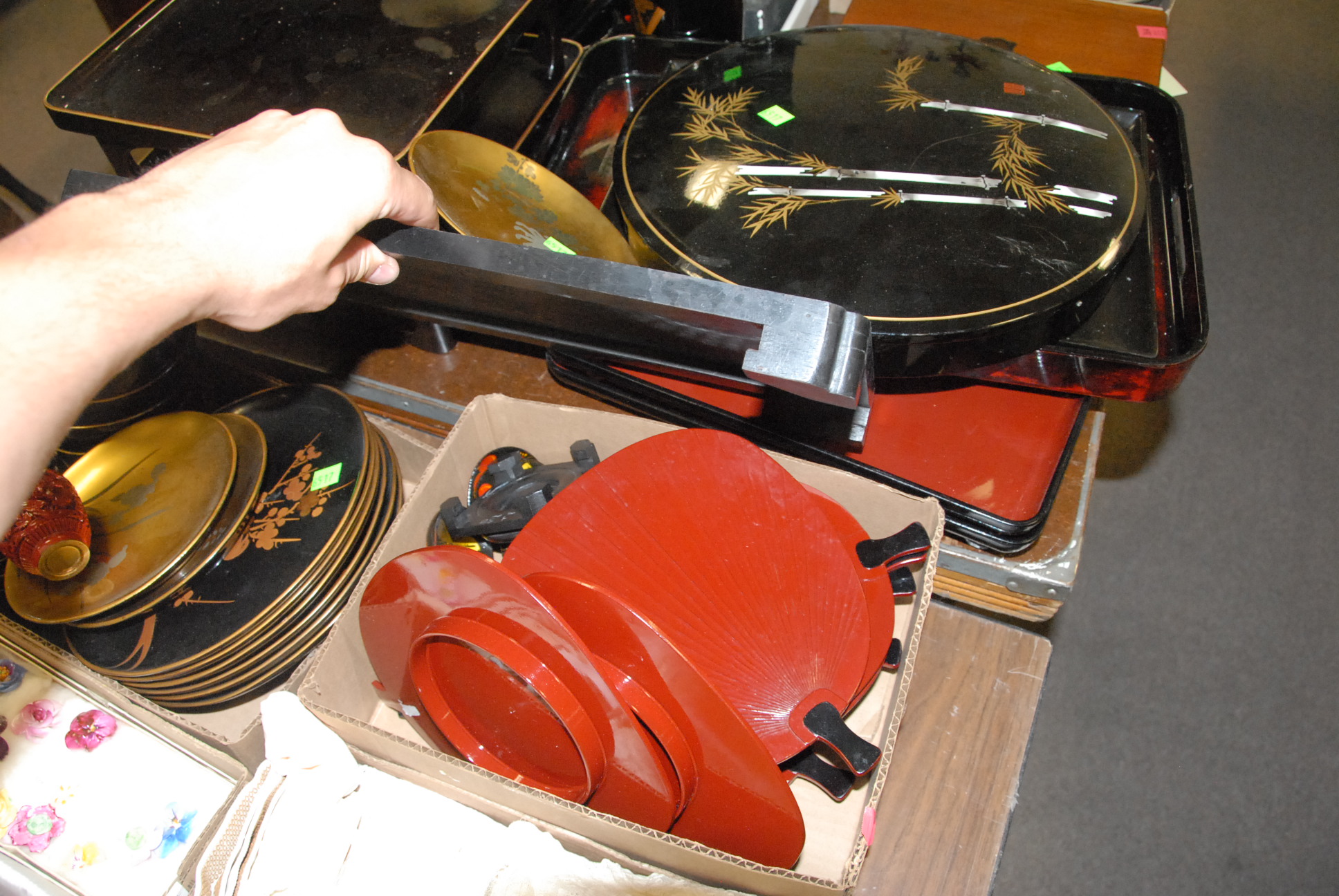 Four box lots Oriental lacquered bowls and plates, fans, serving dishes, trays, etc.