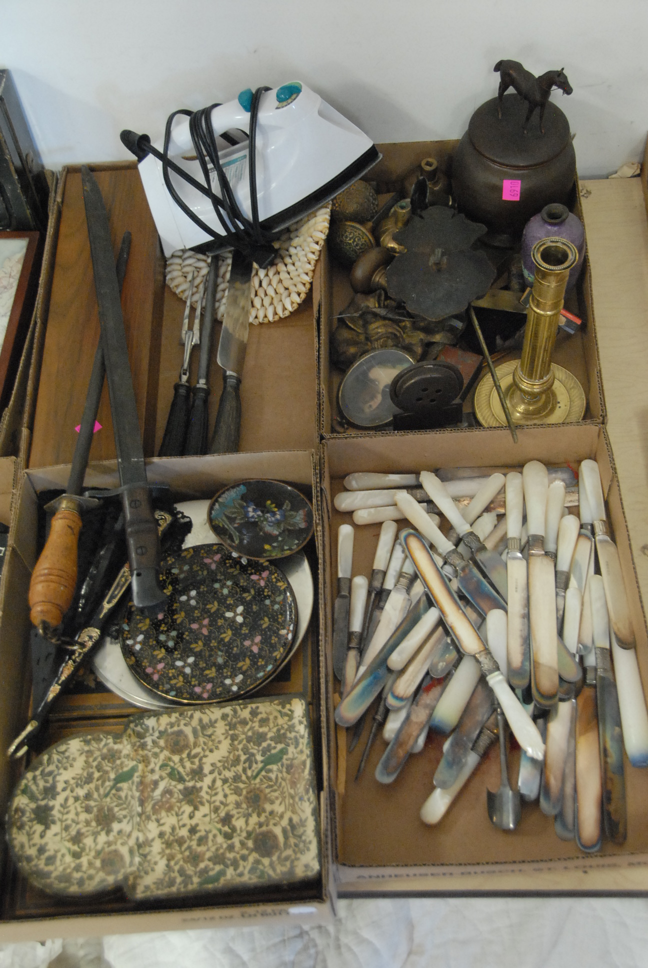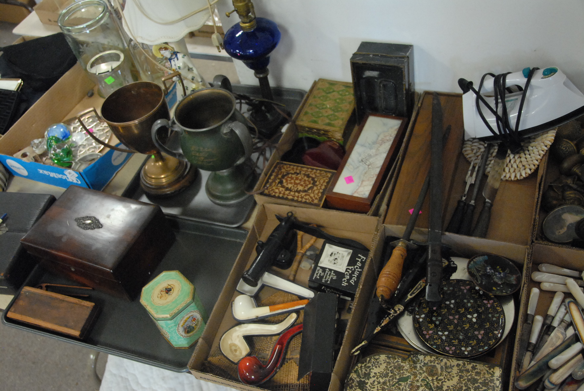 Lot 363: Group of eleven boxes to include brass candlesticks, door knobs, pearl handled knives, frames, cutlery set, two pipes, trophies, lam…