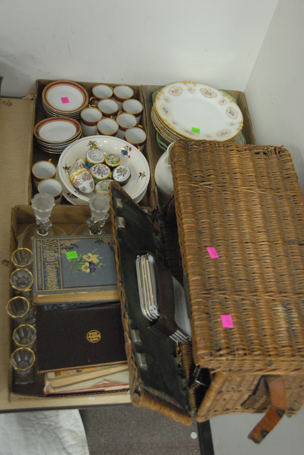 Group of eleven boxes to include brass candlesticks, door knobs, pearl handled knives, frames, cutlery set, two pipes, trophies, lamps, purses, silver overlay pieces, mahogany box, etc.