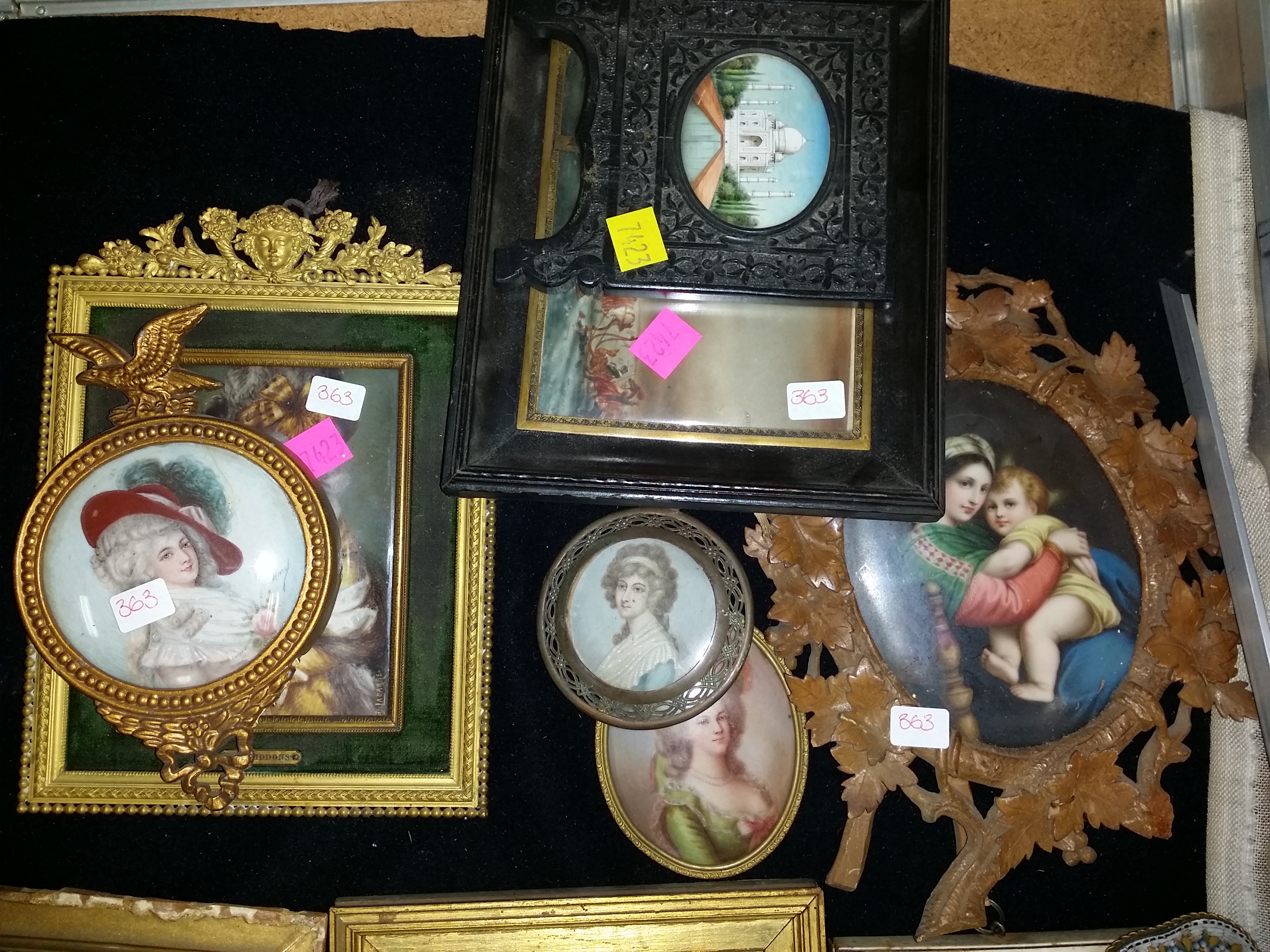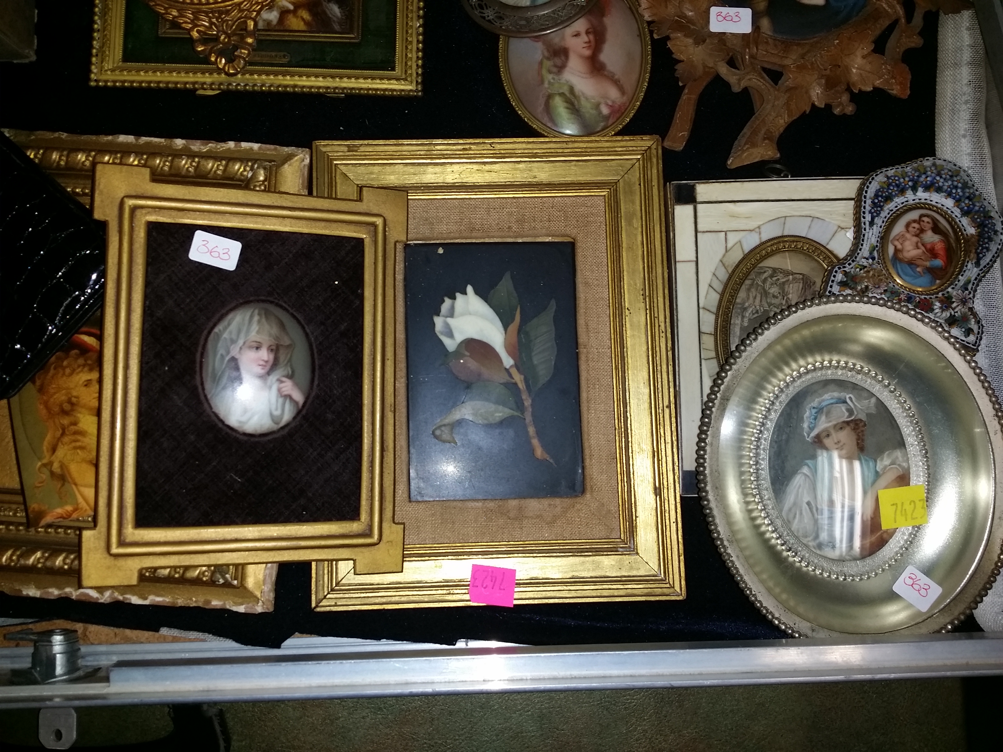 Group of fifteen miniature paintings, porcelain plates, and one pietra dura plaque.