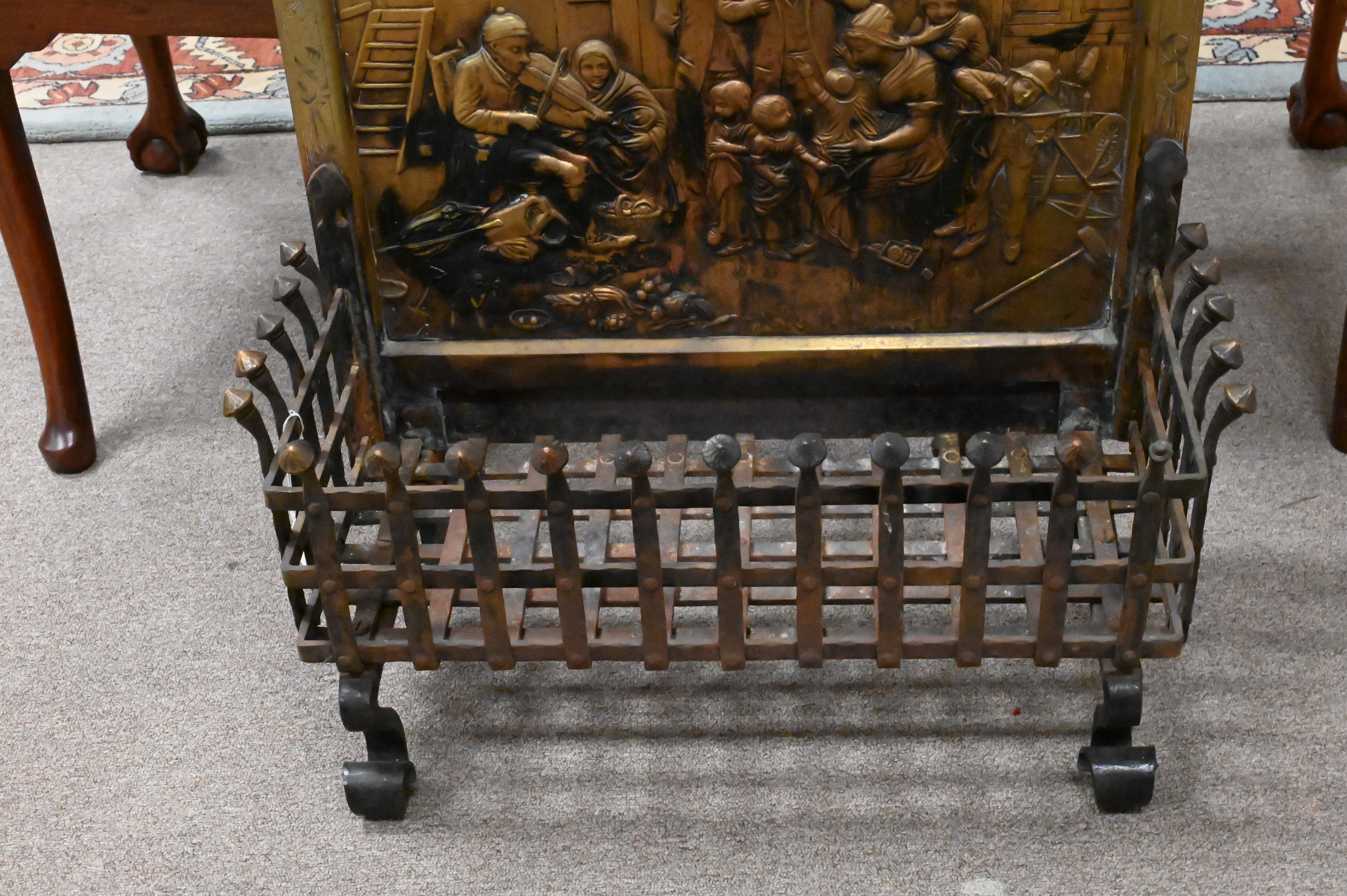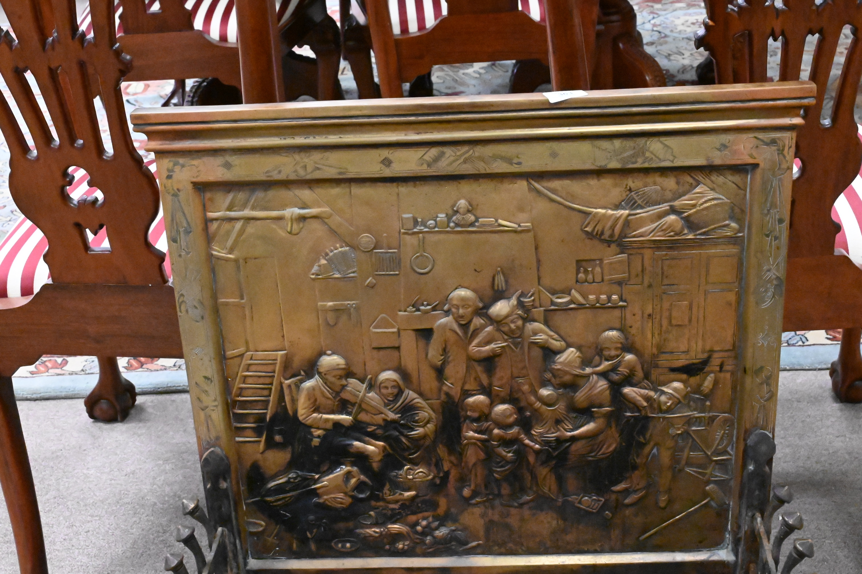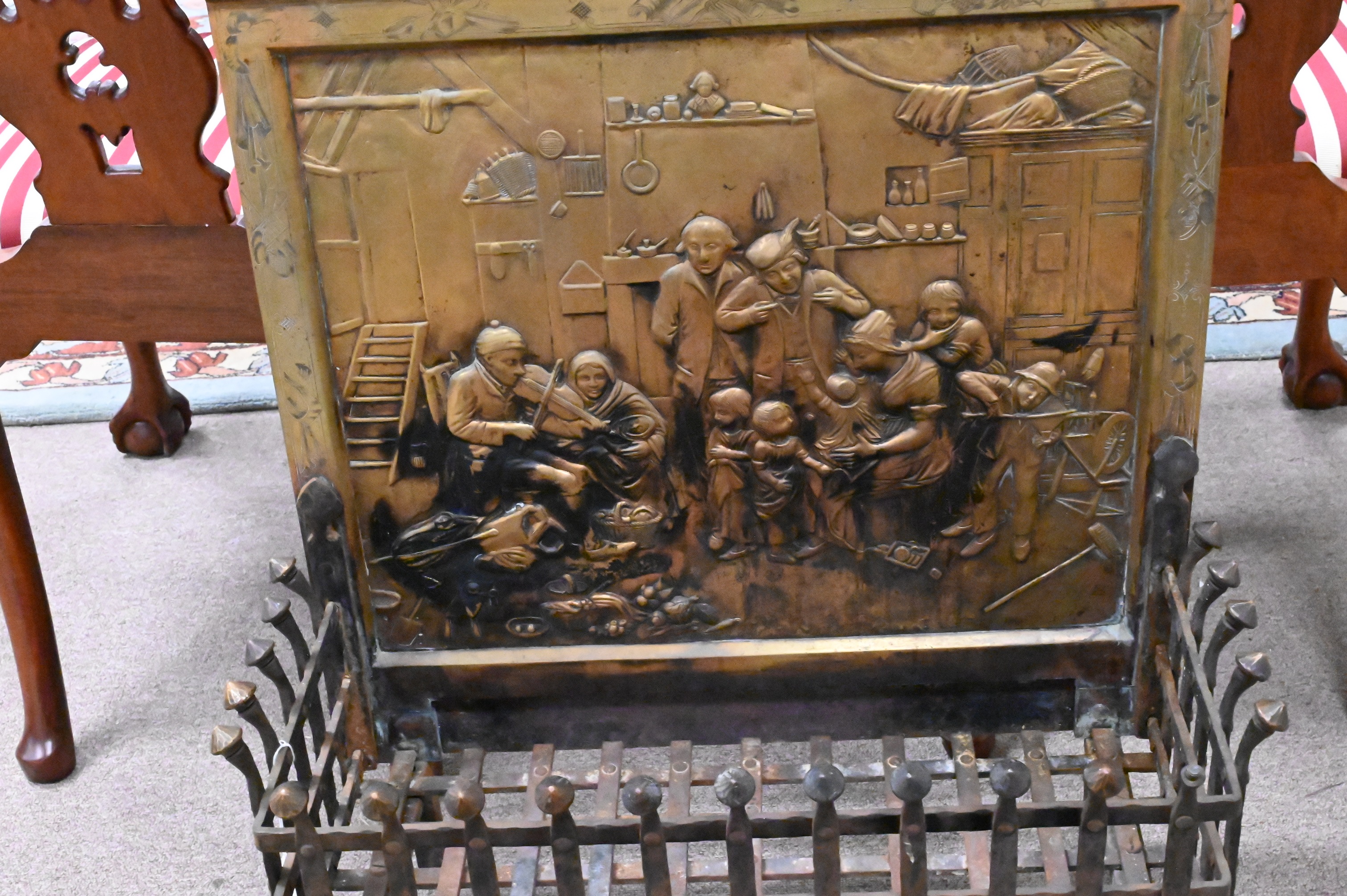 having back bronze panel depicting interior European scene mounted to openwork grate with bronze ends set on scroll feet