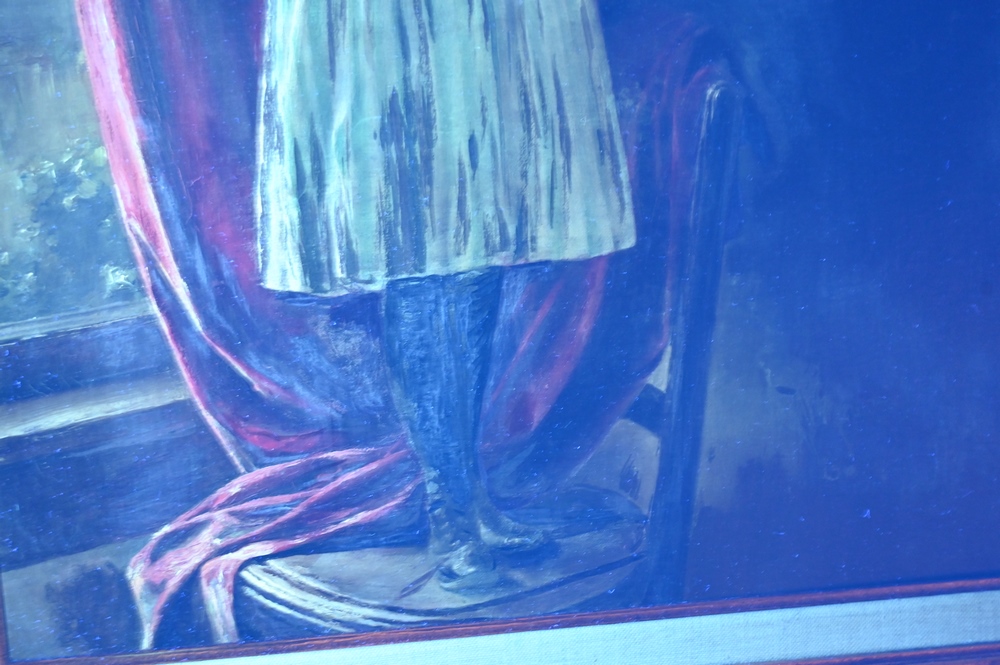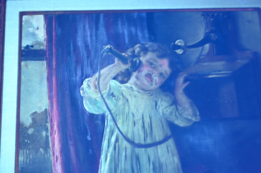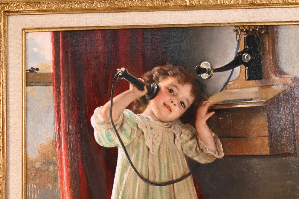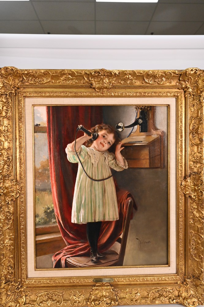 Karl Witkowski (1860 – 1910), Hello, young girl answering a telephone, oil on canvas, signed lower right K. Witkowski, relined, 24″ x 20″.