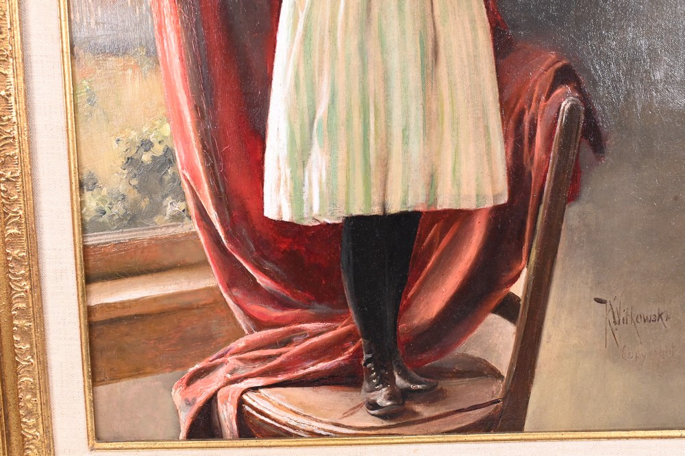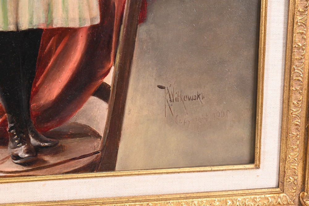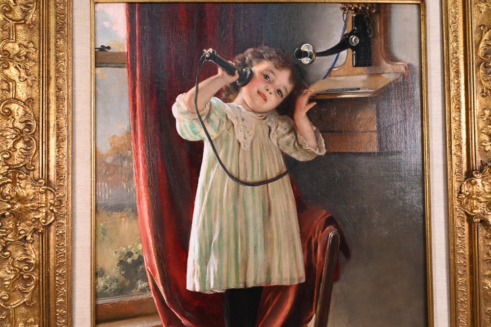 Lot 363: Karl Witkowski (1860 – 1910), Hello, young girl answering a telephone, oil on canvas, signed lower right K. Witkowski, relined, 24″…