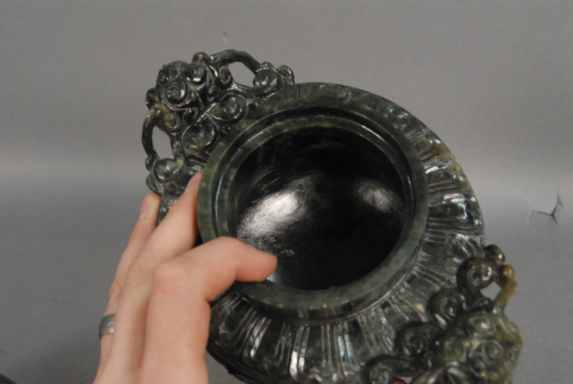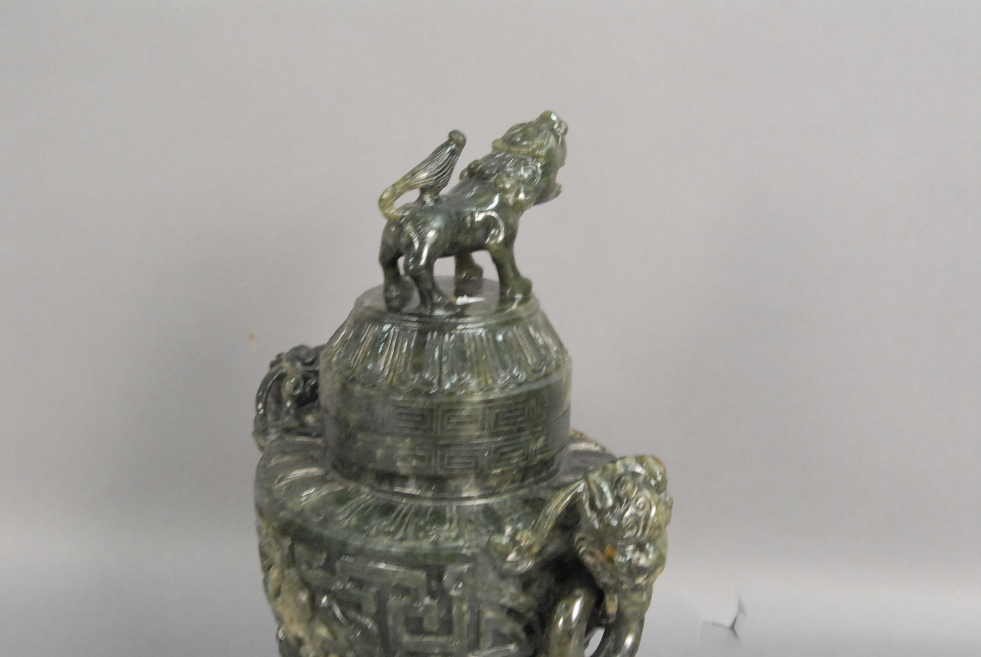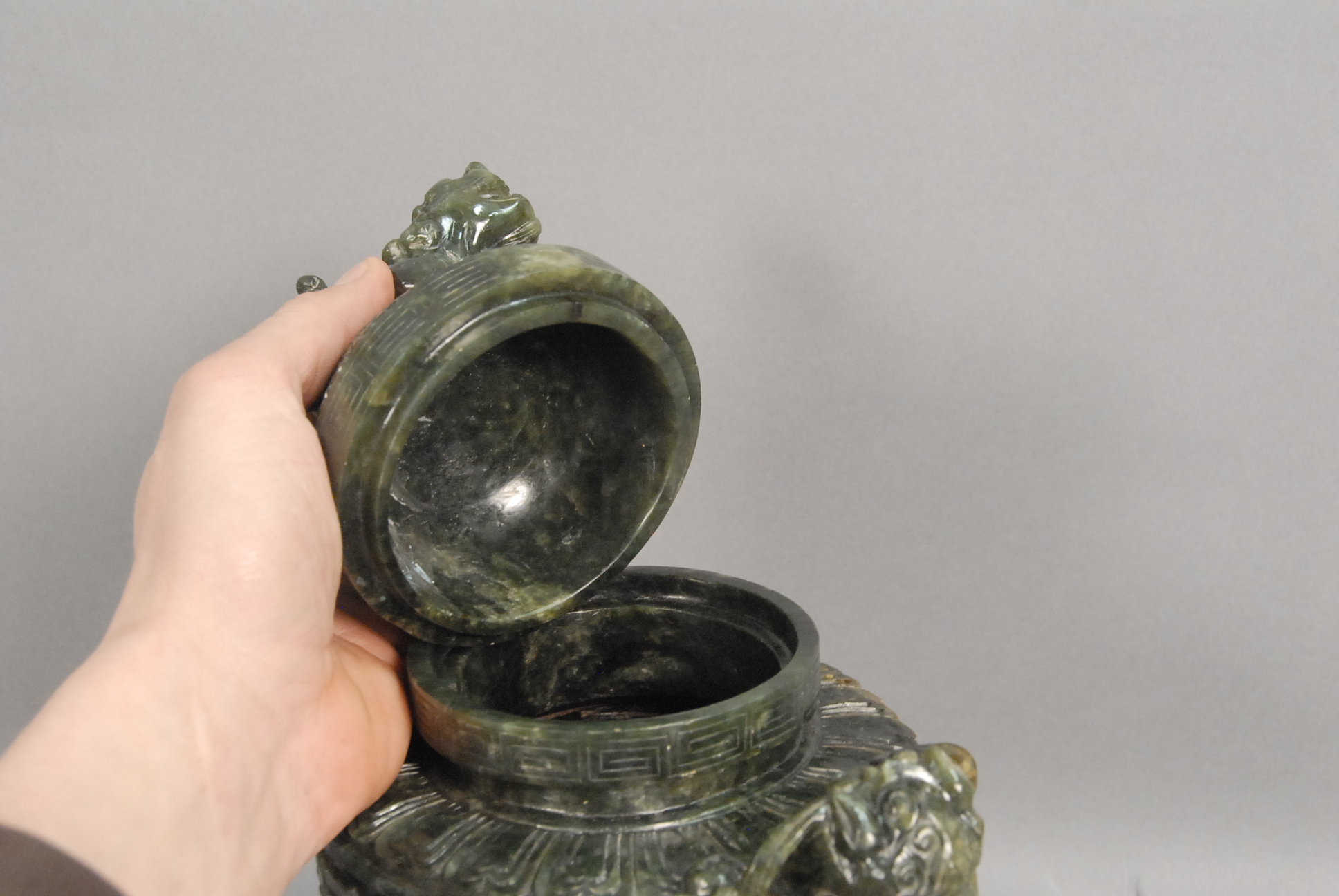Large spinach jade tripod censor having archaic style carved sides and foo dog head handles holding rings, cover mounted with foo dog finial, ht. 12, wd. 8 1/2.