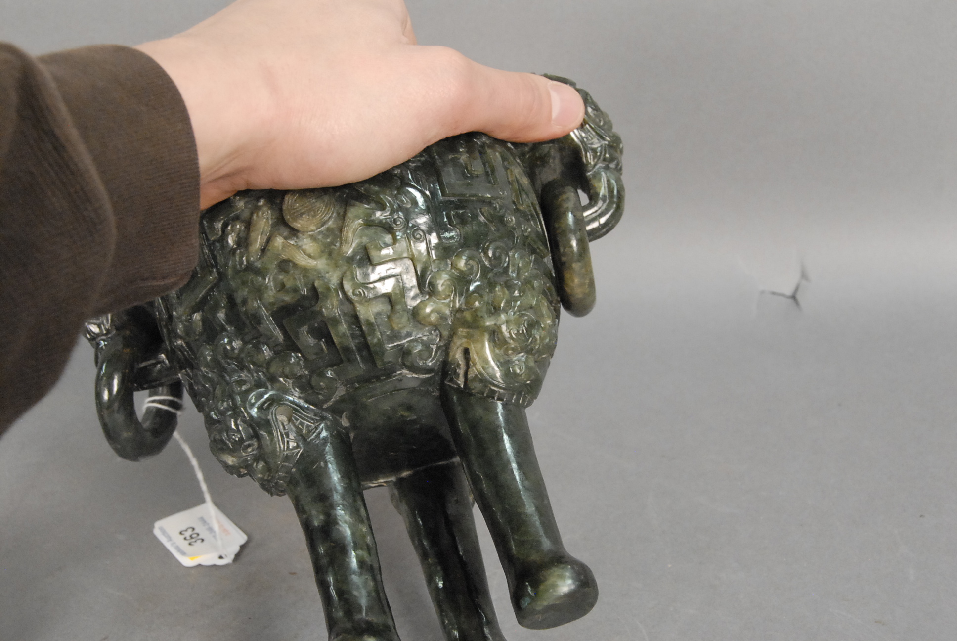 Lot 363: Large spinach jade tripod censor having archaic style carved sides and foo dog head handles holding rings, cover mounted with foo do…