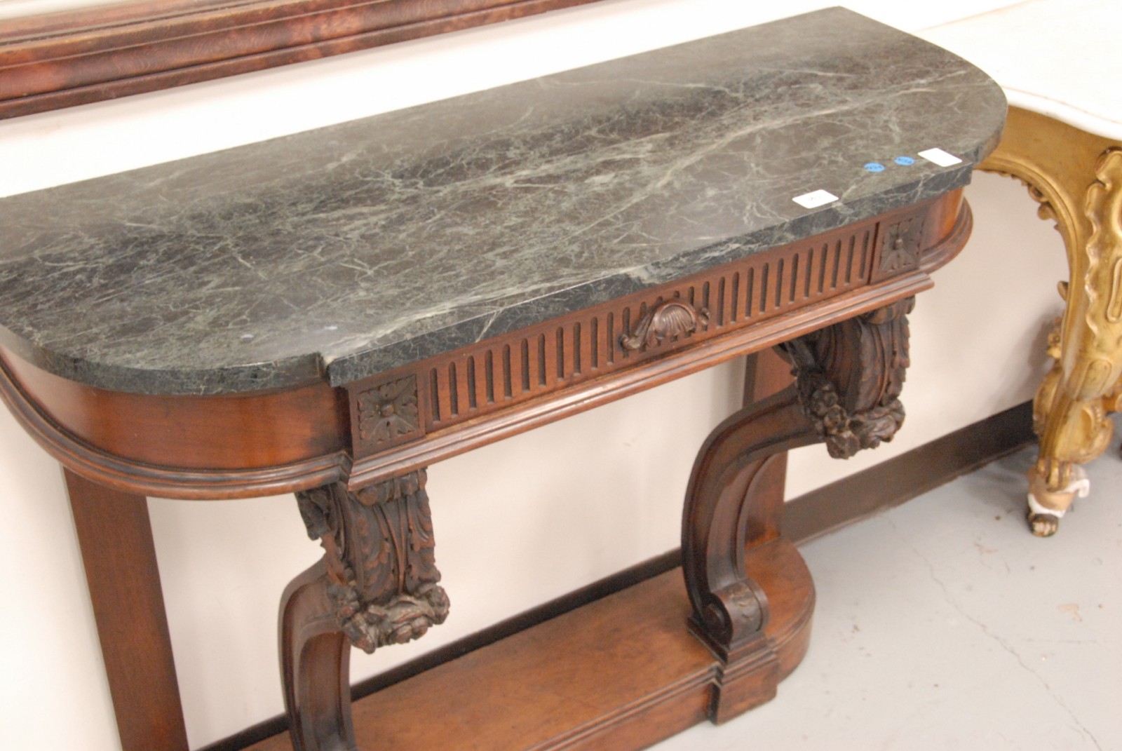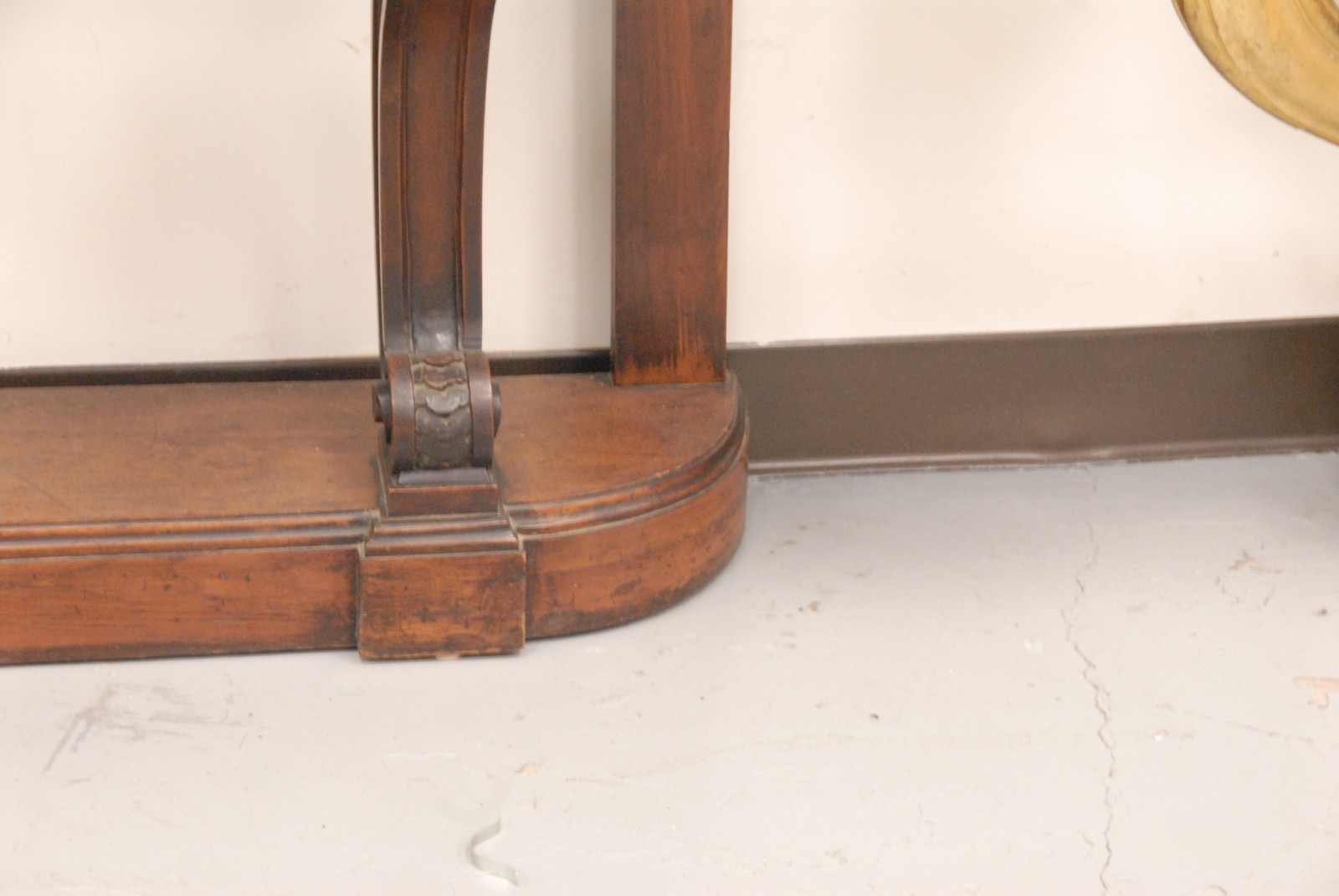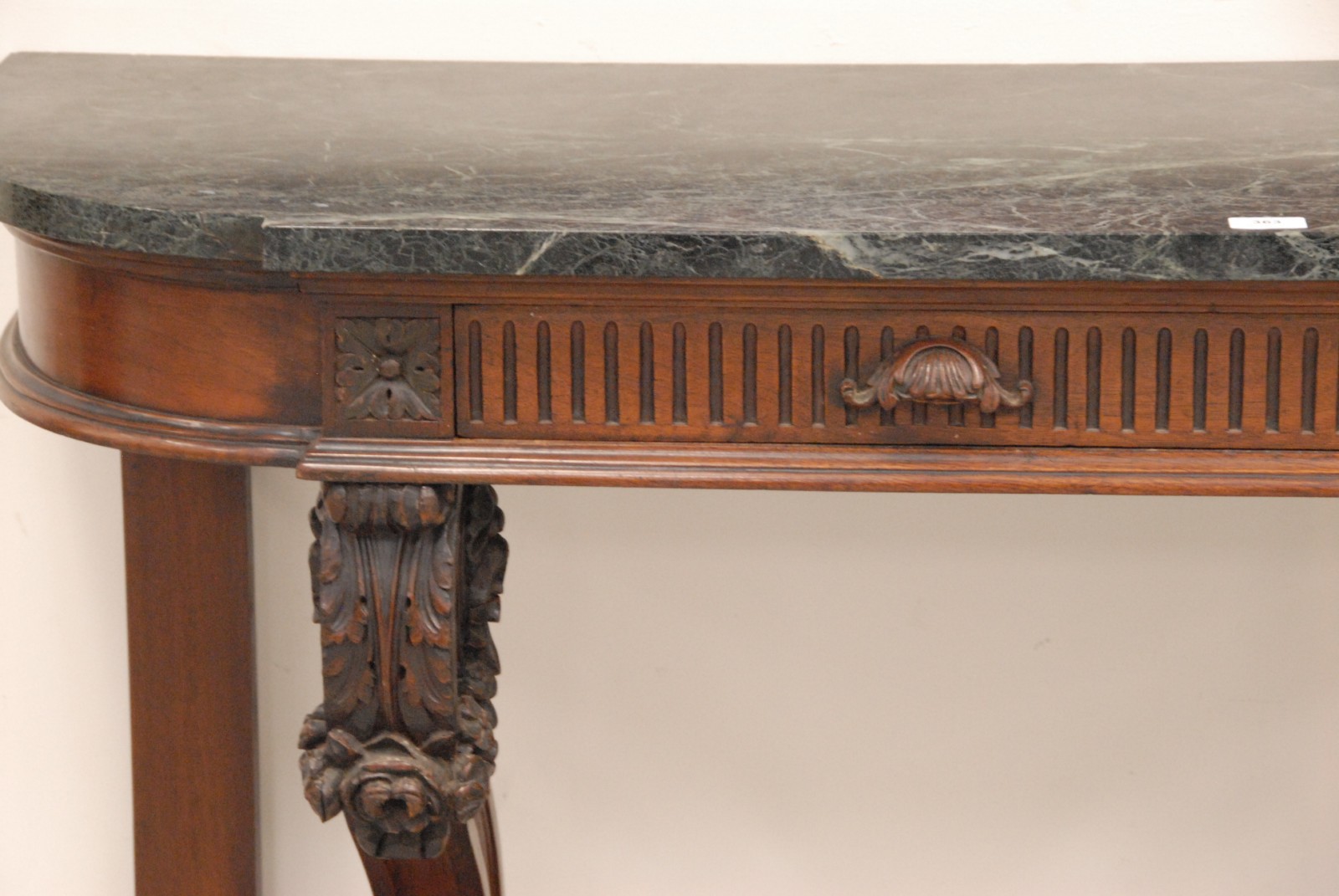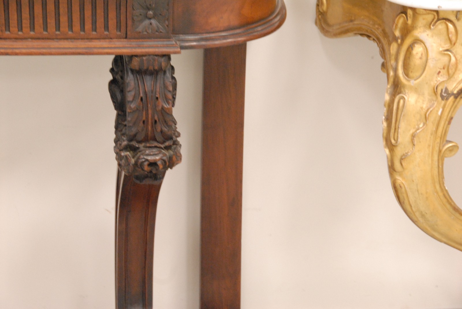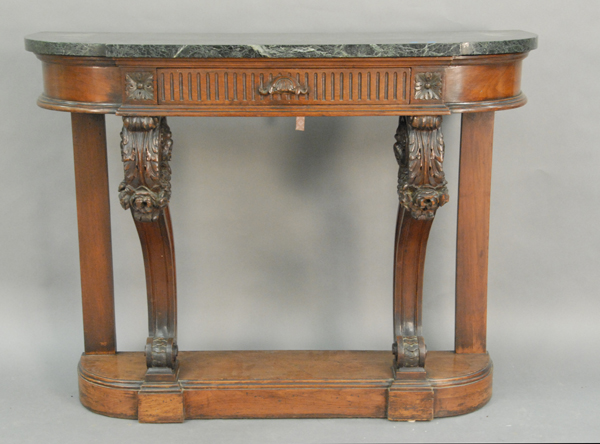 Mahogany marble top pier table with drawer and carved supports circa 1900.