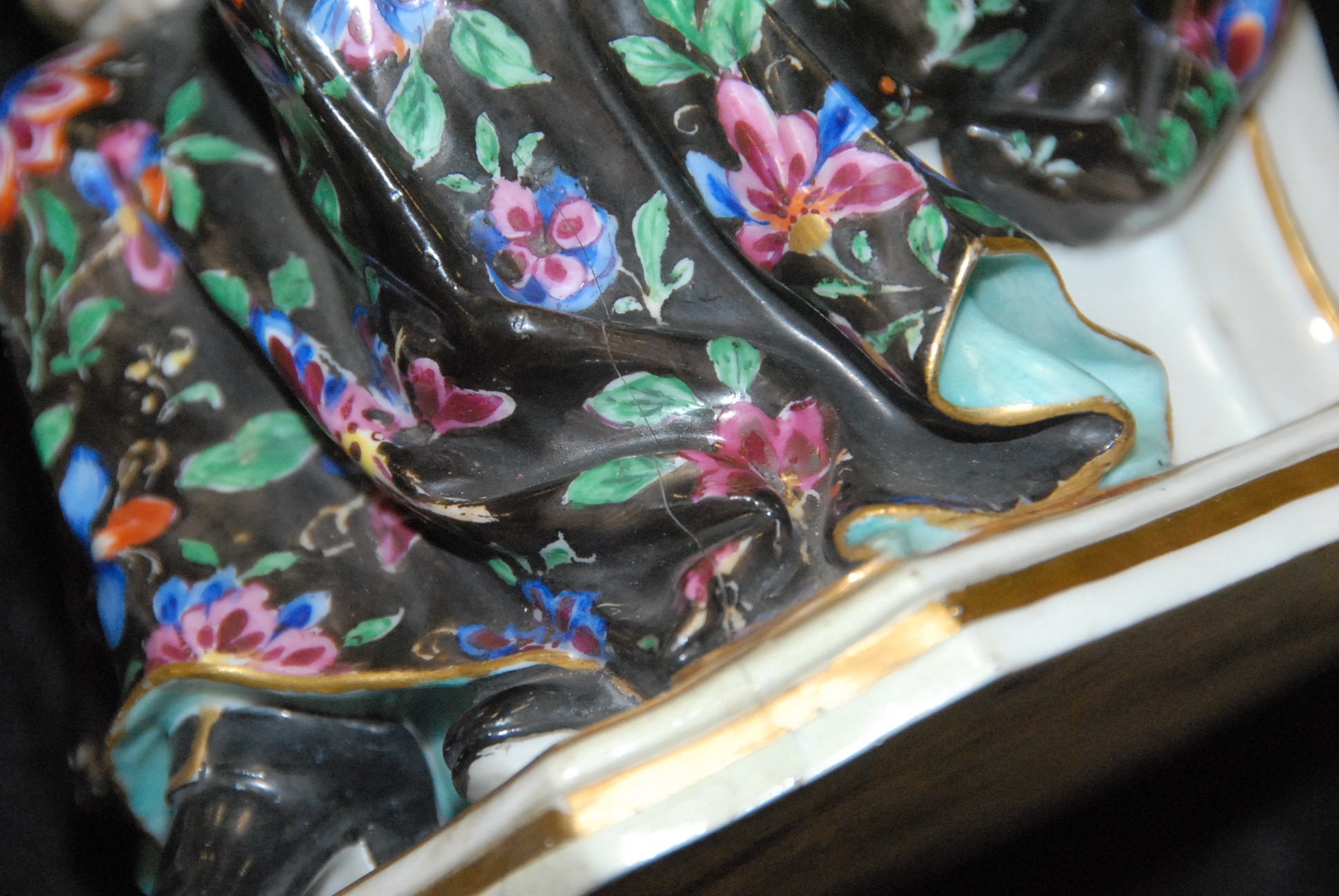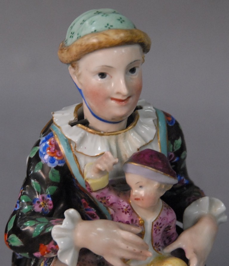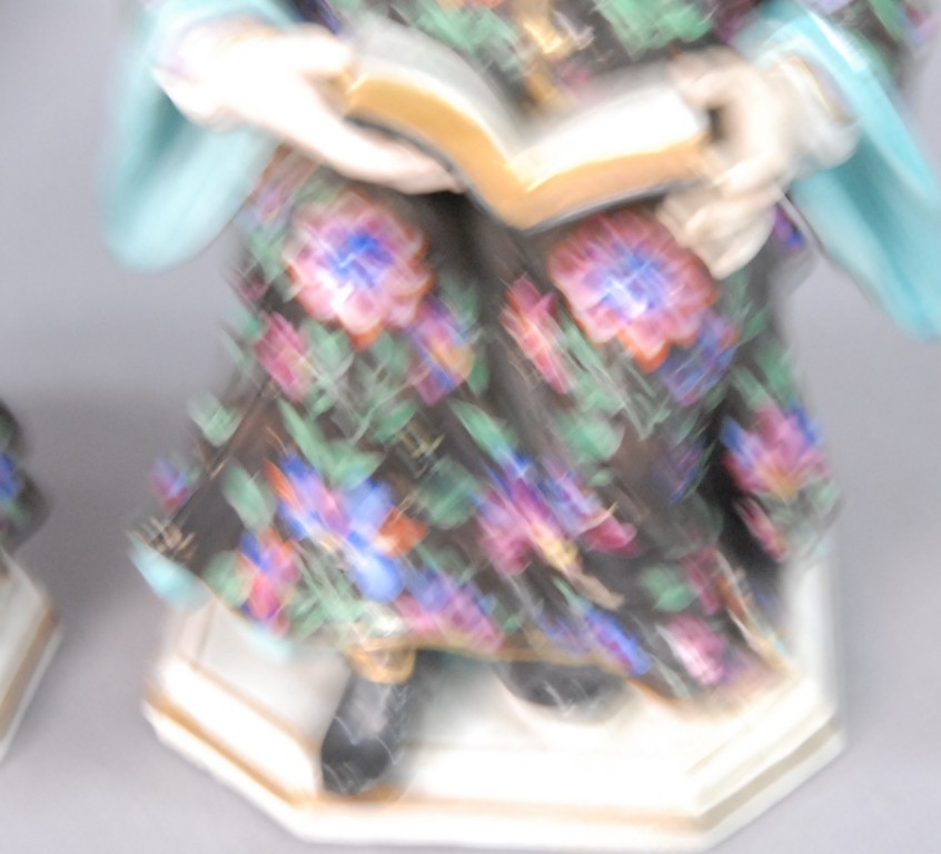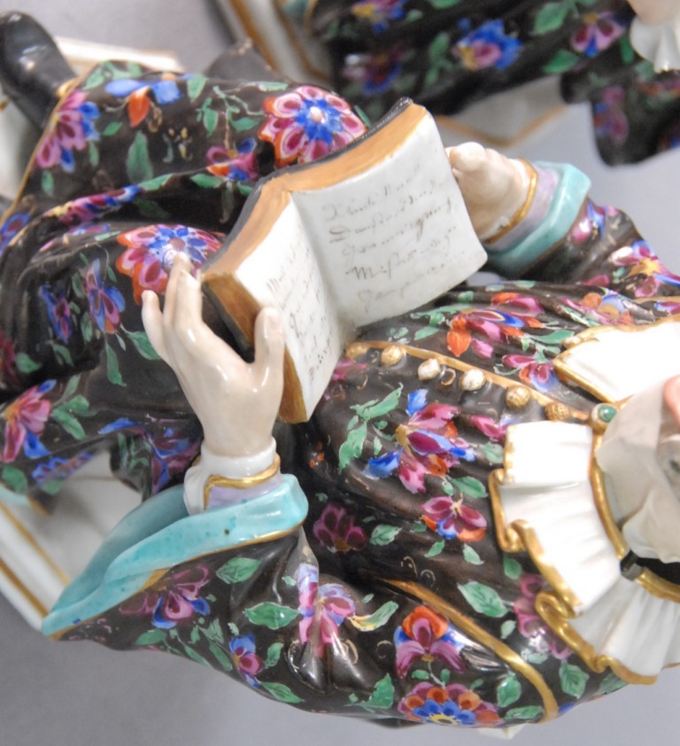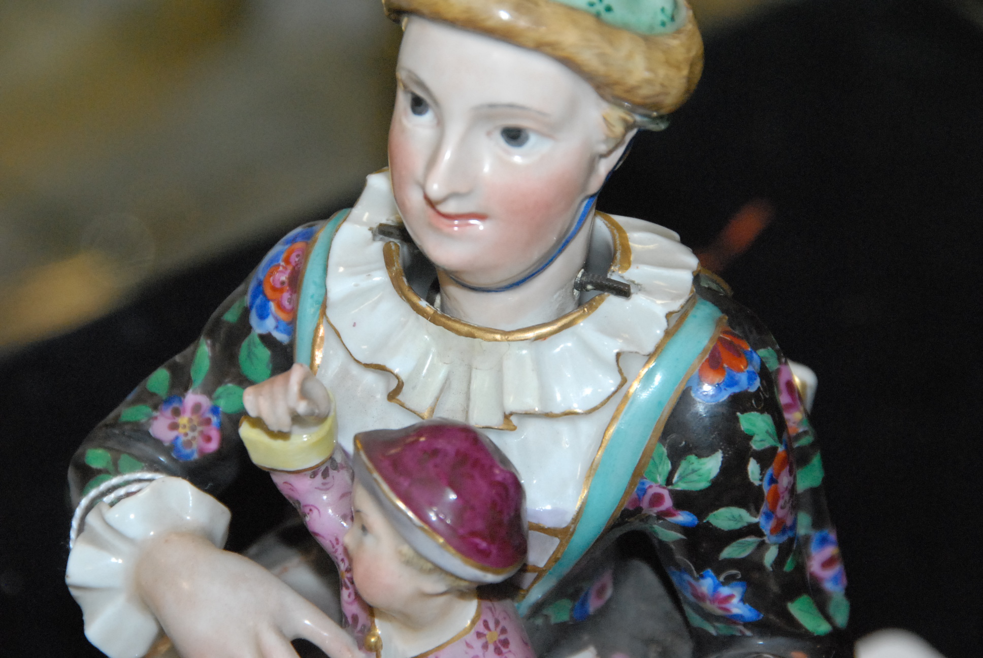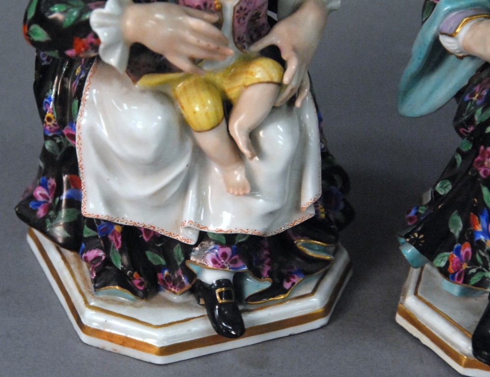 Pair of Meissen nodders of a preacher and his wife, probably 18th – 19th century, he is reading a book and she is holding a child on her lap, each resting on hexagonal base marked with four crossed swords crack, repair, and minor chips. Height 7 3/4in.