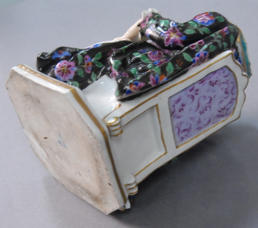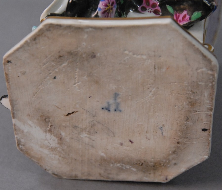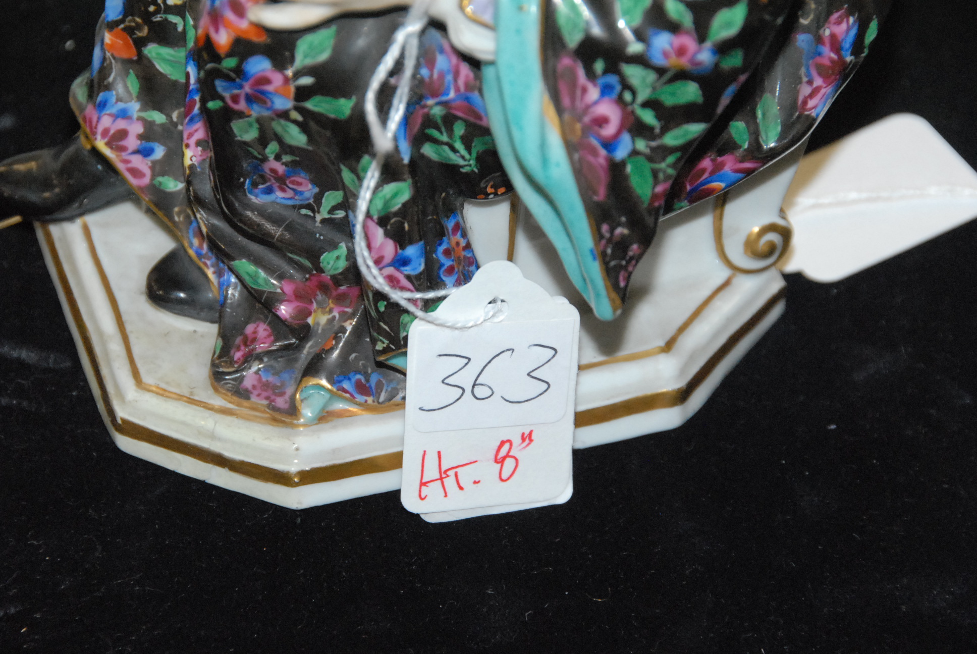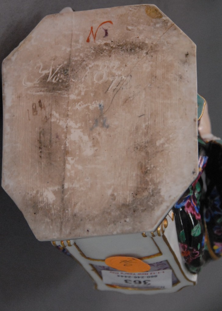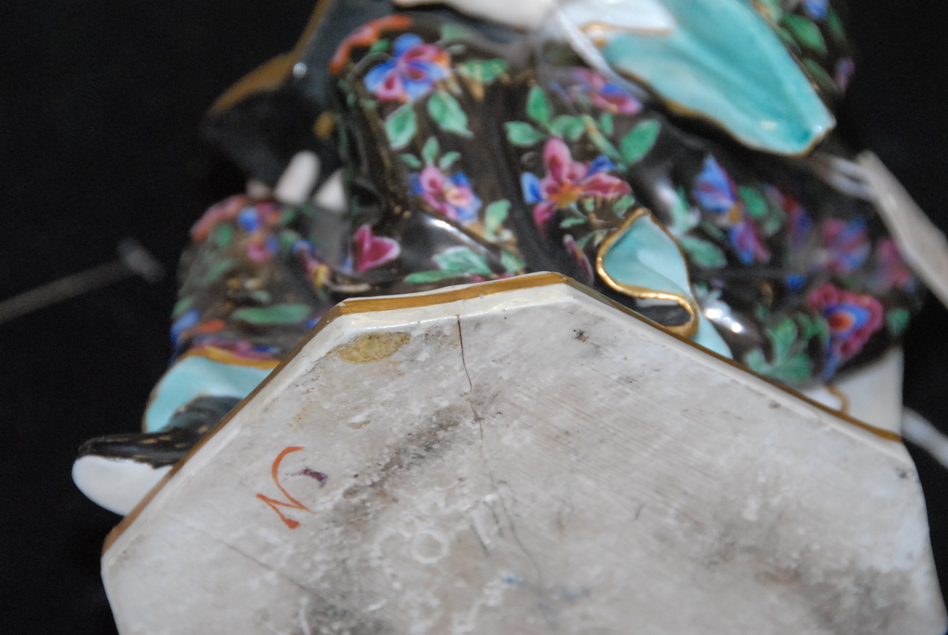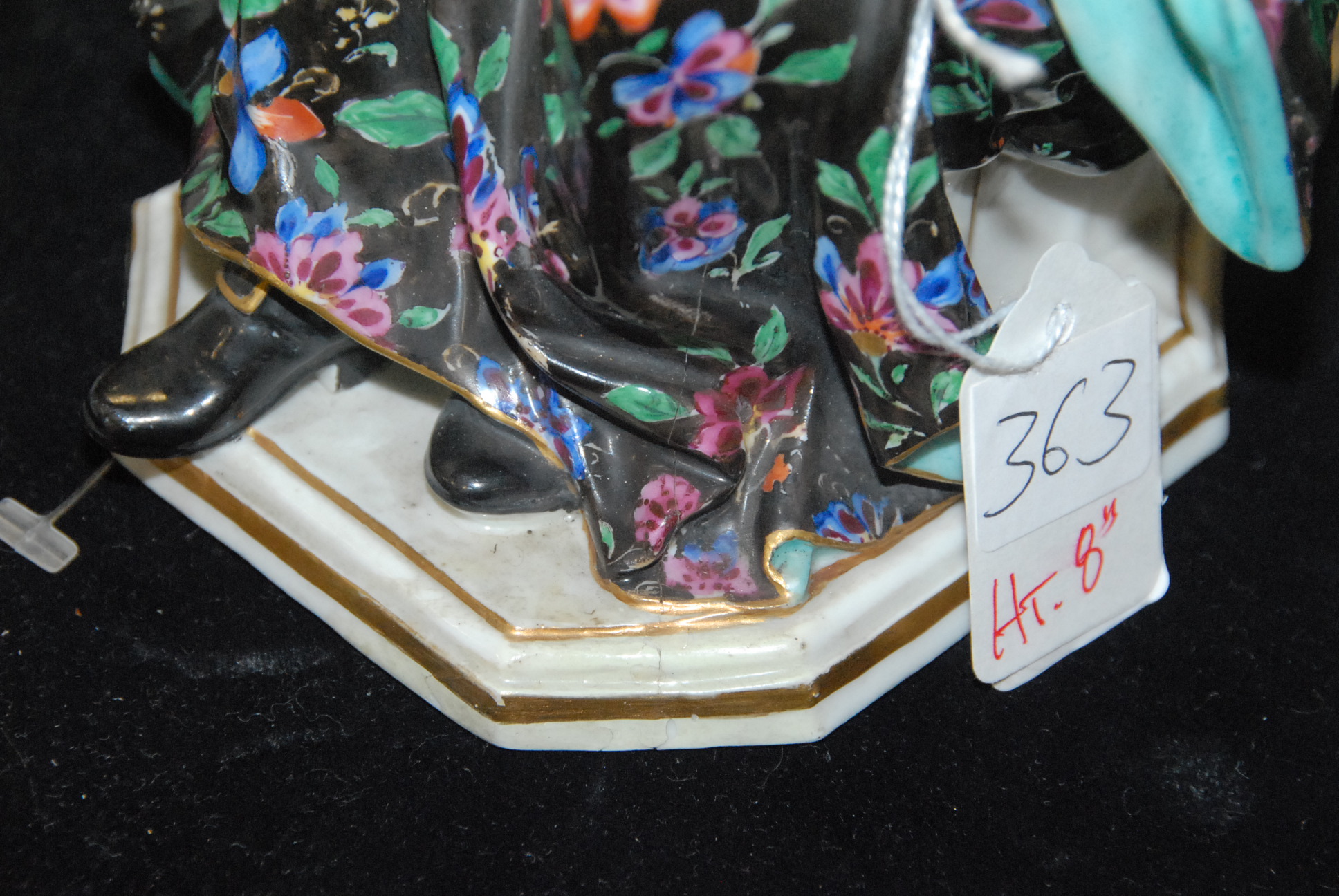 Pair of Meissen nodders of a preacher and his wife, probably 18th – 19th century, he is reading a book and she is holding a child on her lap, each resting on hexagonal base marked with four crossed swords crack, repair, and minor chips. Height 7 3/4in.