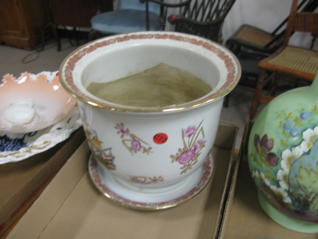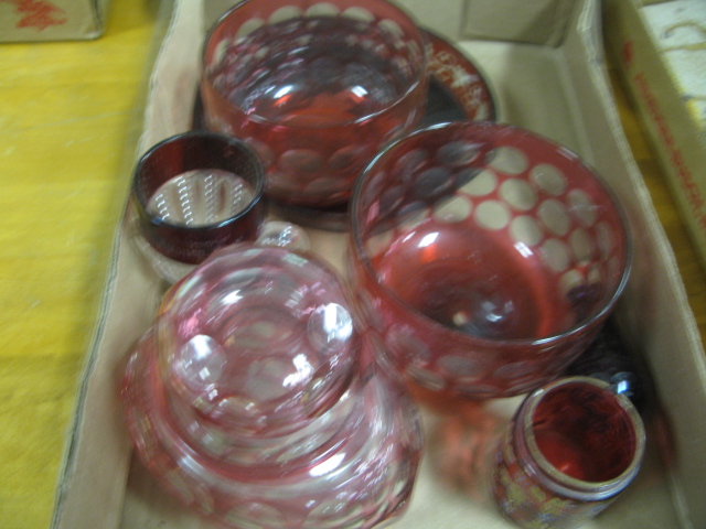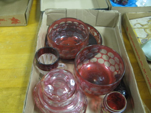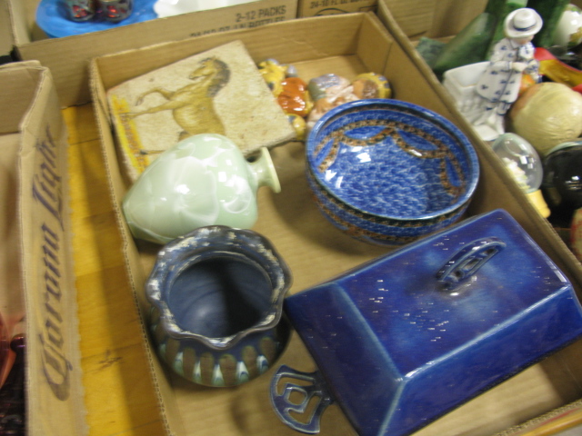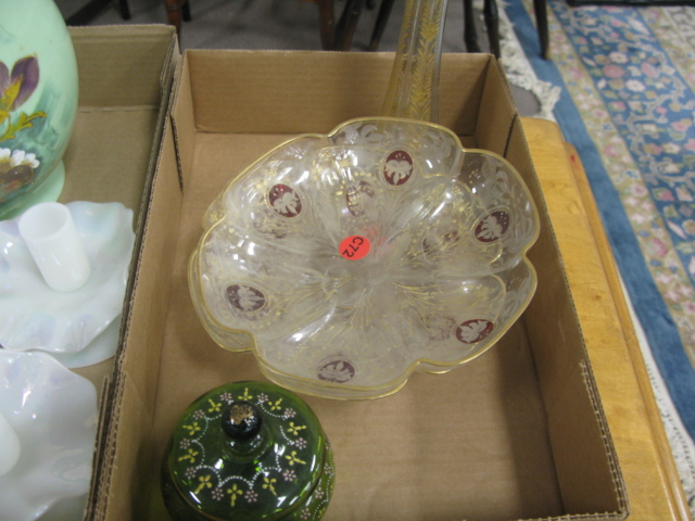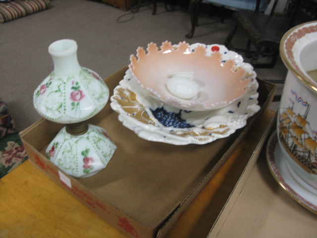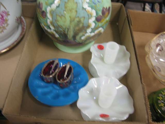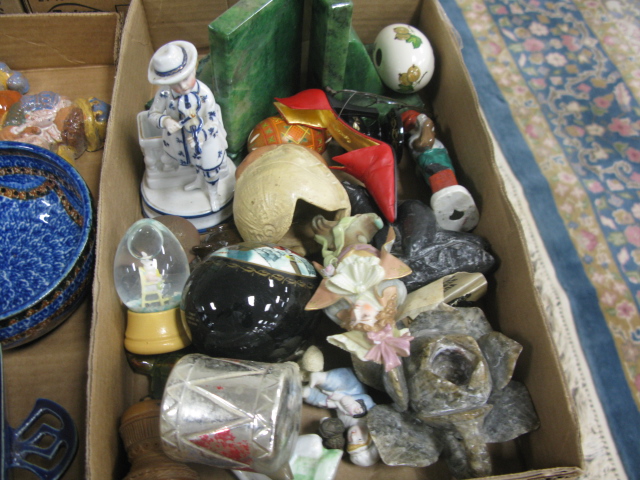 Seven box lots to include finger bowl, crystal dishes, porcelain figures, two salts, crystal glass vase and bowl, large Meissen shallow bowl leaf design and misc.