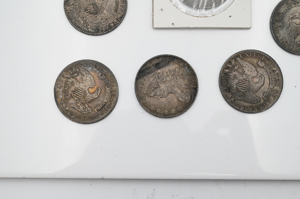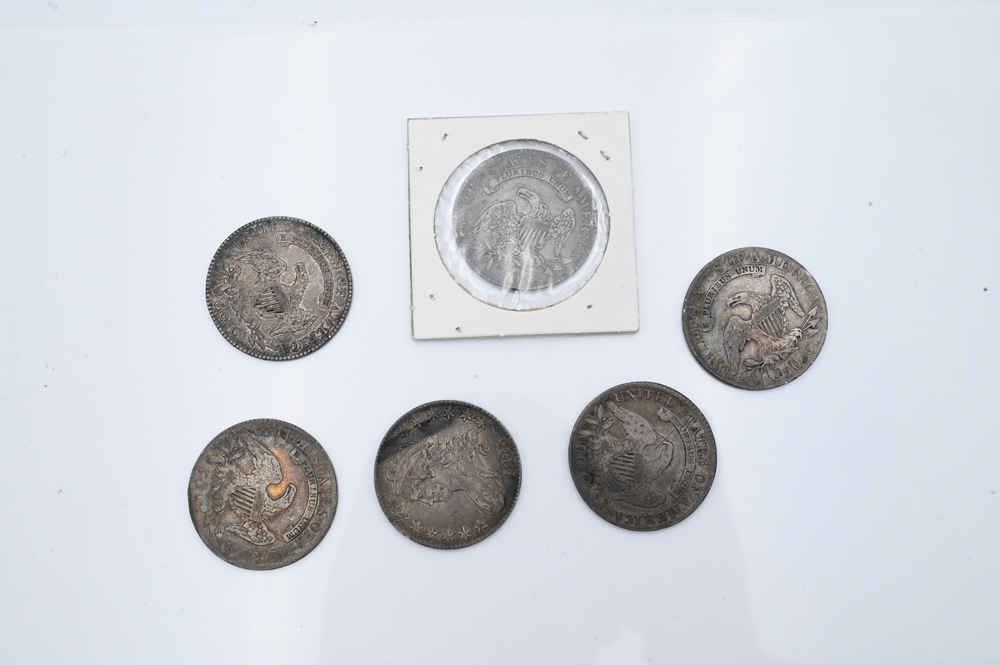 Six Capped Bust Half Dollars, 1818, 1820, 1824, 1825, along with two 1829.