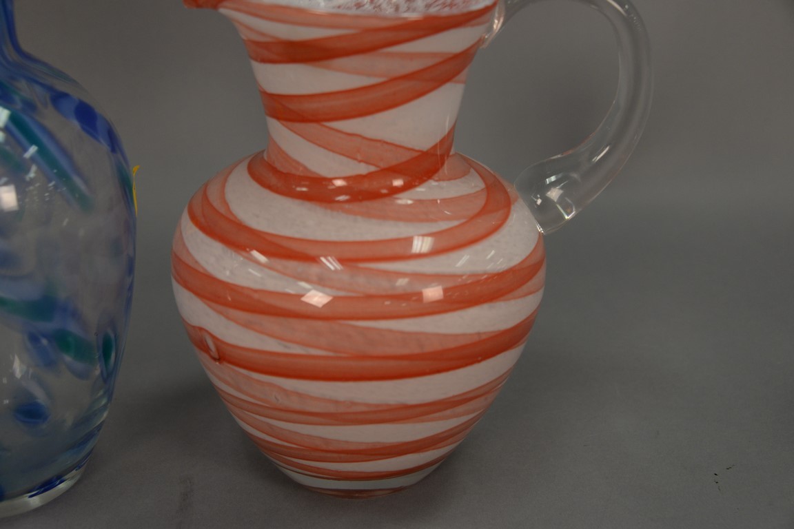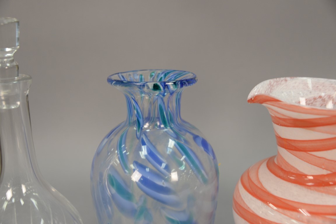 Lot 363: Three piece lot to include Waterford crystal decanter, blue and clear art glass vase, and an art glass pitcher. ht. 9 1/2in. to 12 1…