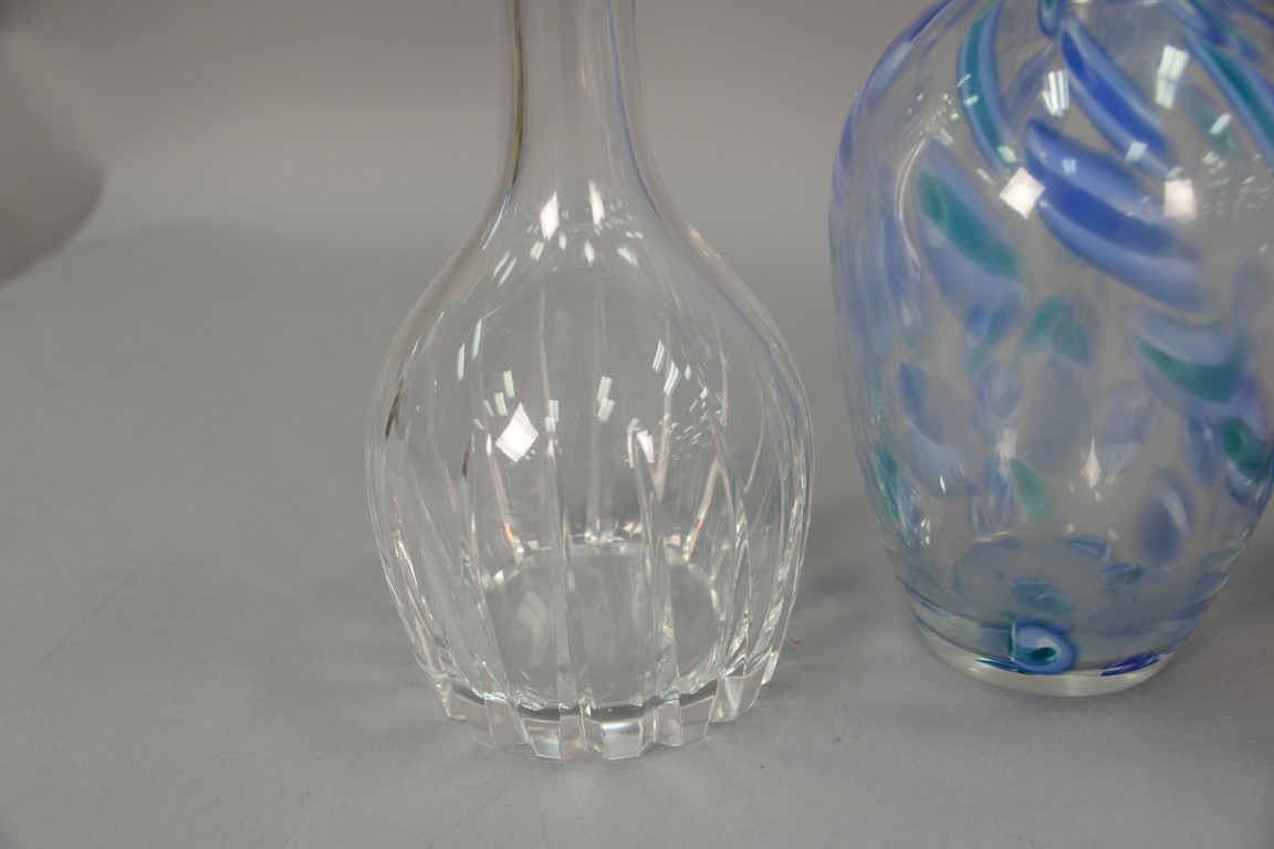 Three piece lot to include Waterford crystal decanter, blue and clear art glass vase, and an art glass pitcher. ht. 9 1/2in. to 12 1/2in. Provenance: Estate of Arthur C. Pinto, MD