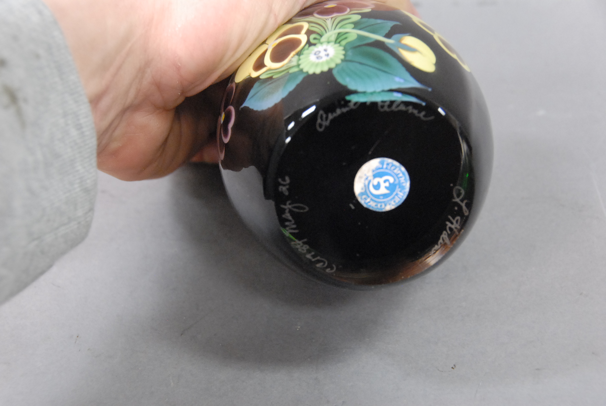 Two art glass vases to include an Orient and flume vase pansy 1985, L. Hadin and an acid etched vase.