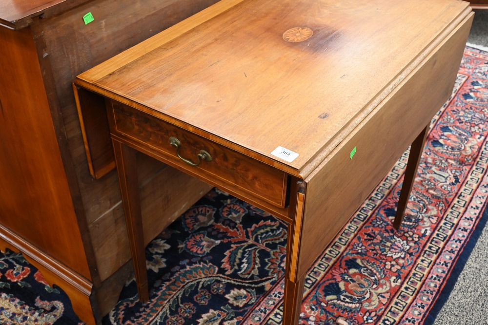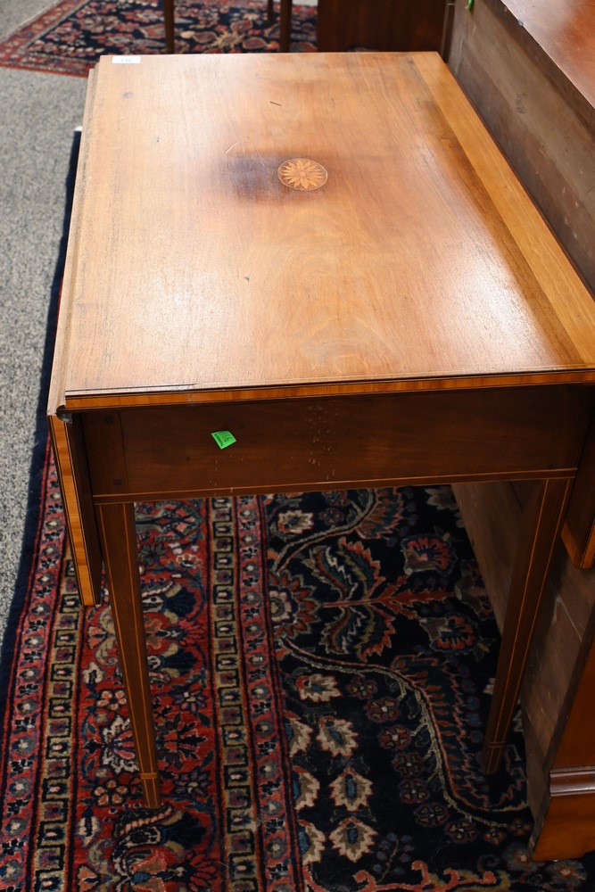 Lot 364: Federal Mahogany Pembroke Table having a drawer on inlaid square tapered legs, top with oval floral inlay circa 1800 sunbleached height 28 1/2 inches, top closed 20 x 32 inches Provenance: Fifty Year Personal Collection of Clocks and American Antiques from Thomas Bailey, Manchester, Connecticut.