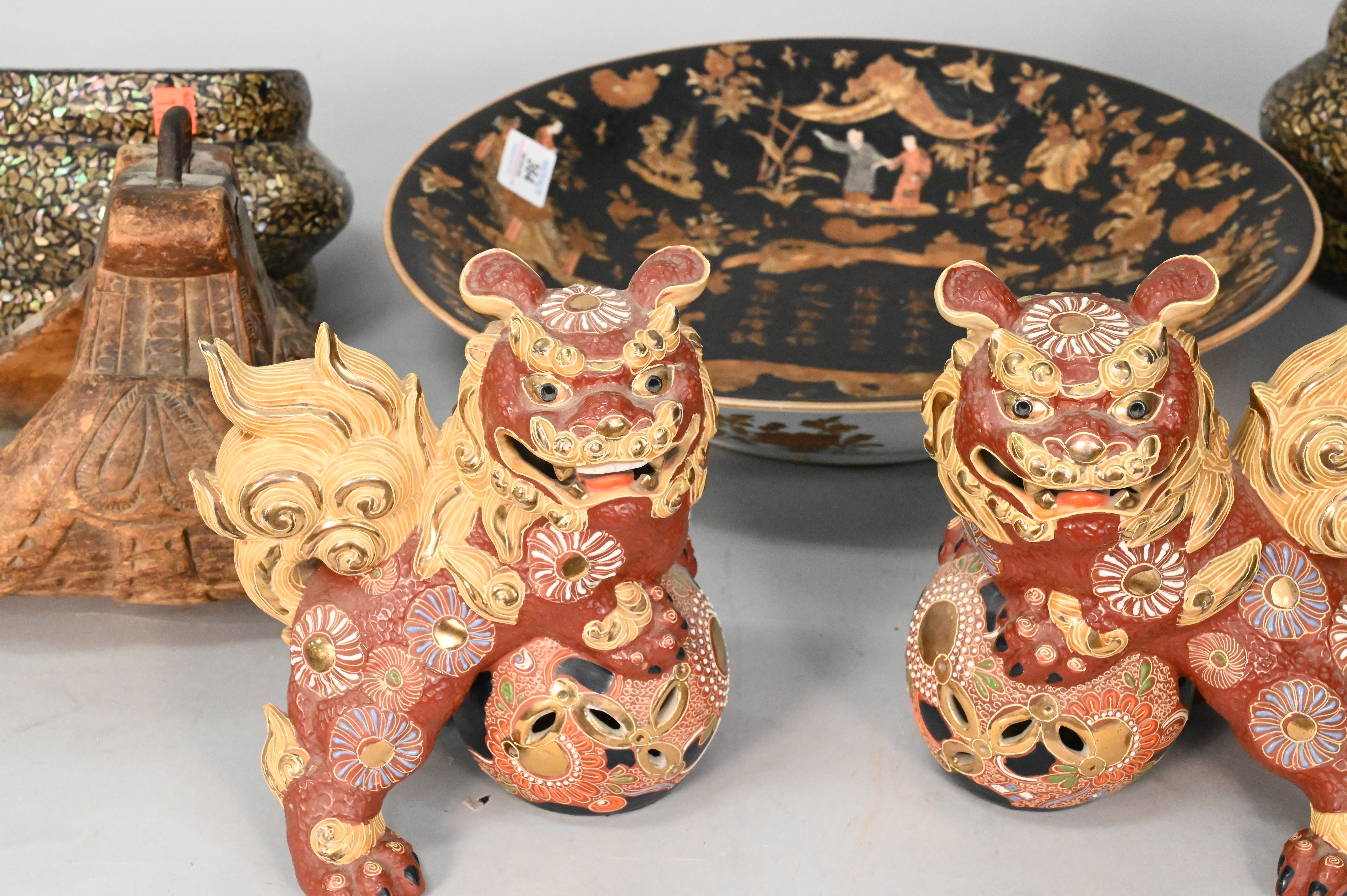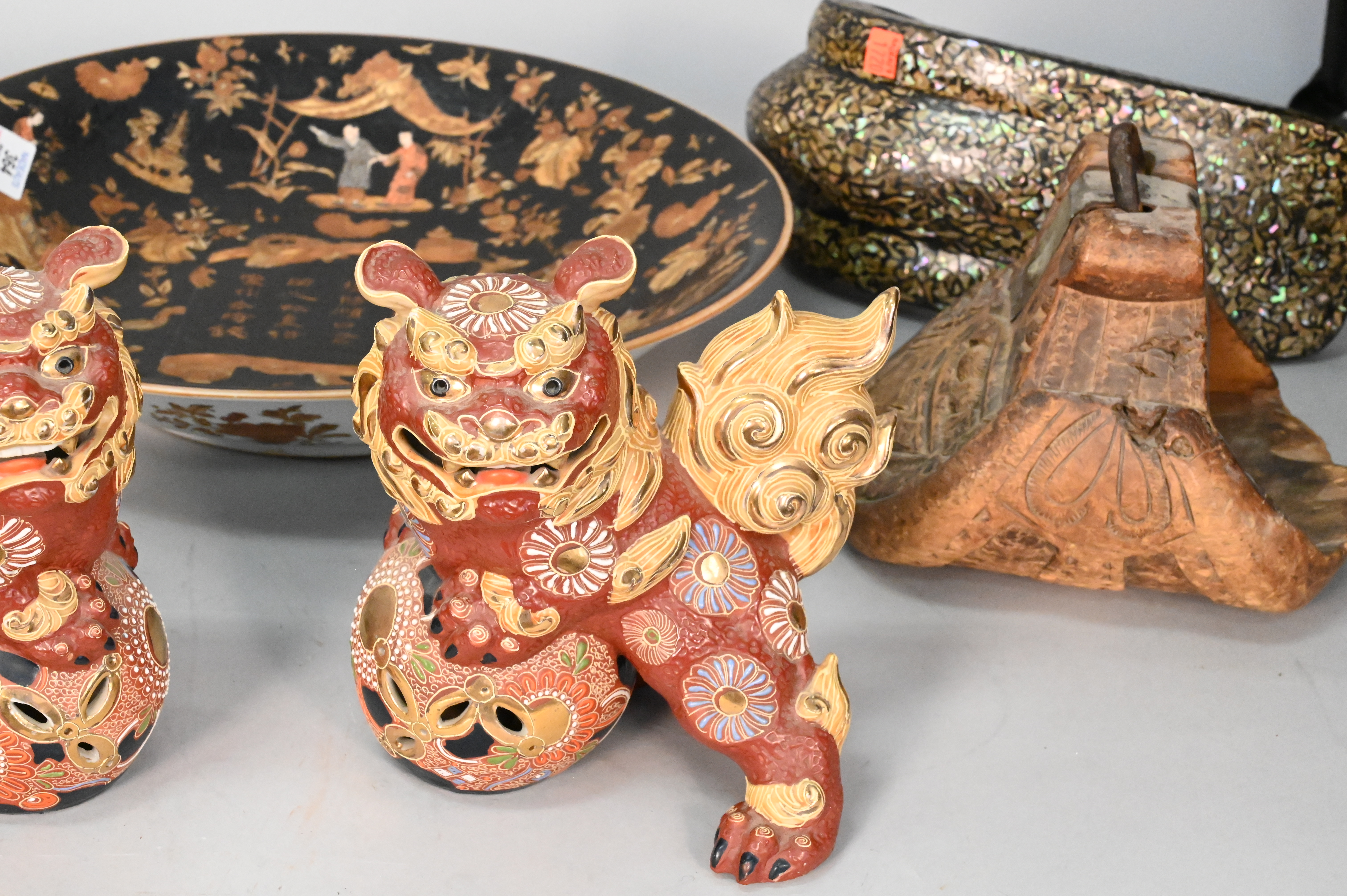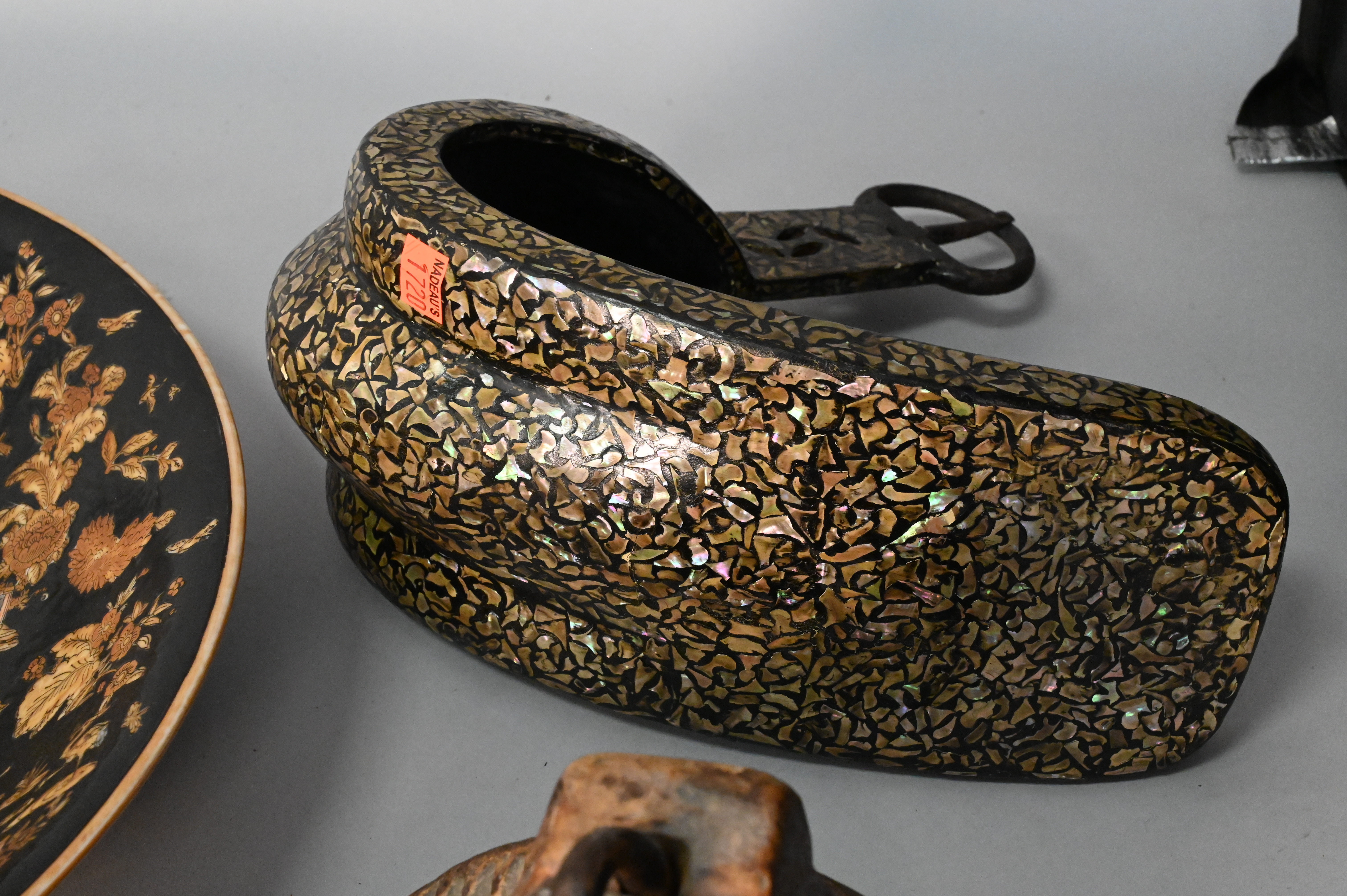 Five Piece Asian Grouping, to include two pairs of stirrups, one of Spanish style wood carved and iron, the other of Japanese Edo style “Abumi” with mother of pearl inlay, largest approximately 12 inches, along with a three piece Asian grouping to include a pair of red and gilt ceramic foo lions, having character on the bottom, and a large charger with twenty characters in center, diameter 16 inches.