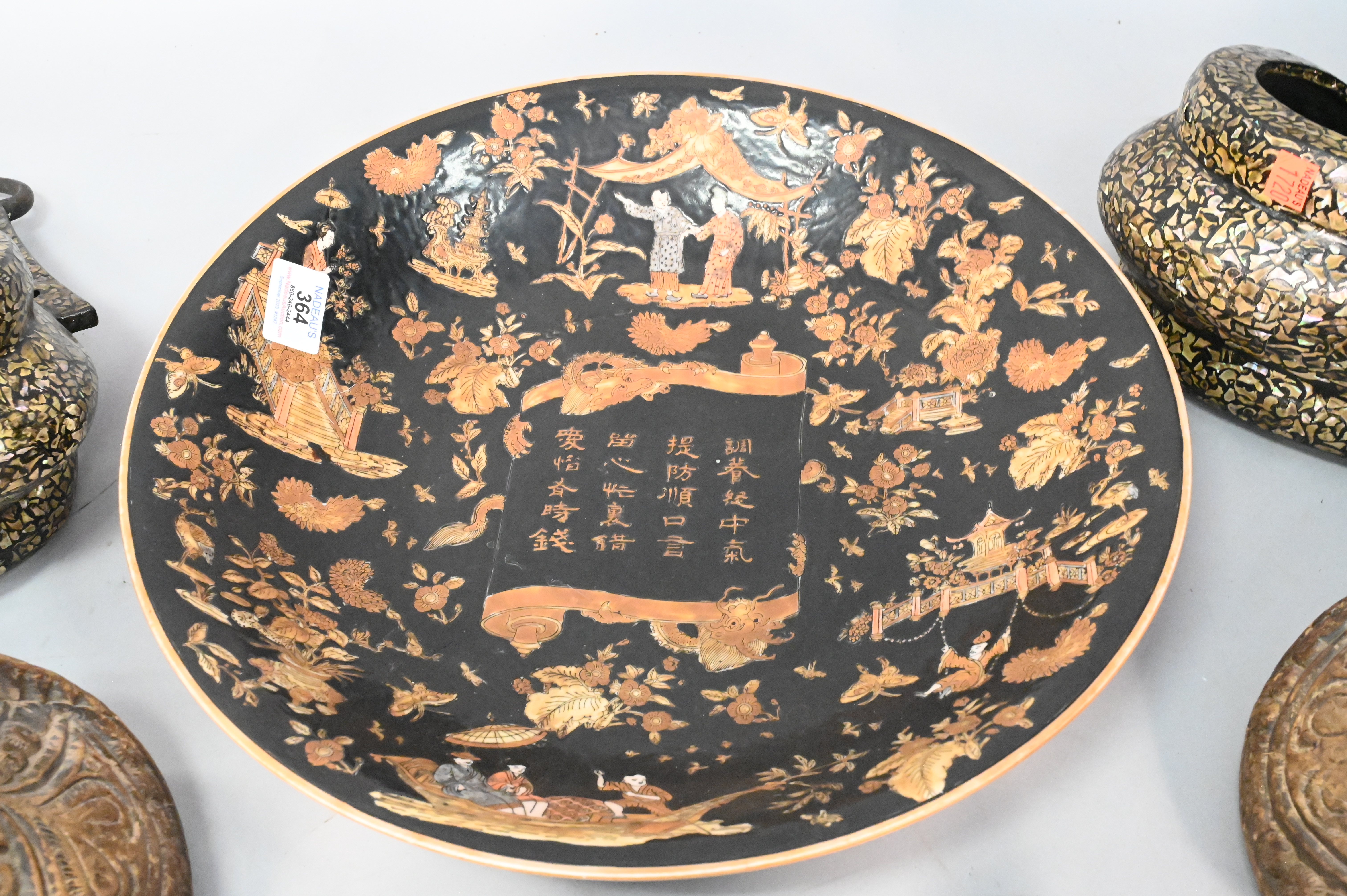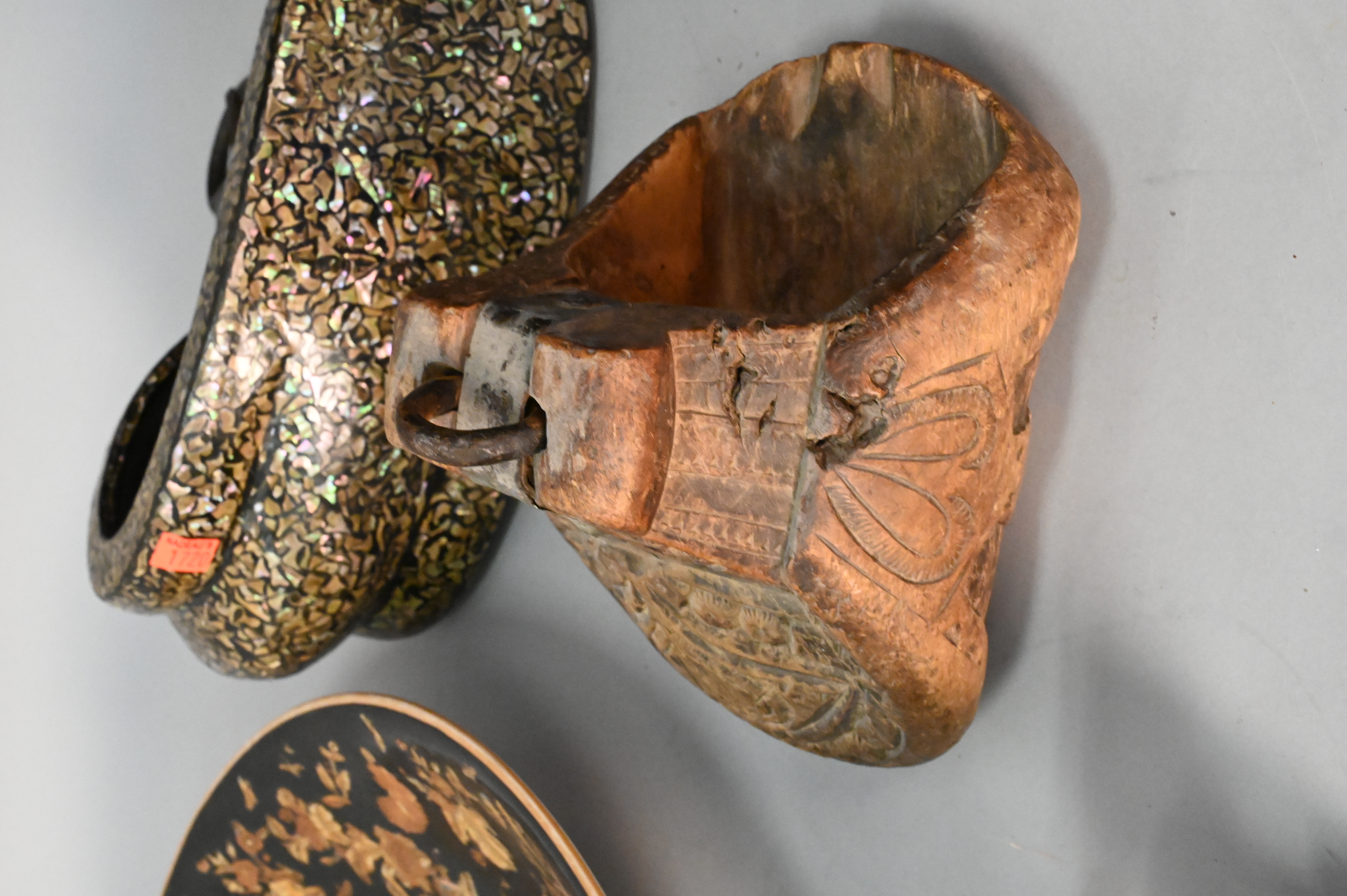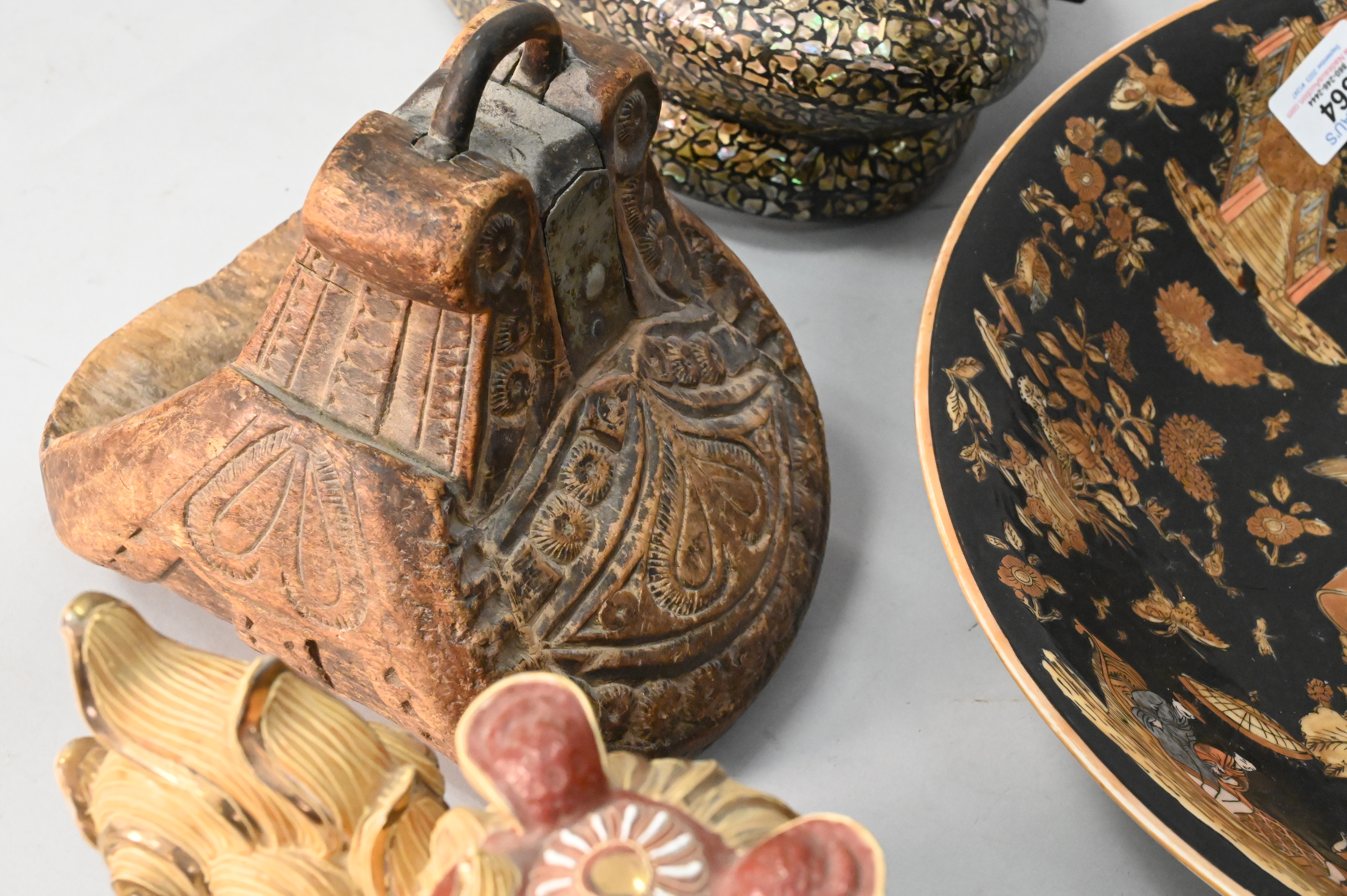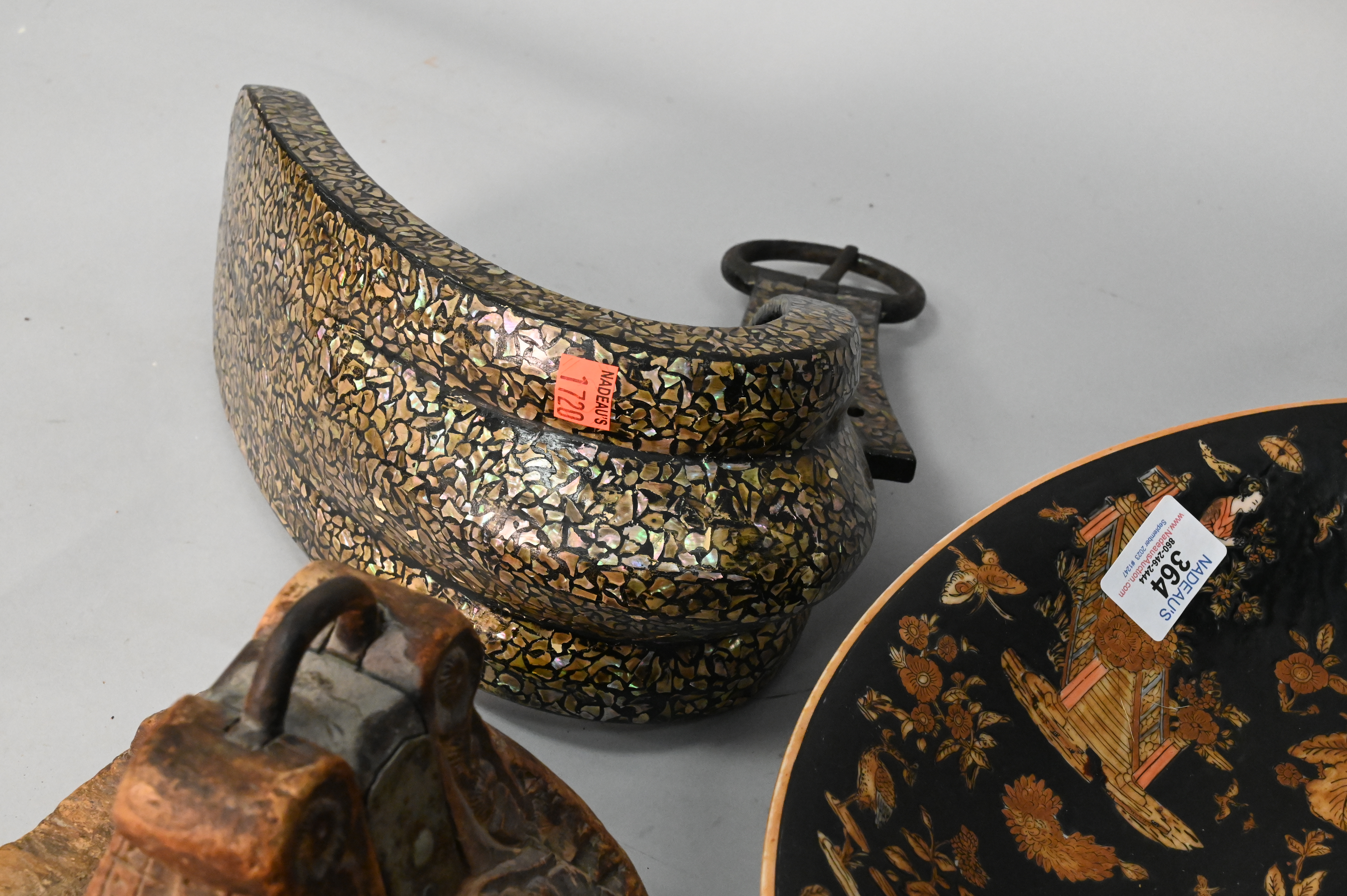 Five Piece Asian Grouping, to include two pairs of stirrups, one of Spanish style wood carved and iron, the other of Japanese Edo style “Abumi” with mother of pearl inlay, largest approximately 12 inches, along with a three piece Asian grouping to include a pair of red and gilt ceramic foo lions, having character on the bottom, and a large charger with twenty characters in center, diameter 16 inches.