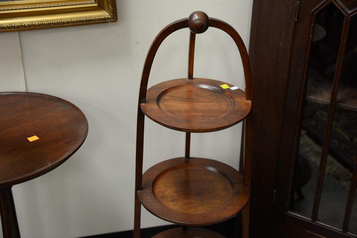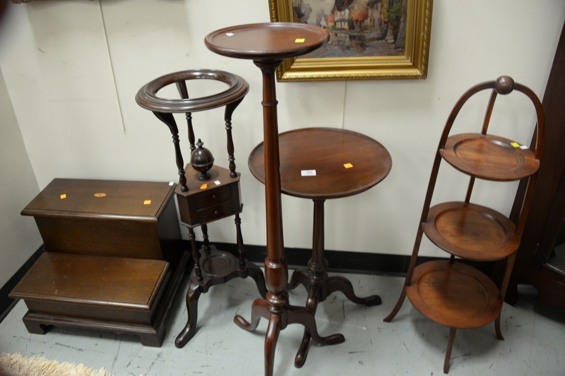 Five piece lot to include pedestal ht. 40 in., candlestand, muffineer stand, and bedstairs.