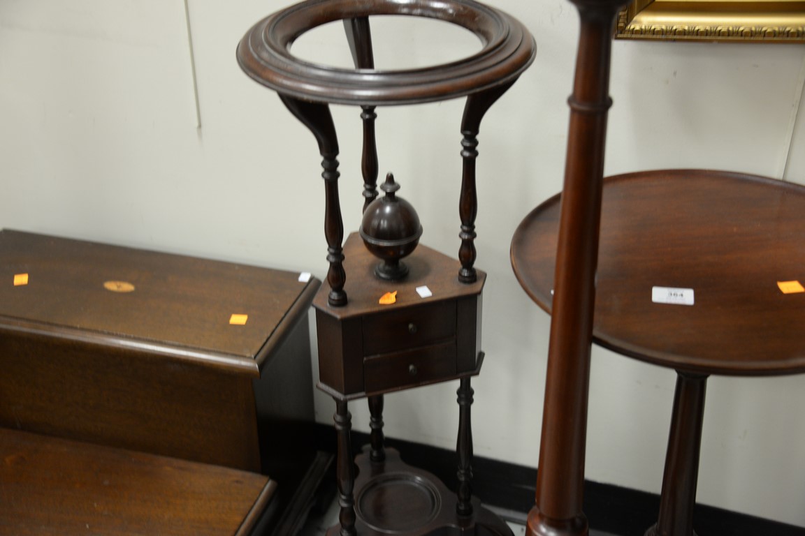 Lot 364: Five piece lot to include pedestal ht. 40 in., candlestand, muffineer stand, and bedstairs.