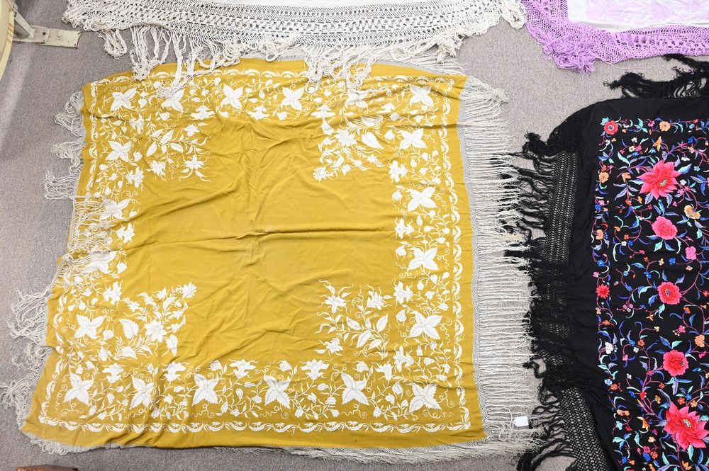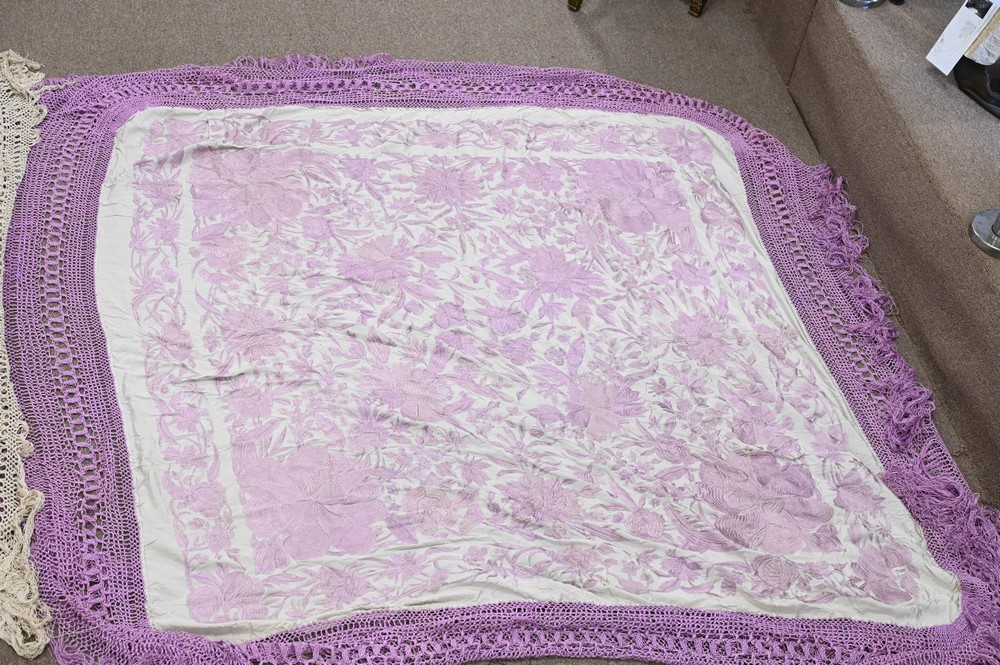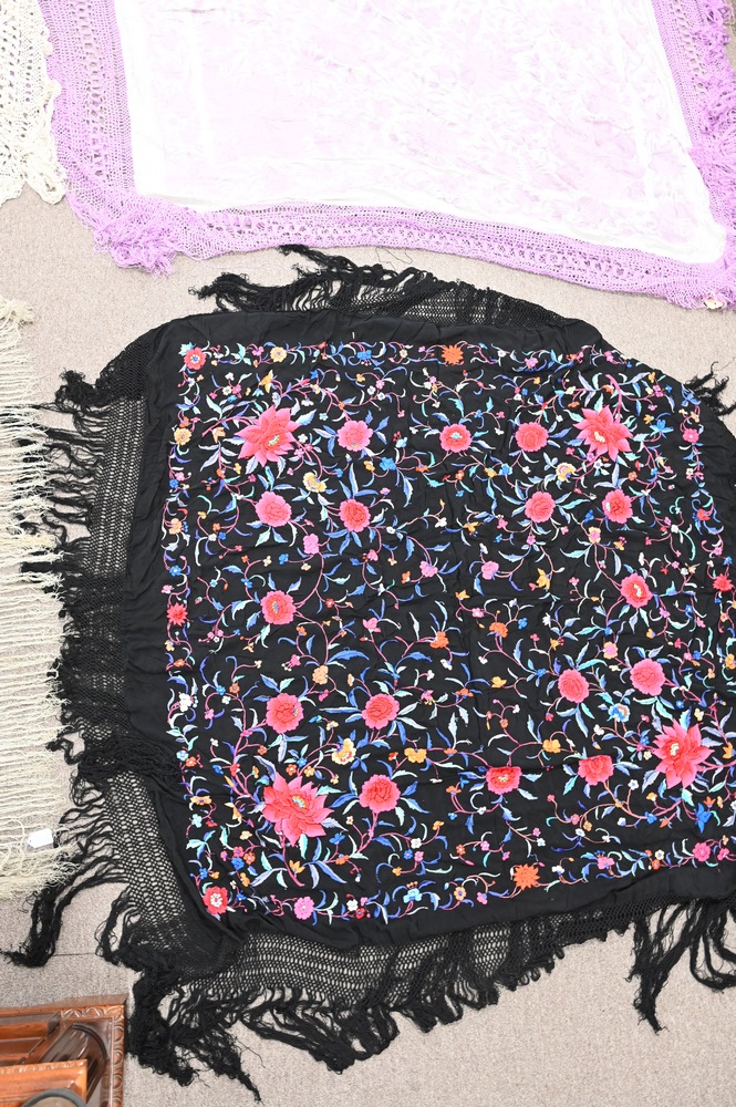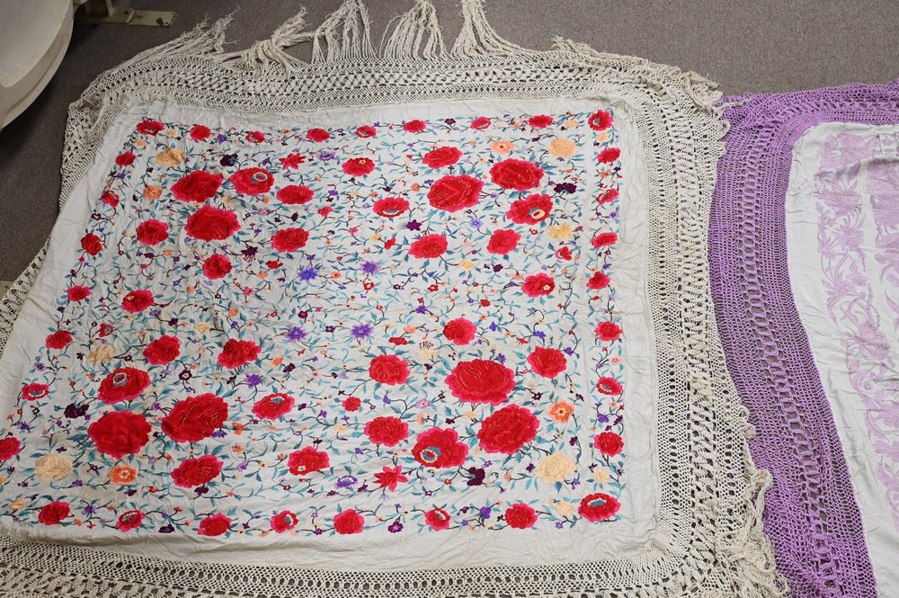 Lot 364: Four Chinese Silk Embroidered Piano Shawls, in various colors, approximate dimensions 5′ x 5′; 5′ 5″ x 5′ 5″; 6′ 4″ x 6′ 7″; 6′ 1″ x…