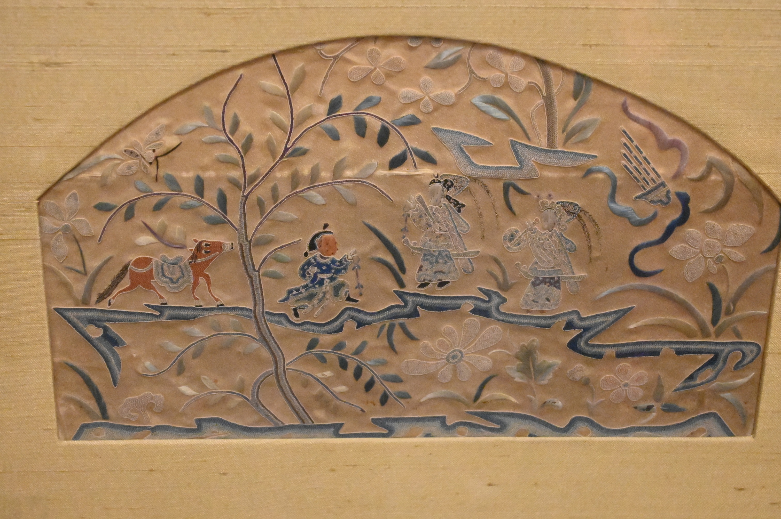Chinese arched embroidered panel having horse and people in a landscape Kong Hsi style