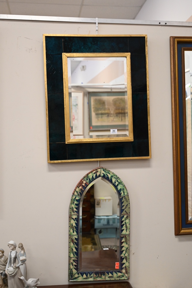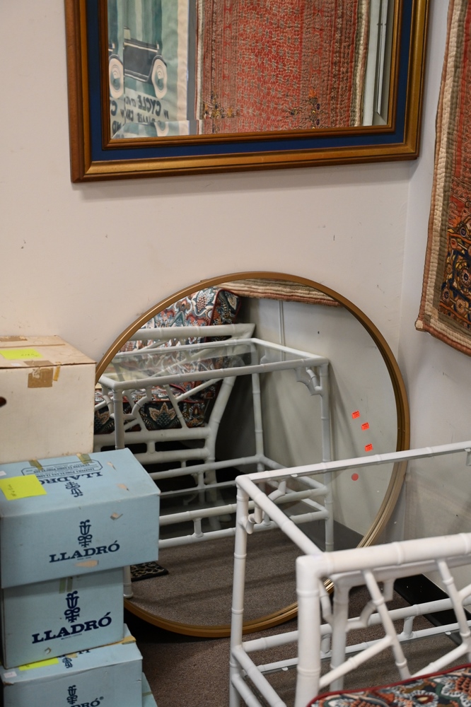 Lot 364: Four Piece Lot of Mirrors, to include one round mirror, two rectangular mirrors, along with one having ceramic tile surround, diameter 36 inches.