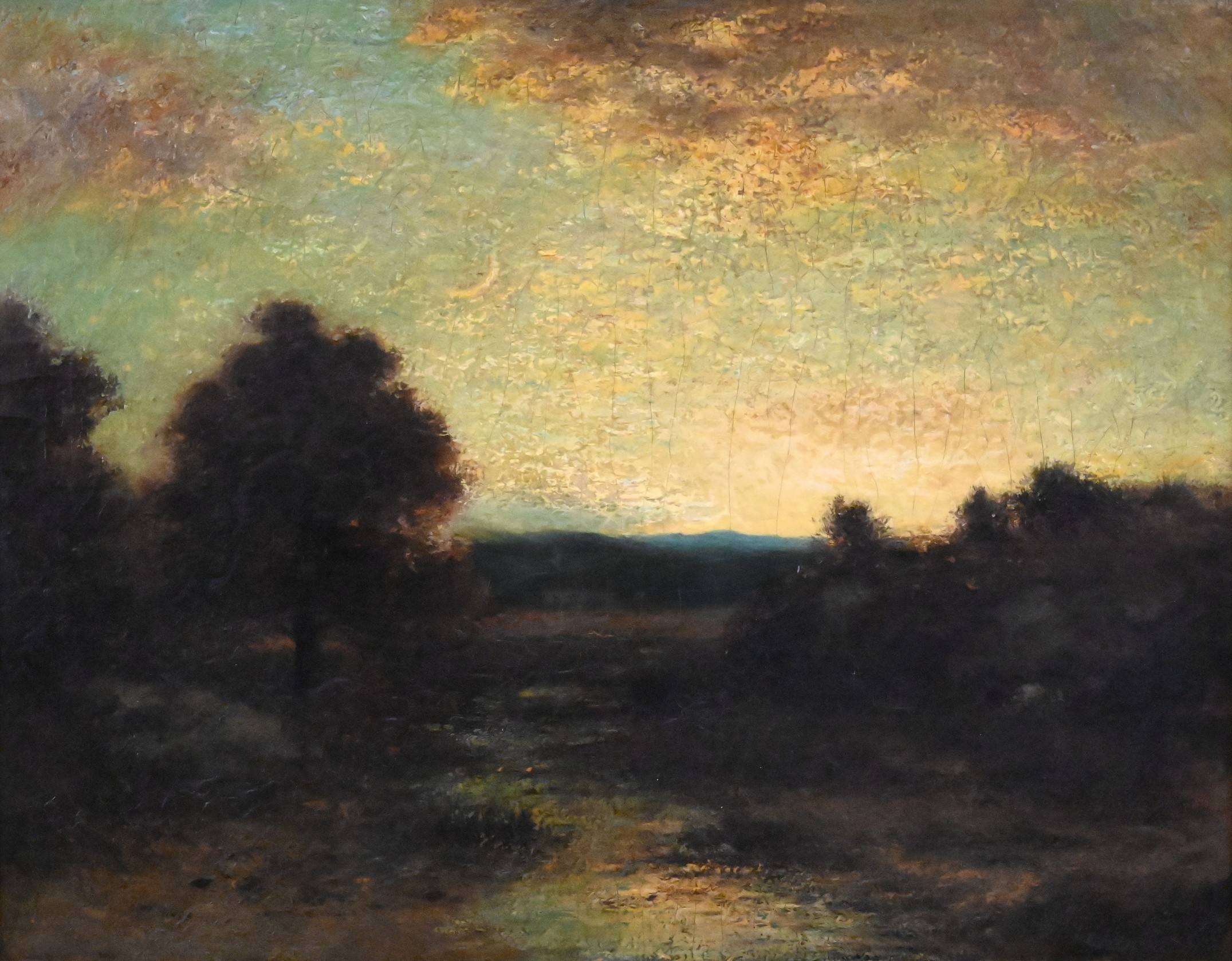 Oil on canvas tonalist landscape depicting a wooded scene with tall trees silhouetted against a luminous golden sky and waning moon, opening to a distant clearing, rendered with rich atmospheric tones