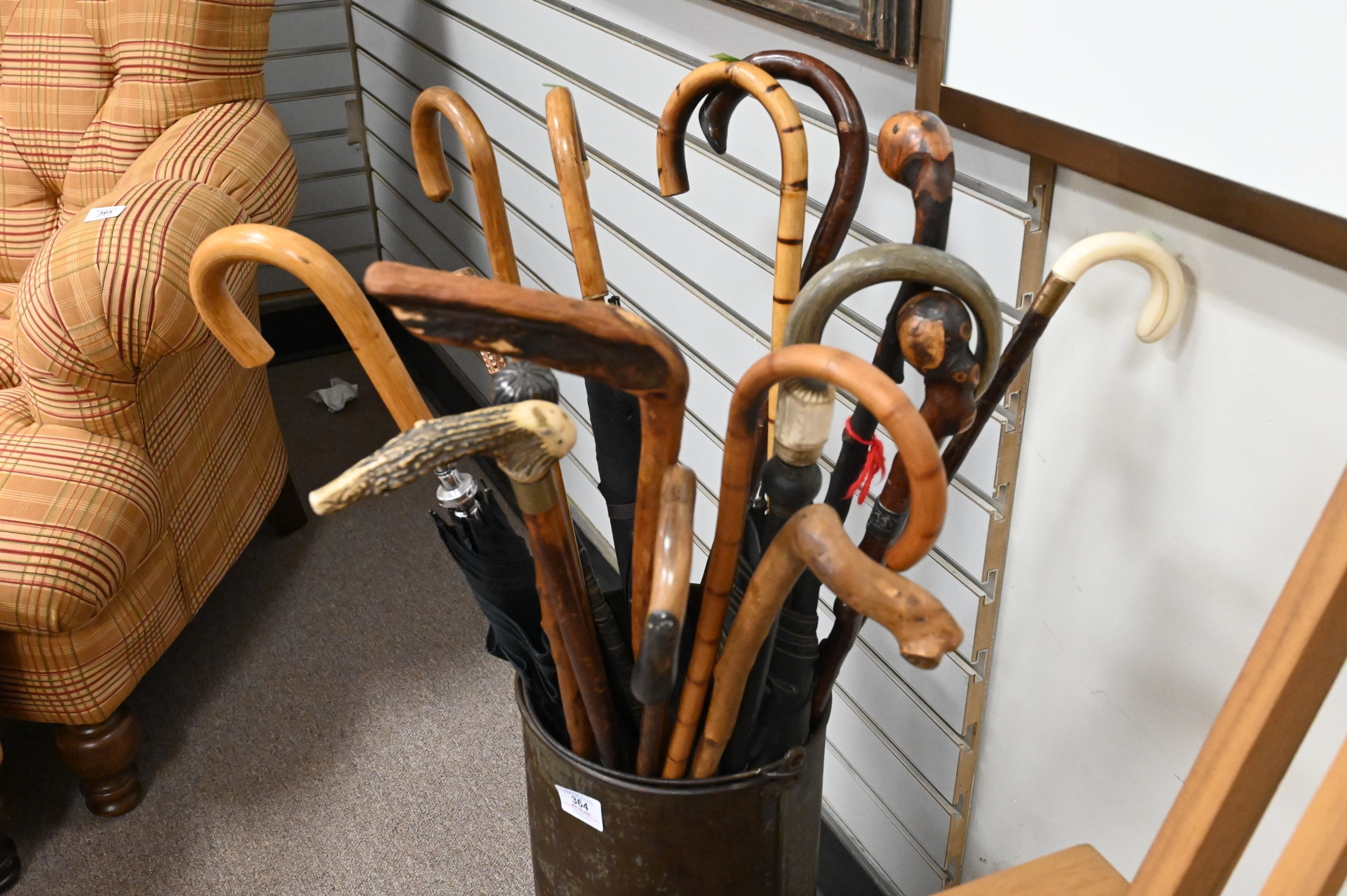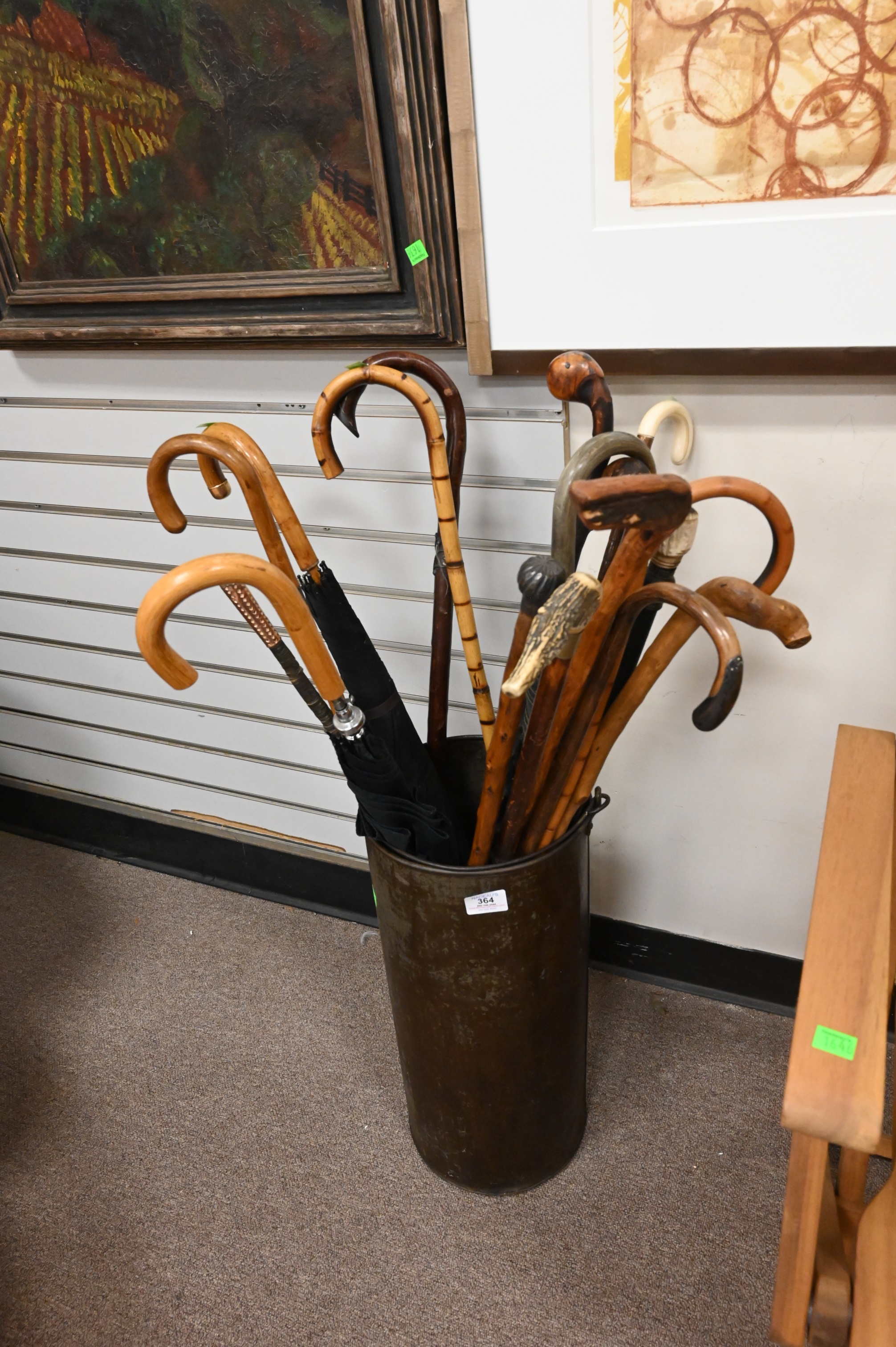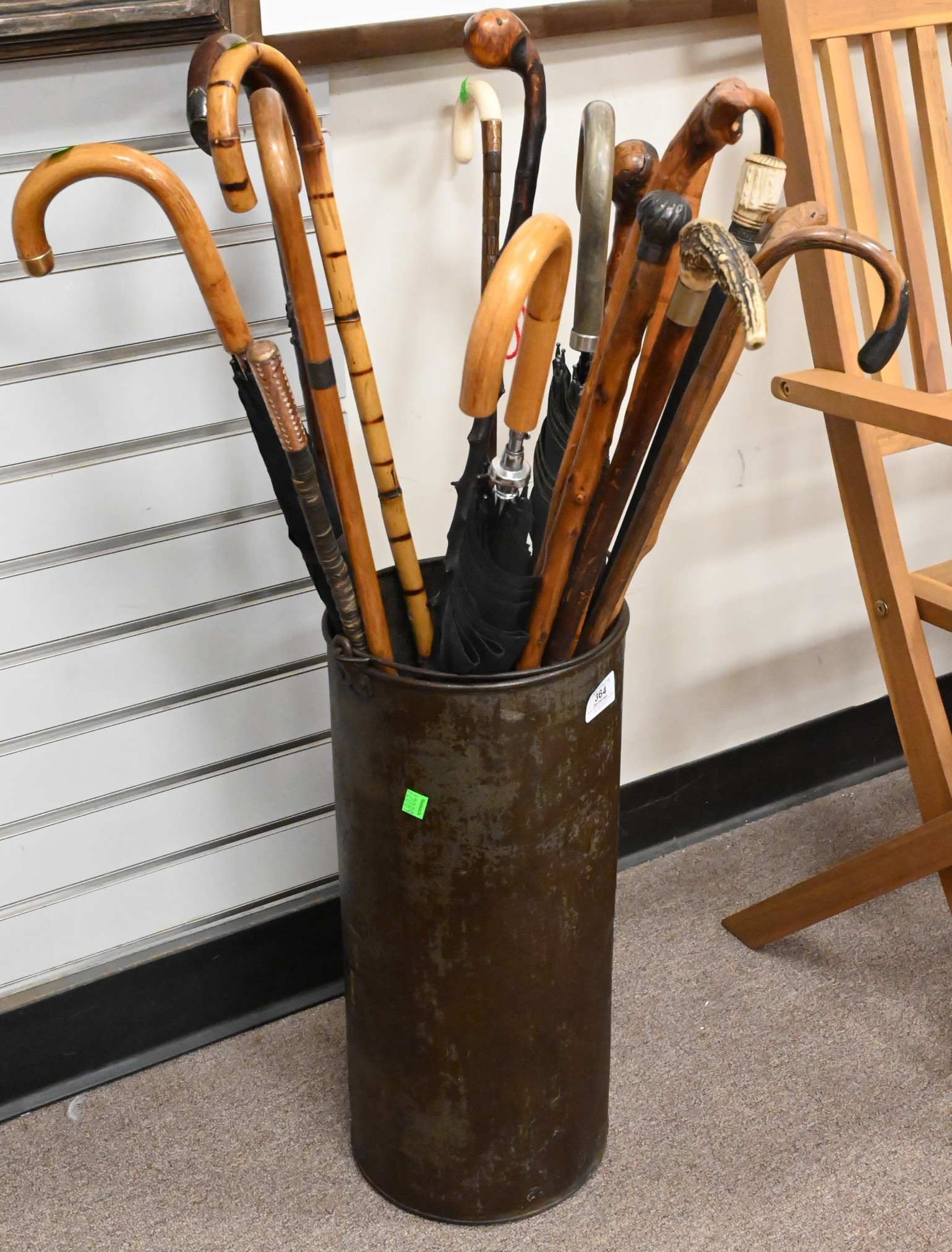 Group of 17 Canes and Umbrellas, to include 14 canes, 3 umbrellas, some silver, bone and with antler tops, tallest cane 38 1/2 inches, Provenance: Julius H Jacobson II a Fifth Avenue Estate.