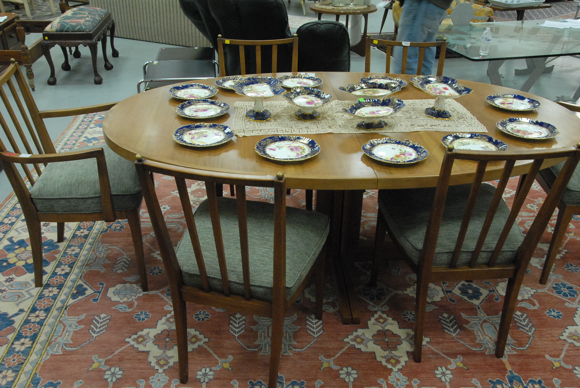 J. Mortensen Heltborg Denmark dining set oval table and six chairs with two 15 leaves, 48 x 74, opens to 114.