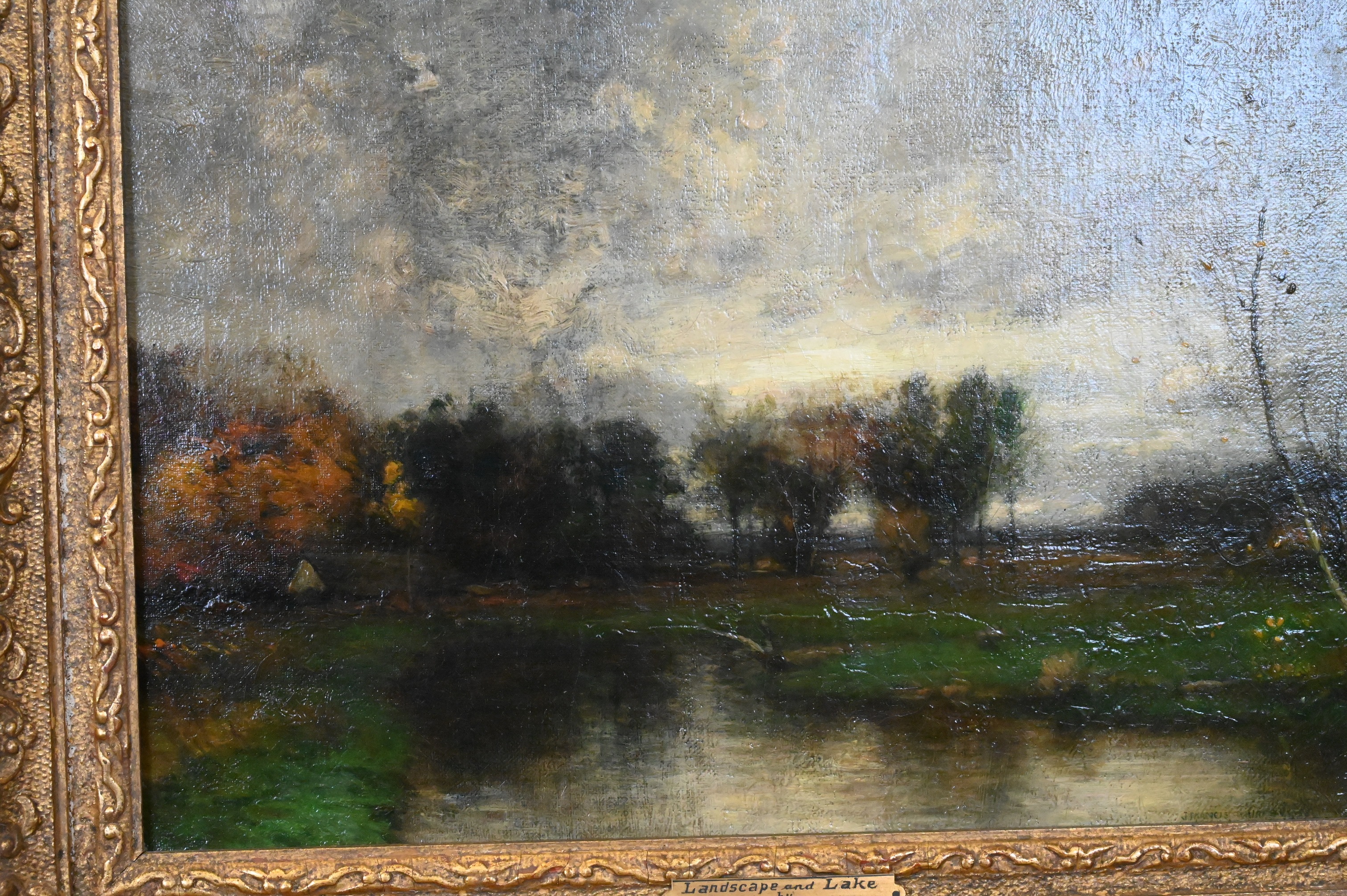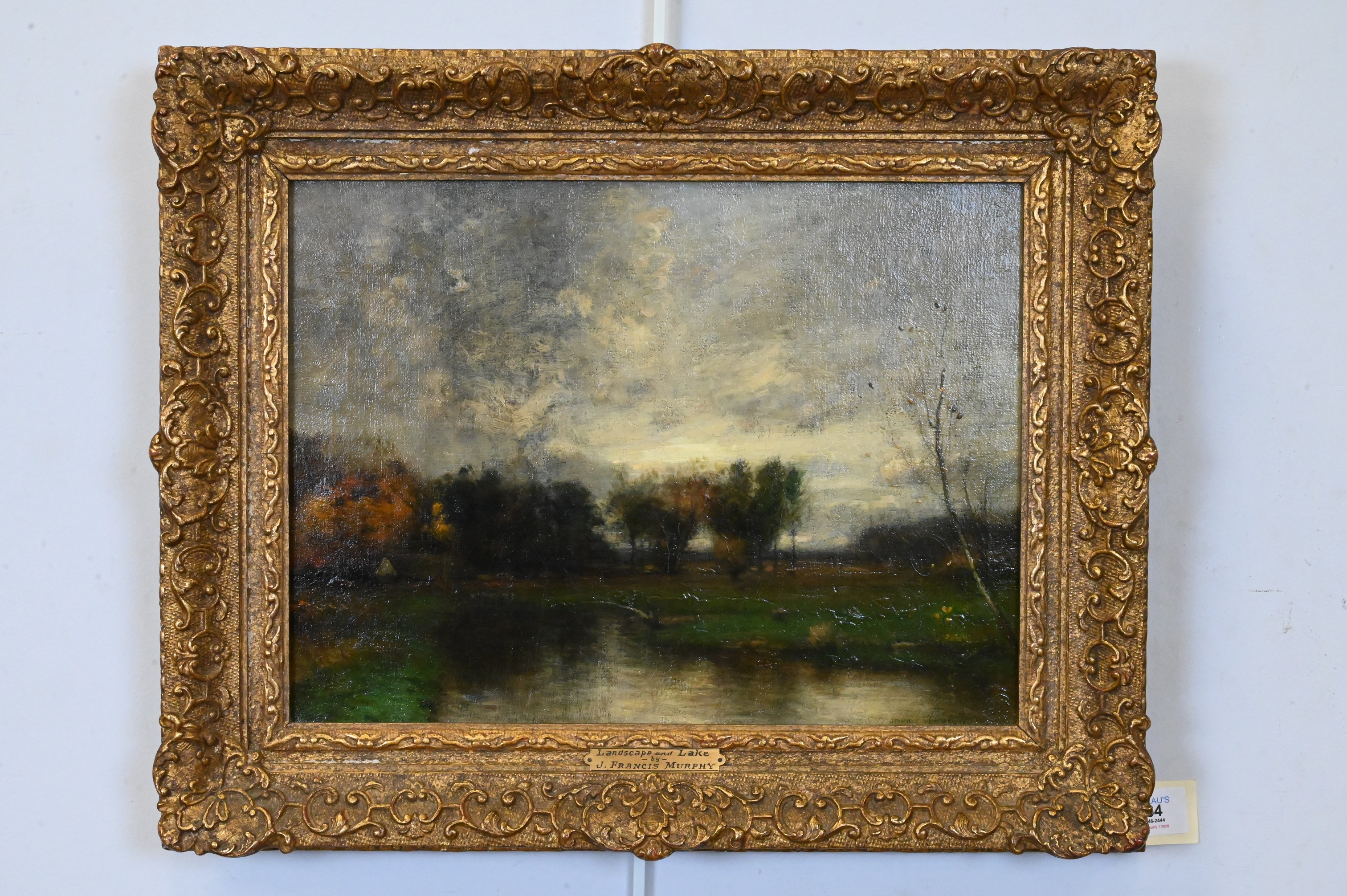 depicting a quiet pastoral scene with trees reflected in a calm lake beneath a softly illuminated sky; the atmospheric composition and restrained palette of greens, browns, and silvery blues reflect Murphy’s poetic Tonalist approach, emphasizing mood and subtle transitions of light