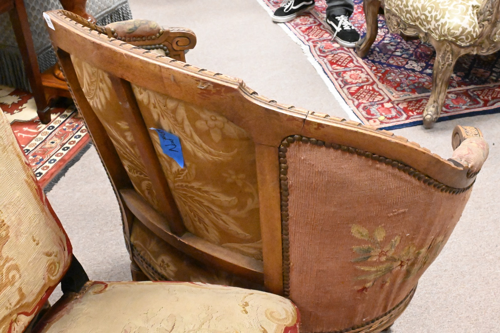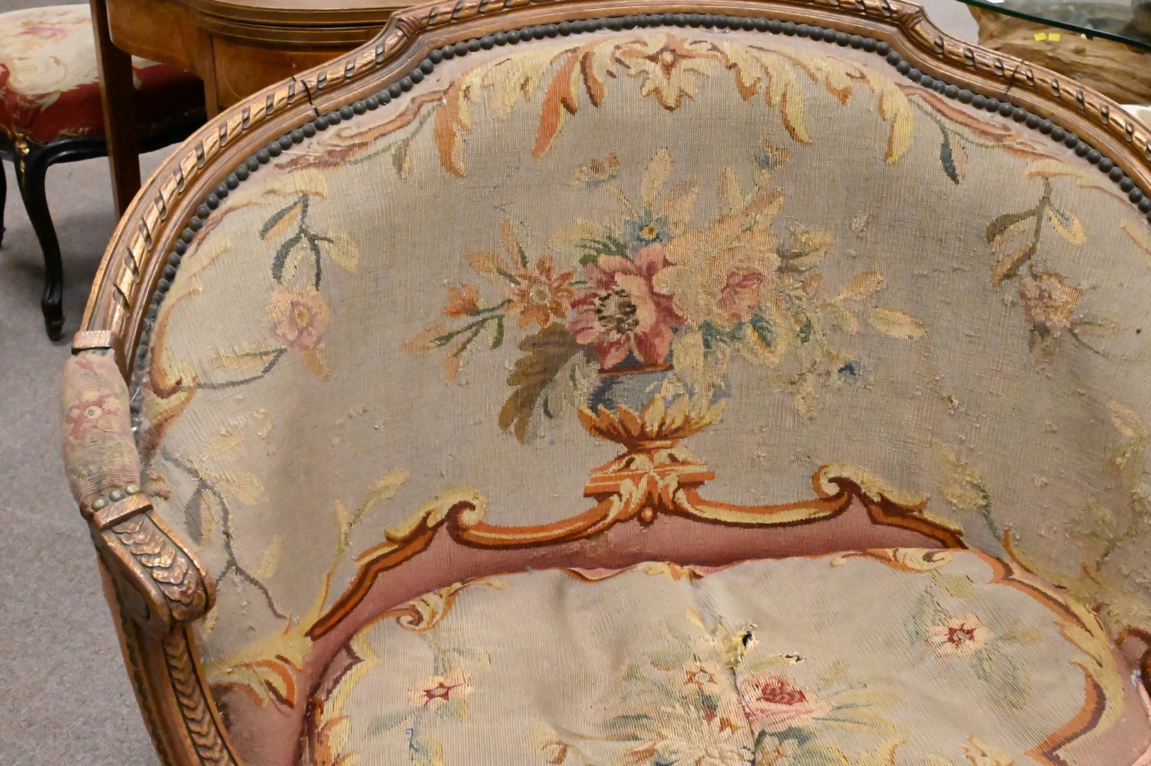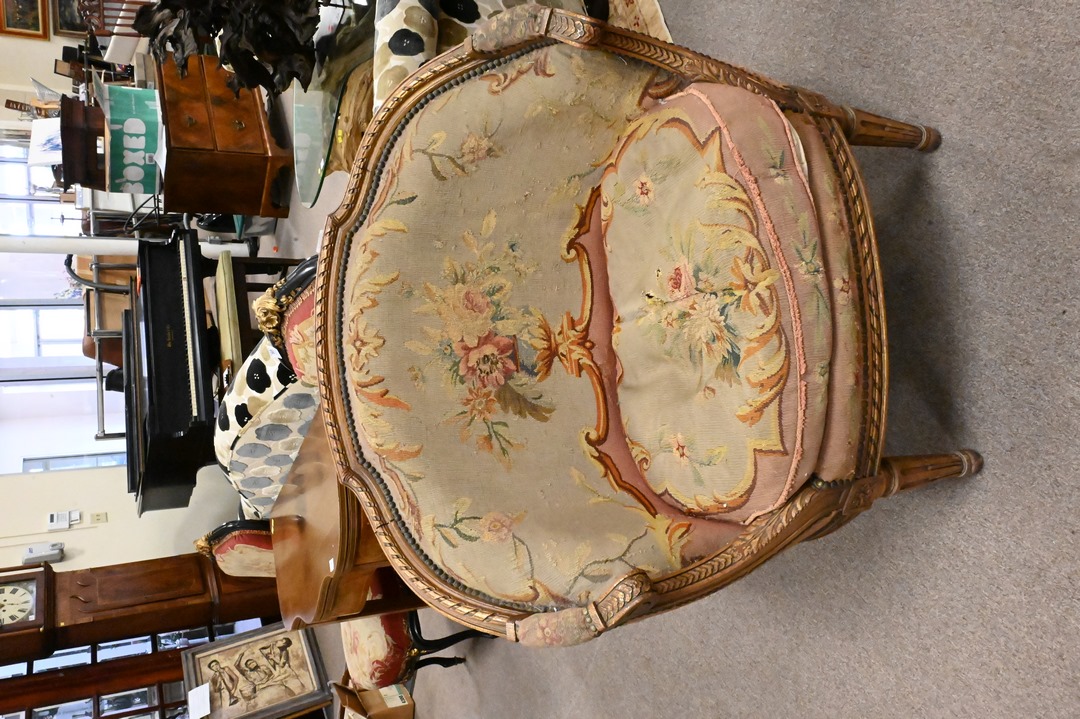 Louis XV Style Chair, having Aubusson upholstery, tear in seat, height 35 inches, width 35 1/2 inches.