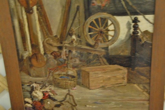Oil on board interior scene with spinning wheel, unsigned 34 x 19.