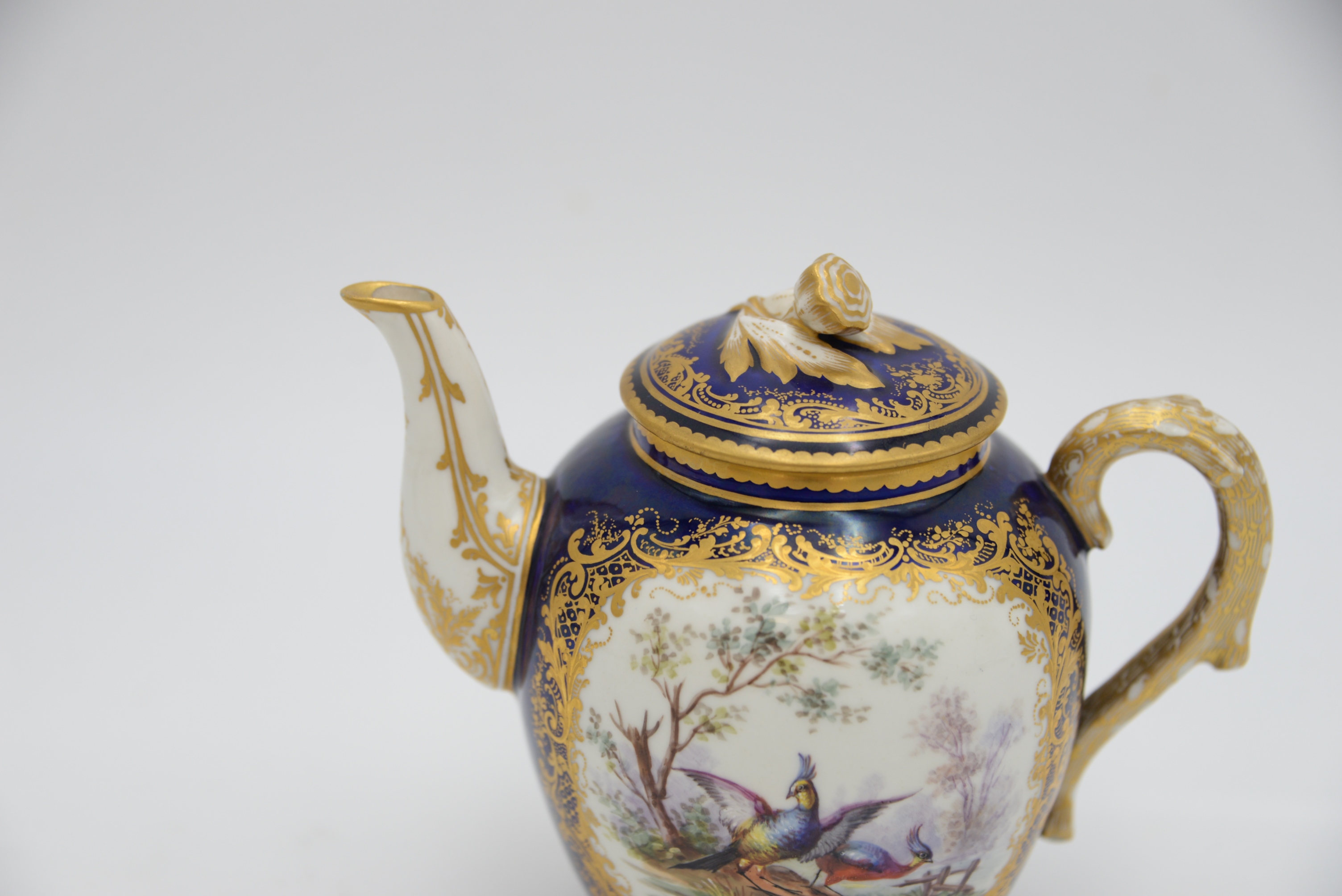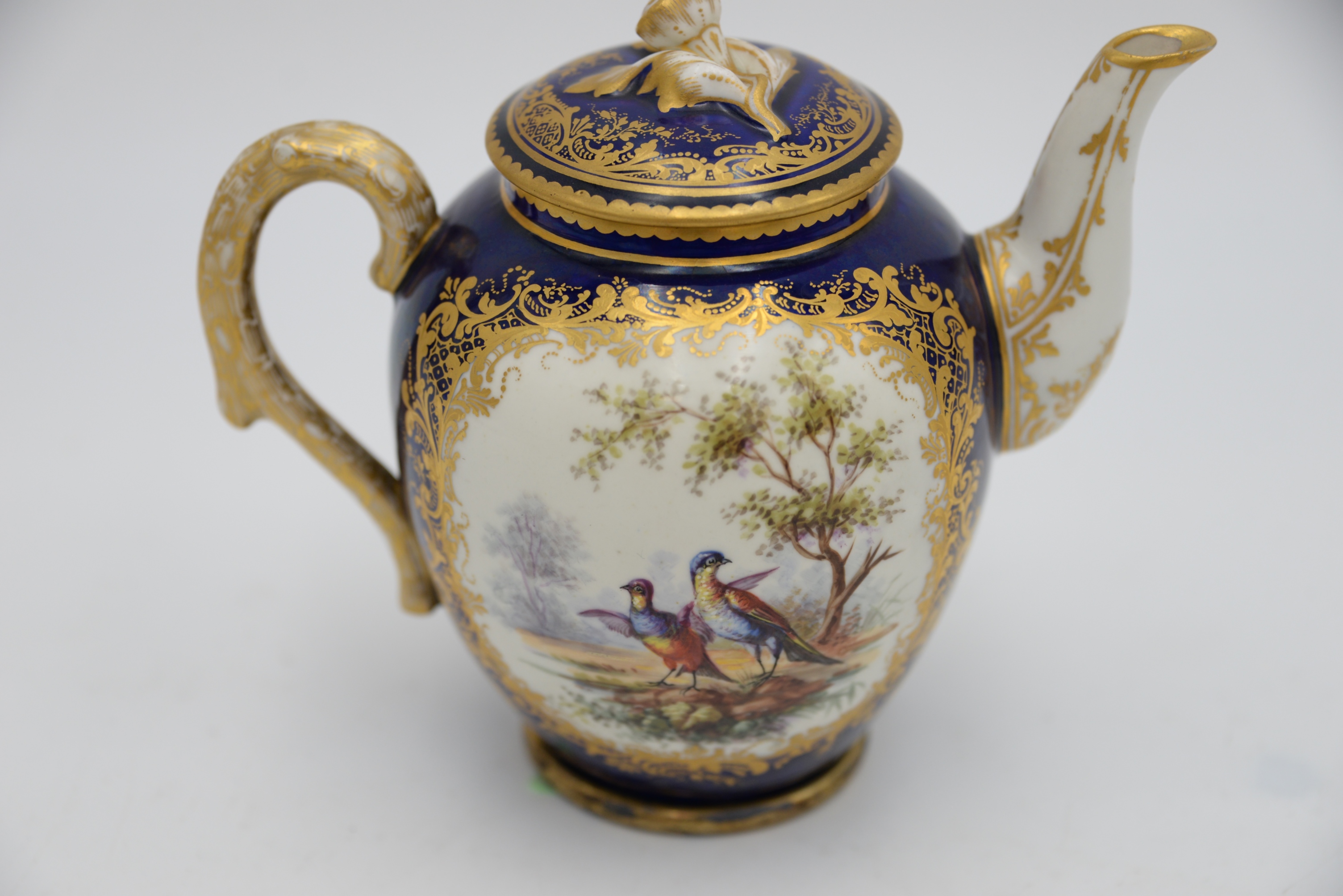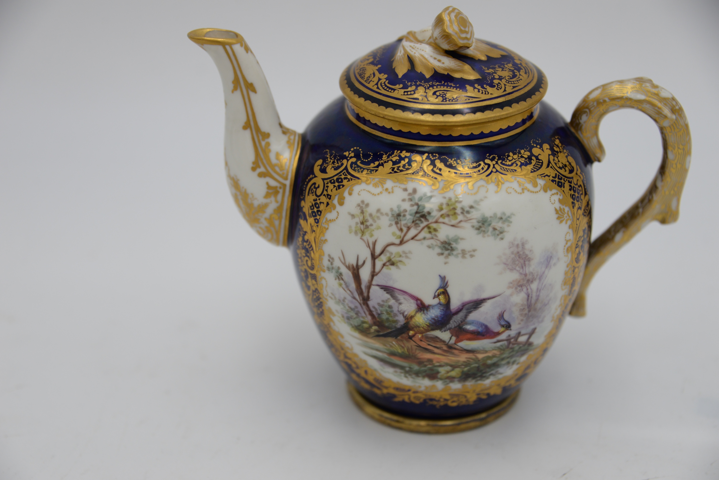 Sevres Porcelain Teapot, 18th century or later, blue ground with panels, honey painted exotic birds, gilt scroll and foliate border, having sevres mark with a “B” inter center and old paper table on bottom, height 5 1/2 inches.