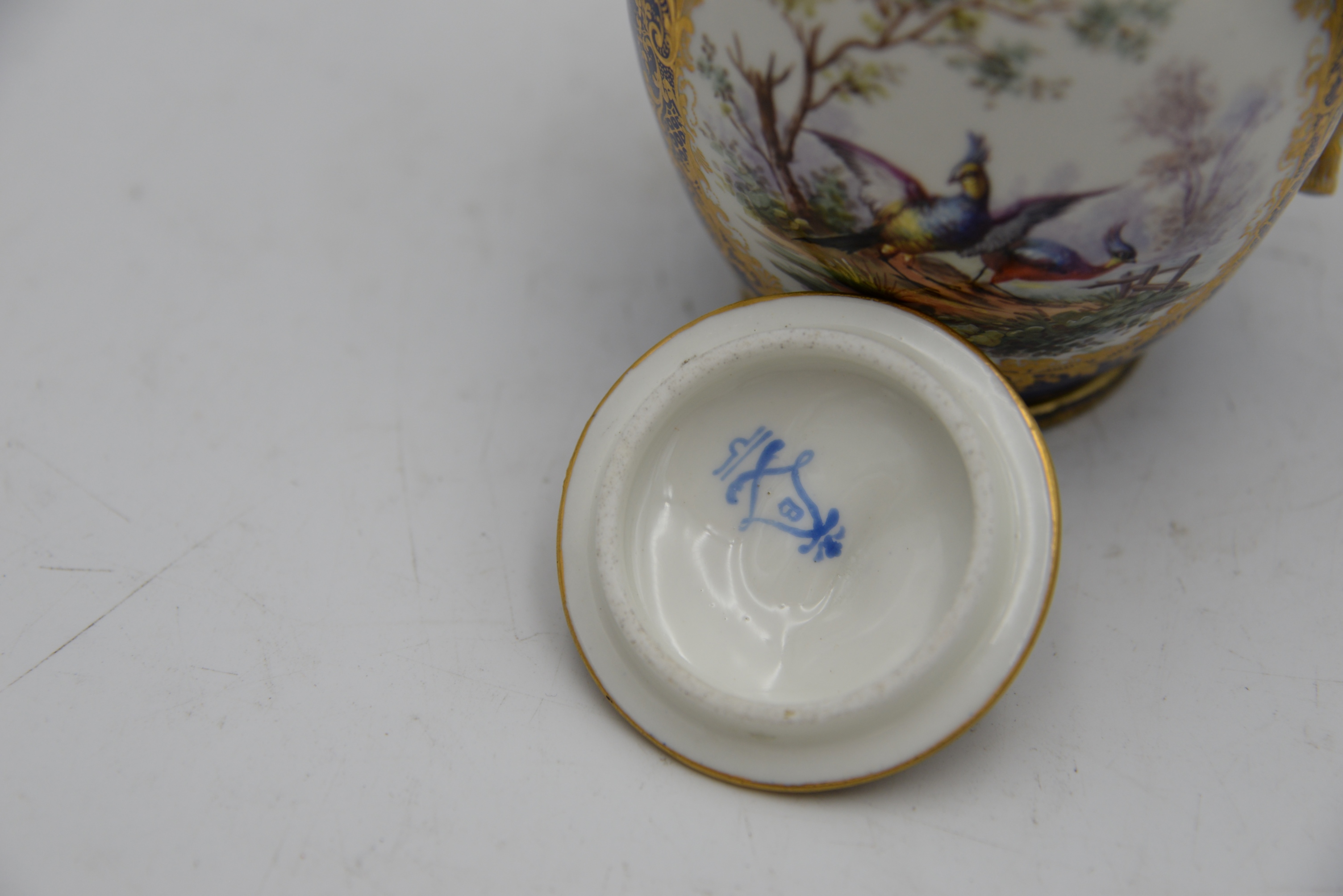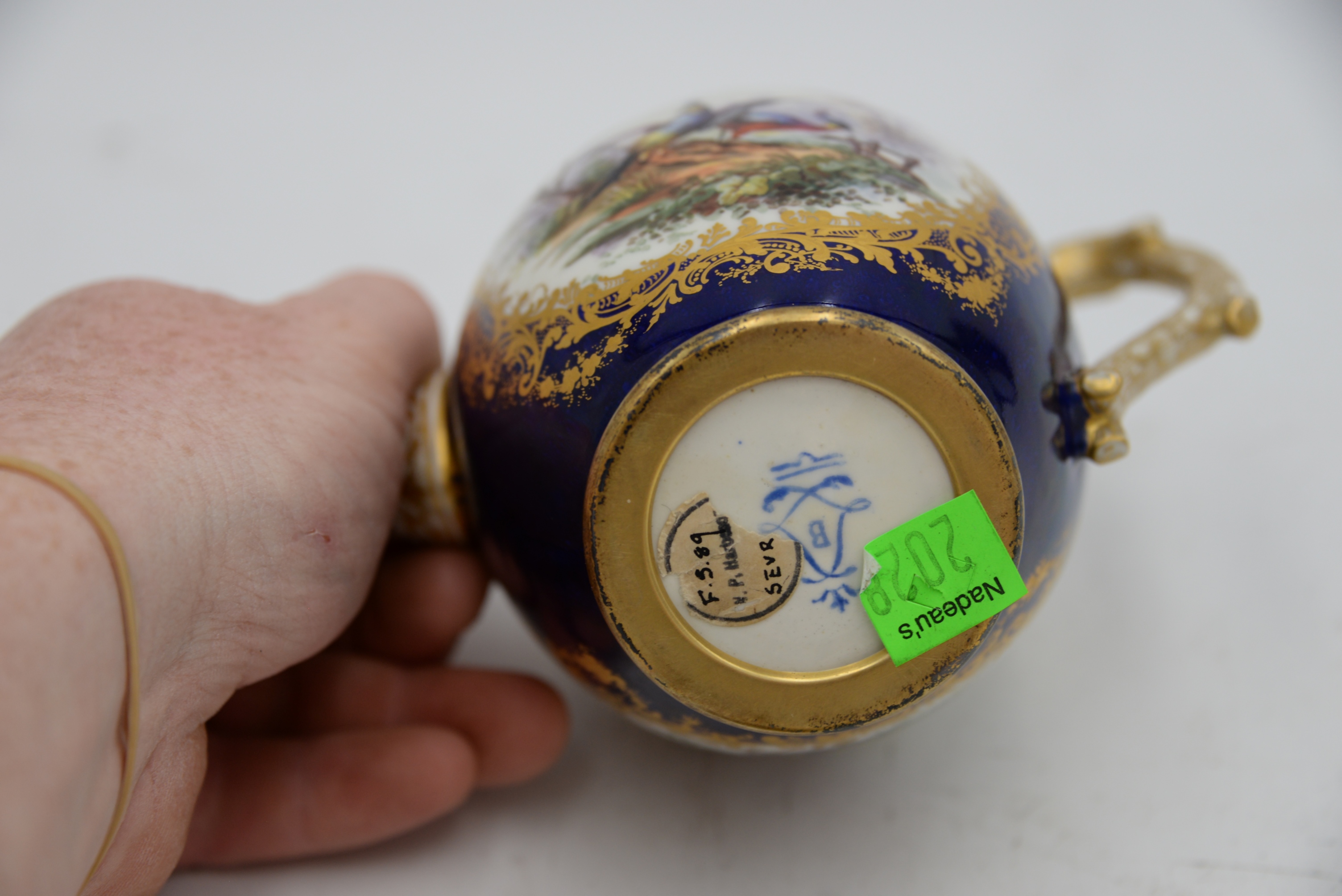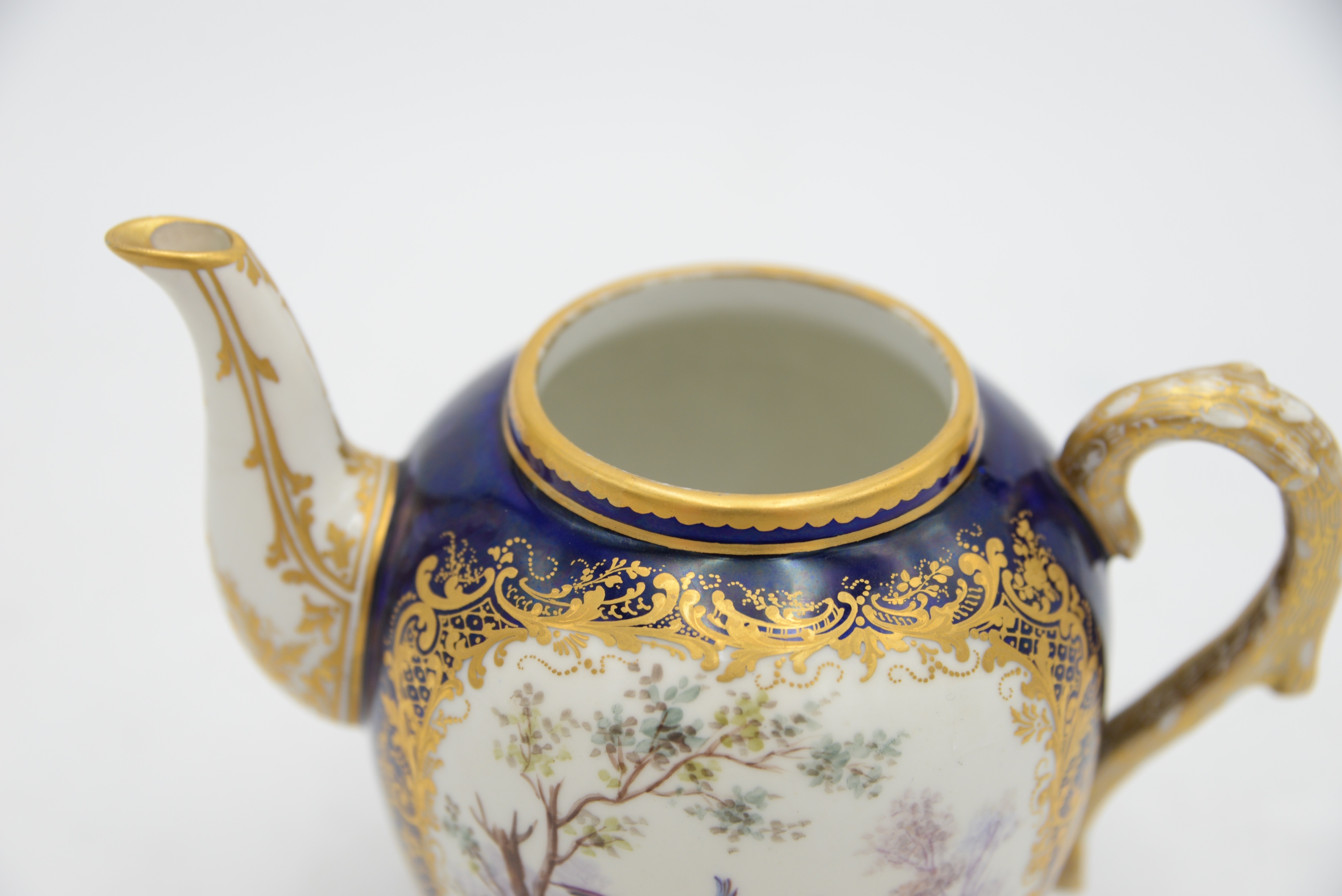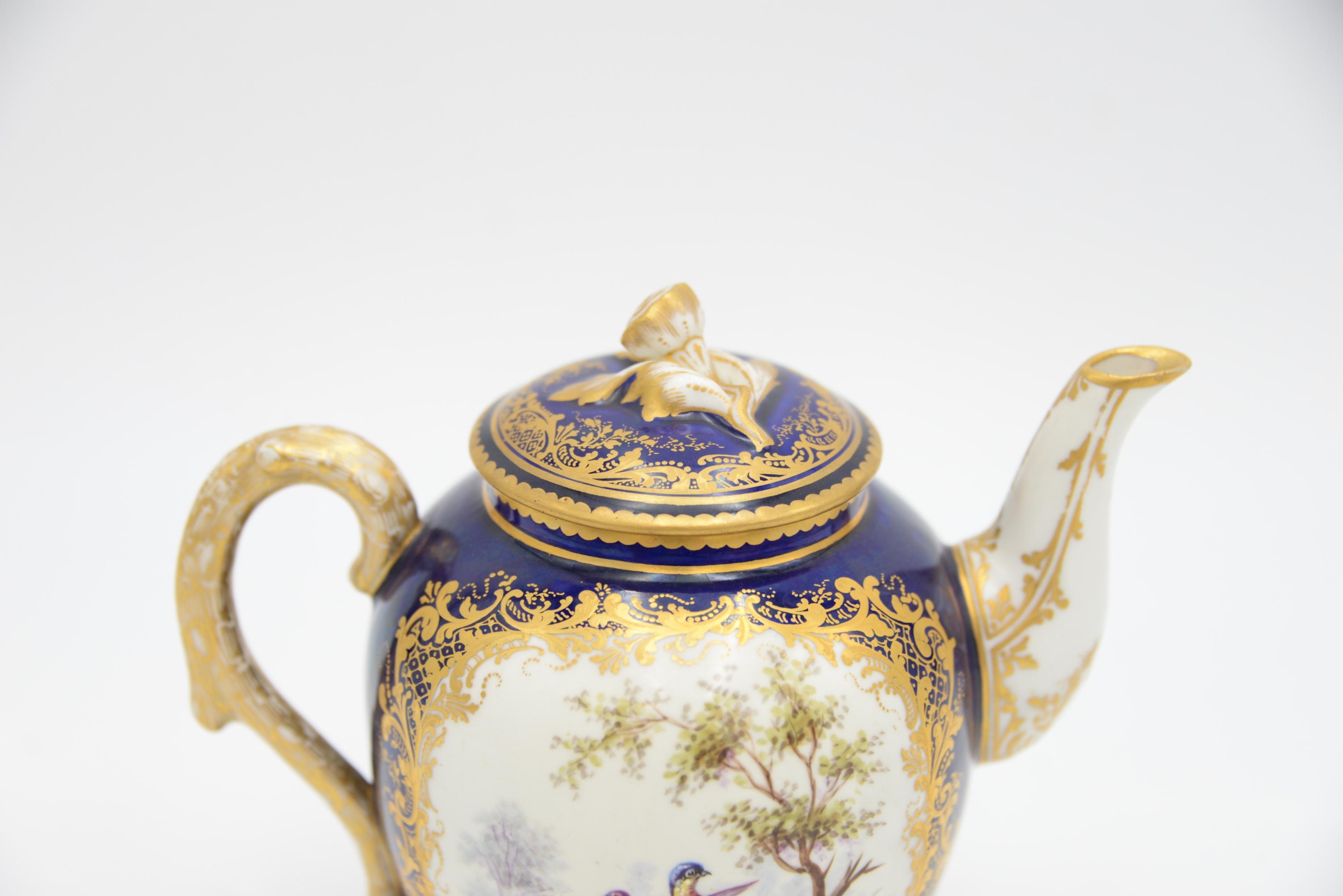 Sevres Porcelain Teapot, 18th century or later, blue ground with panels, honey painted exotic birds, gilt scroll and foliate border, having sevres mark with a “B” inter center and old paper table on bottom, height 5 1/2 inches.