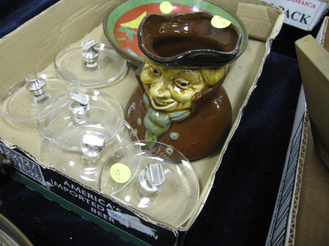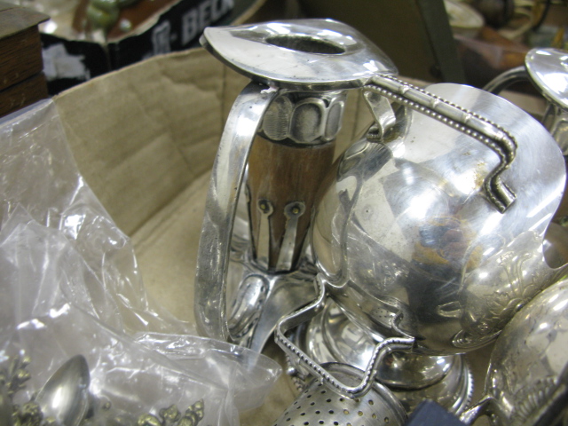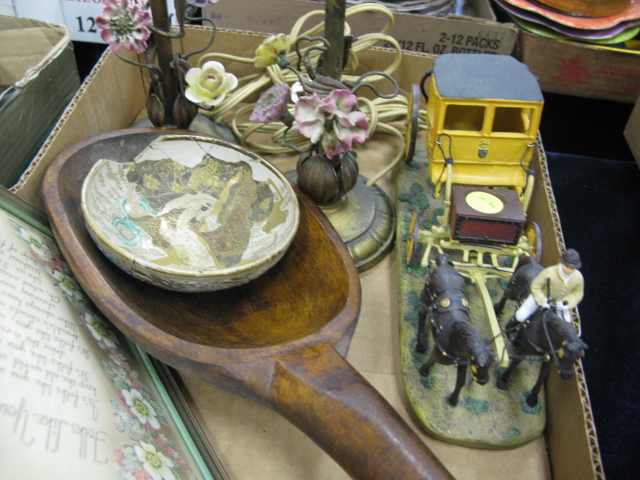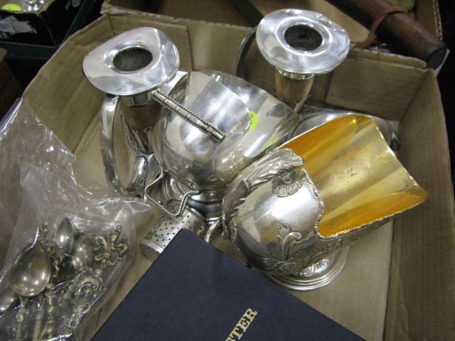 Three box lots cigerette ashtrays, pair of budoir lamps, group of silver plated items, serving tray and glove boxes.