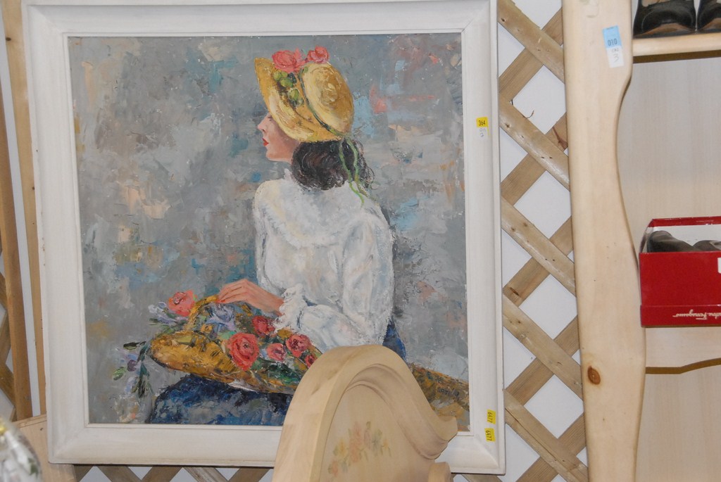Lot 364: Two framed pieces oil on canvas of girl with flowers signed lower right S. Rothany 53 and watercolor of side of building signed low…