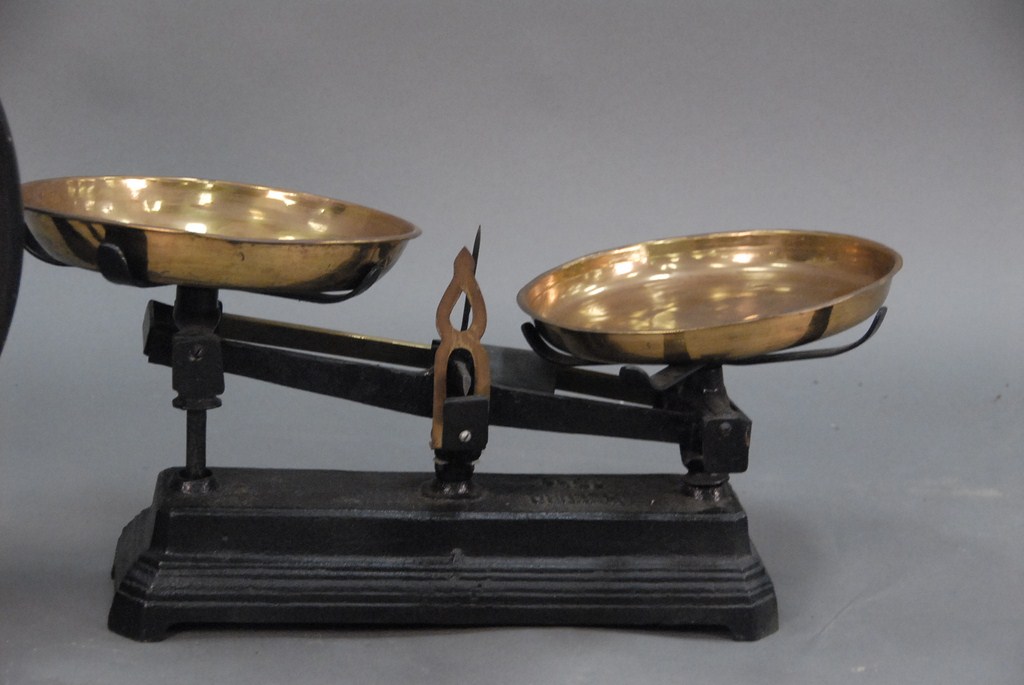 Two piece lot coffee grinder and balance scale with brass dishes.