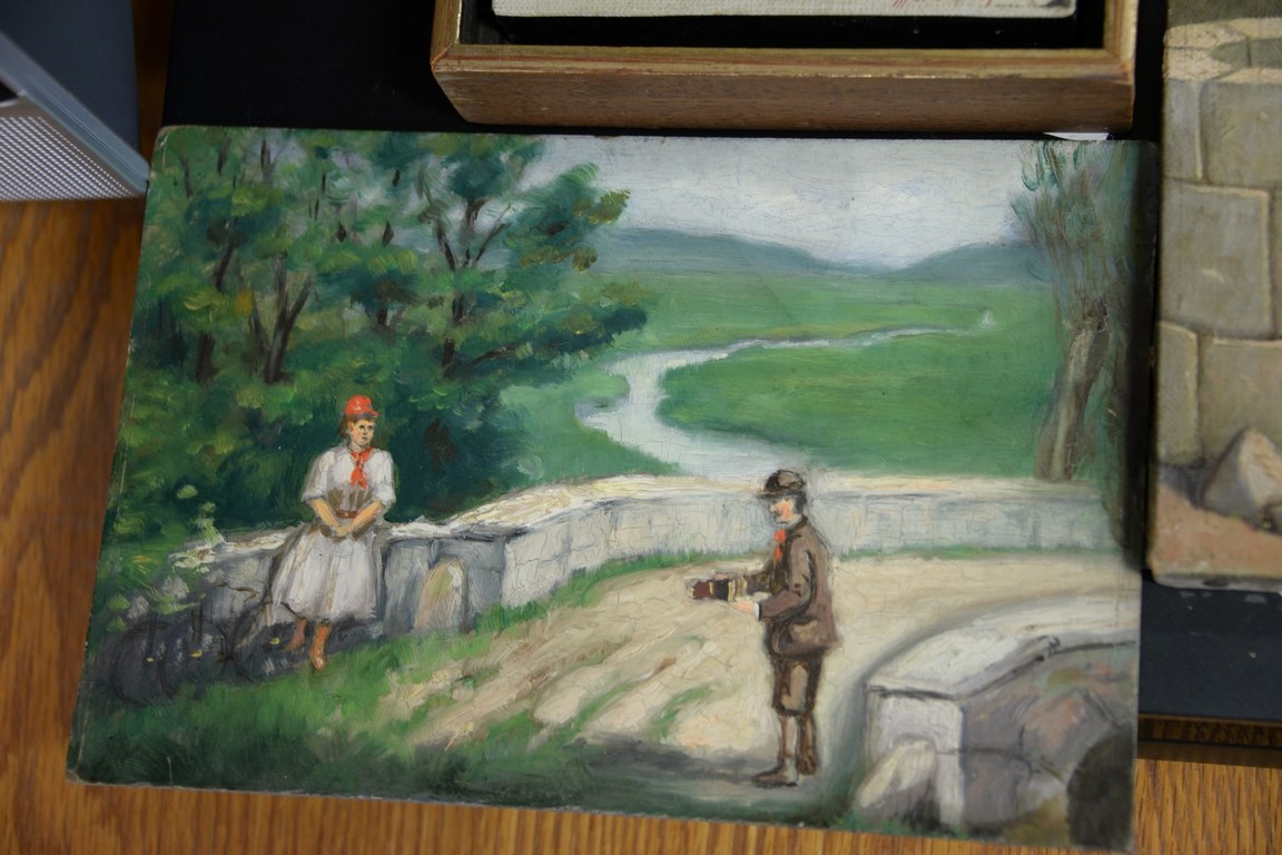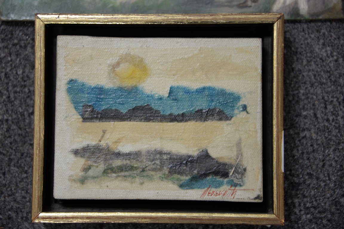 Two small oil paintings including Ernst Heinemann 1848-1912 Have Your Picture Taken signed on label on reverse with Salmagundi Club label on reverse and Fred Lawrence Messersmith sunset signed lower right Messersmith. 4 x 5 and 6 x 9.