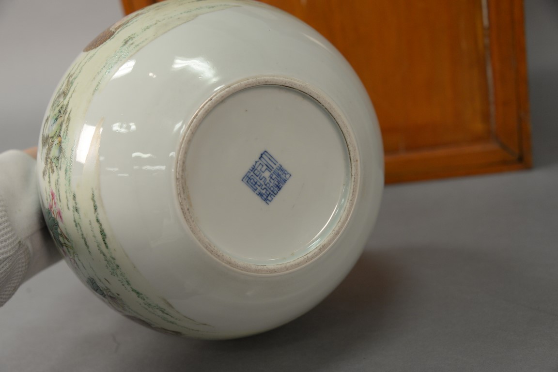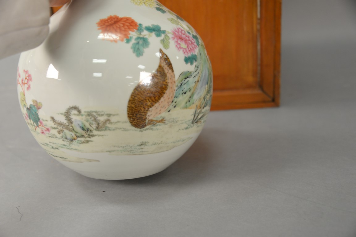 Chinese famille rose globular vase with flowers and game birds with 18th century blue mark on bottom along with original early shipping box.