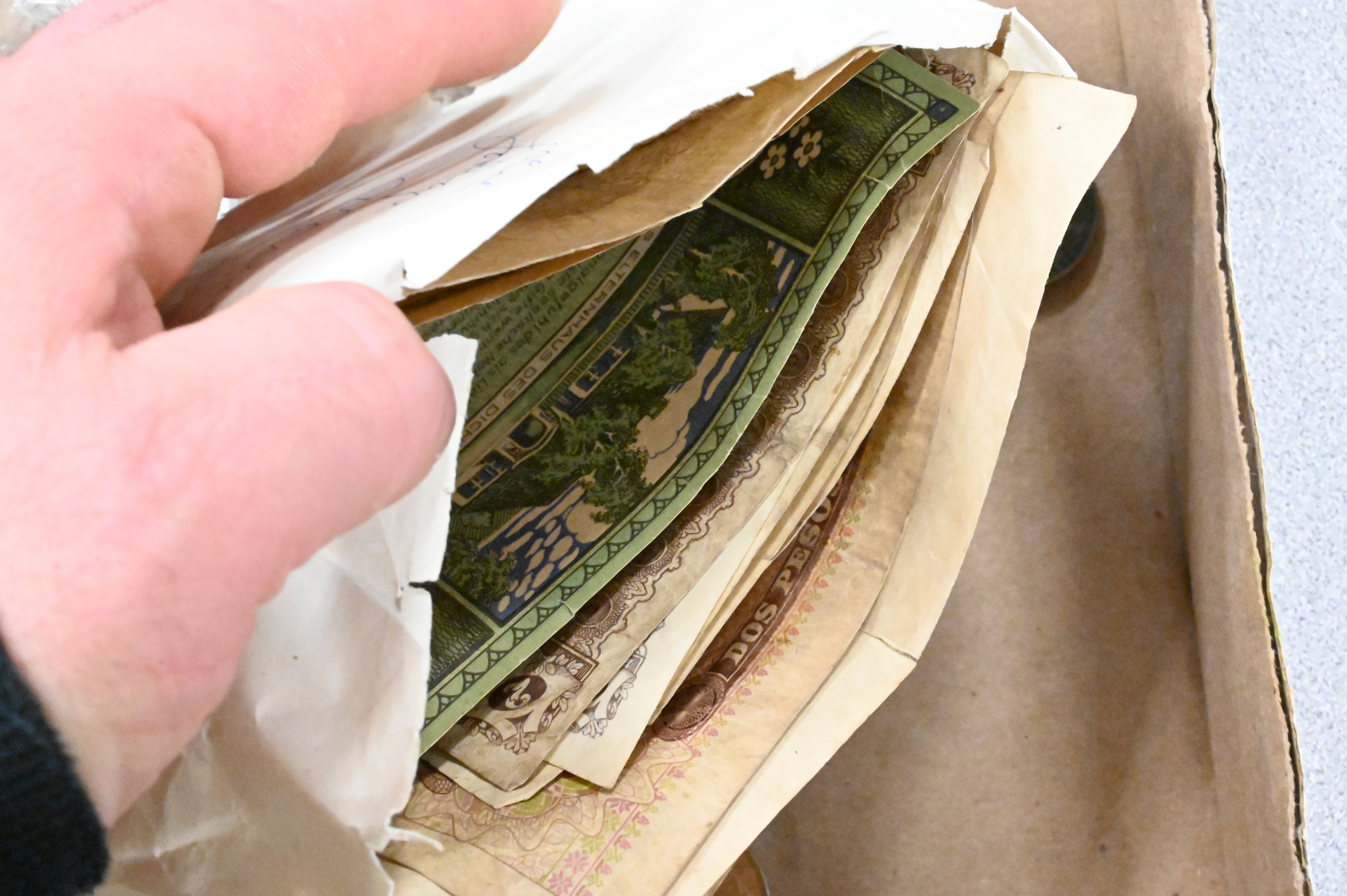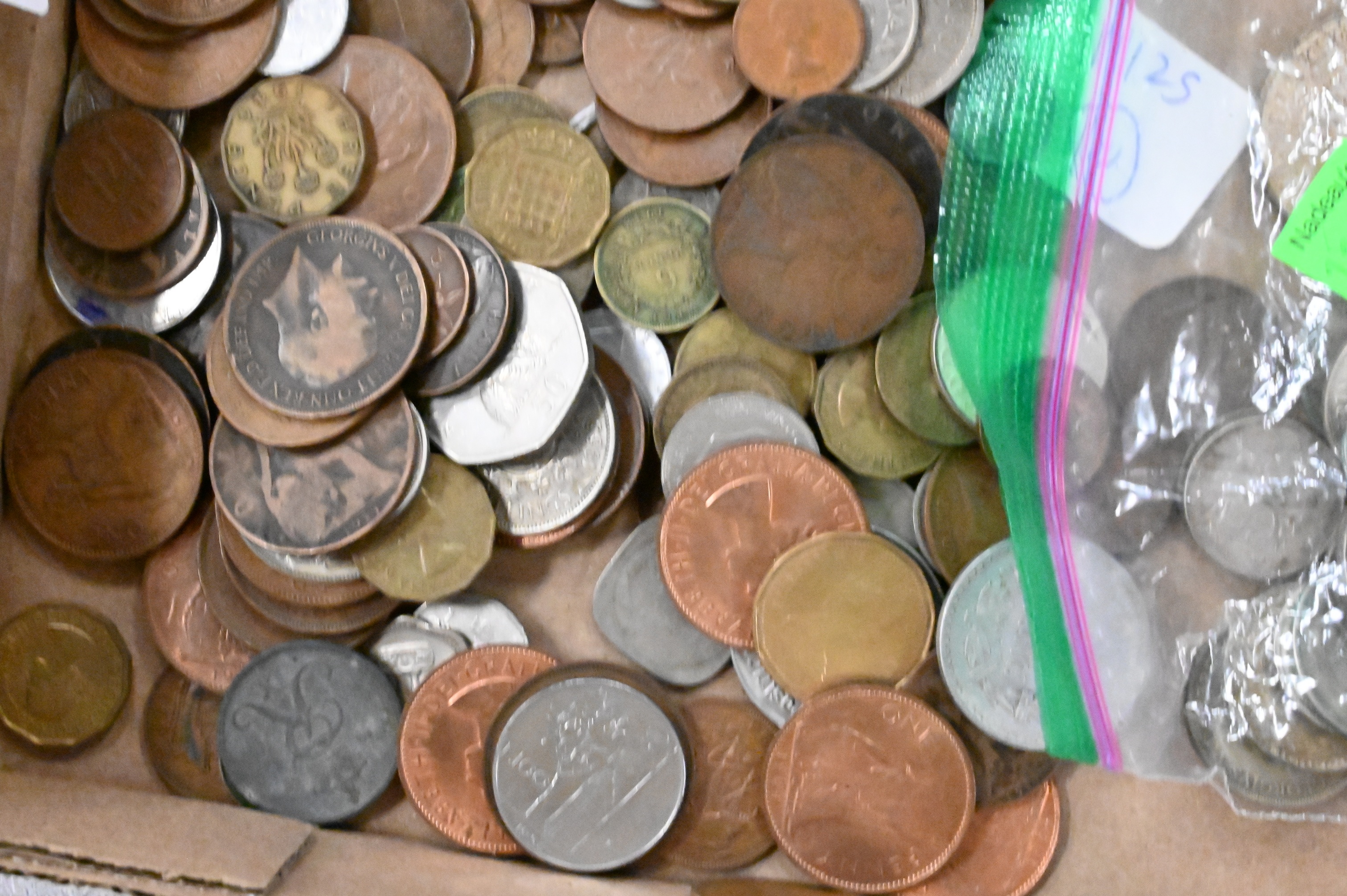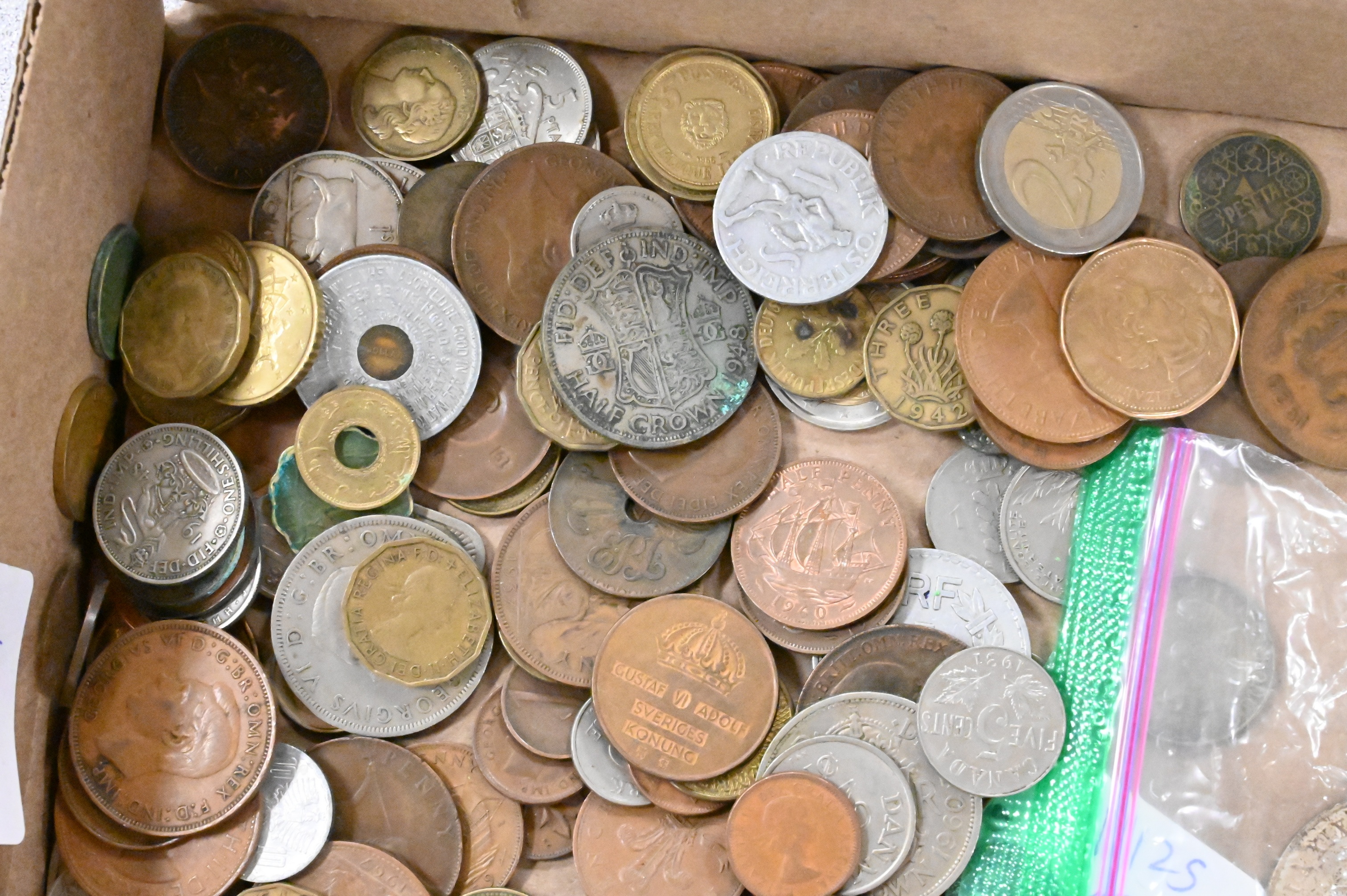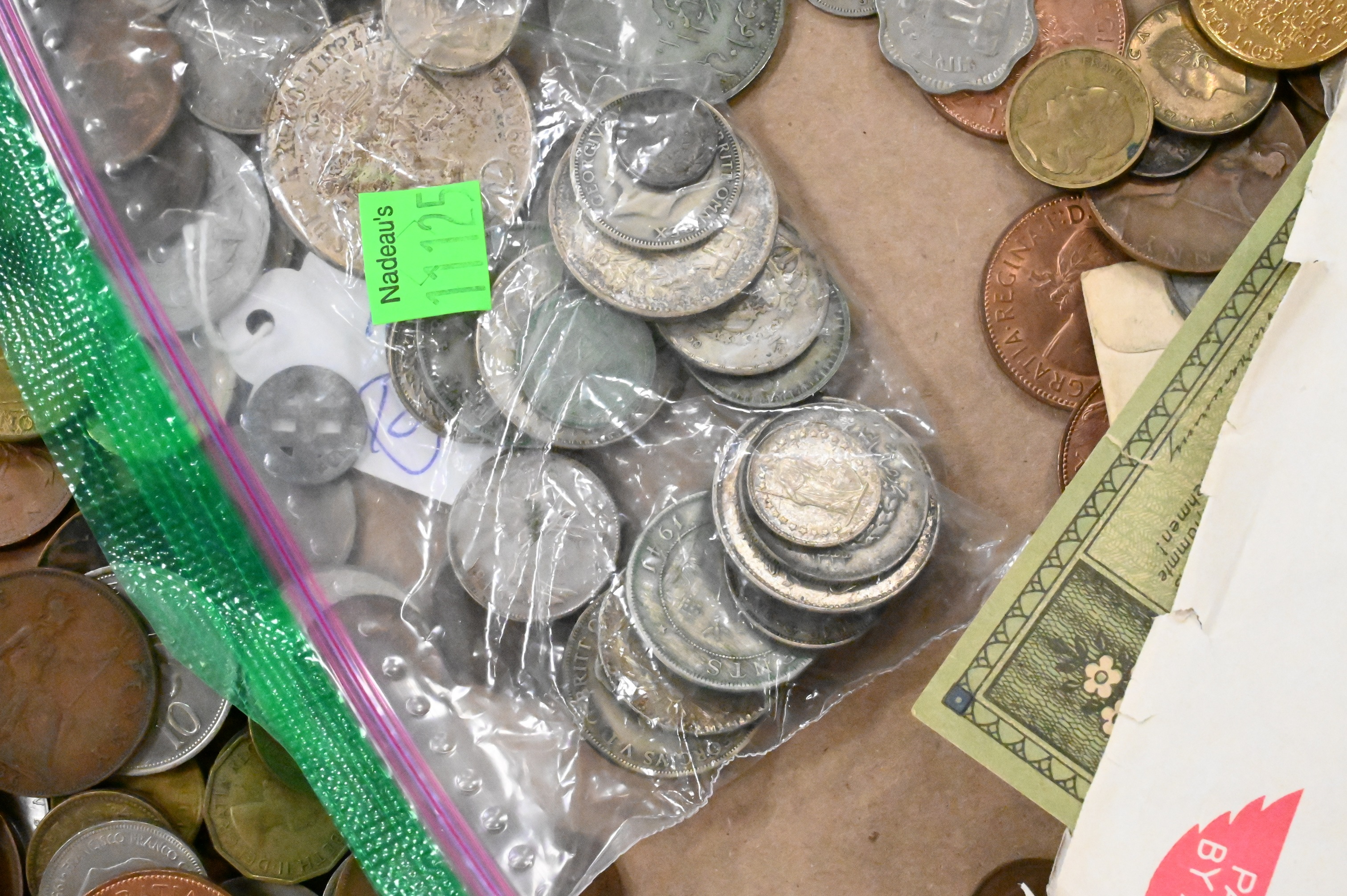 Large assorted collection of world coins and banknotes including examples from Great Britain, France, Germany, Mexico, Australia, and other countries; visible pieces include several early to mid-20th century British pennies and halfpennies depicting George V, George VI, and Elizabeth II; Mexican pesos; French 10 francs; Australian shillings; and various European copper, nickel, and silver pieces. Also includes a selection of early 20th-century paper money such as German Notgeld 5 Mark (Ahlen, Westfalen, 1918) and French Chamber of Commerce notes (Paris, Le Havre).
