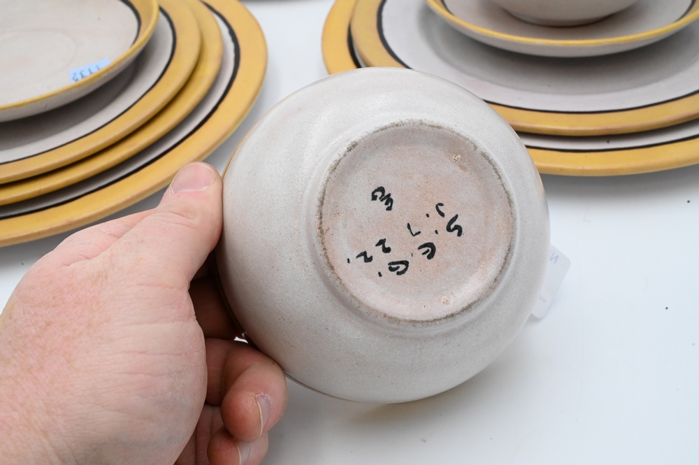 Lot 365: 12 Piece Group of Saturday Evening Girls Pottery, to include 2 dinner plates, 2 luncheon plates, 2 salad plates, 2 saucers, 2 cups, 2 soup bowls, white with yellow border.