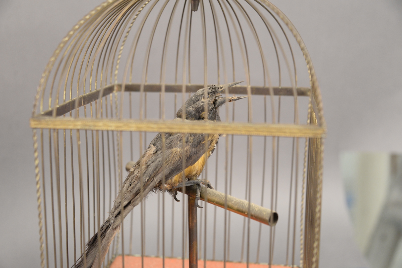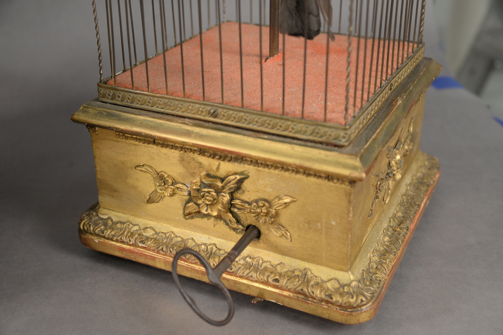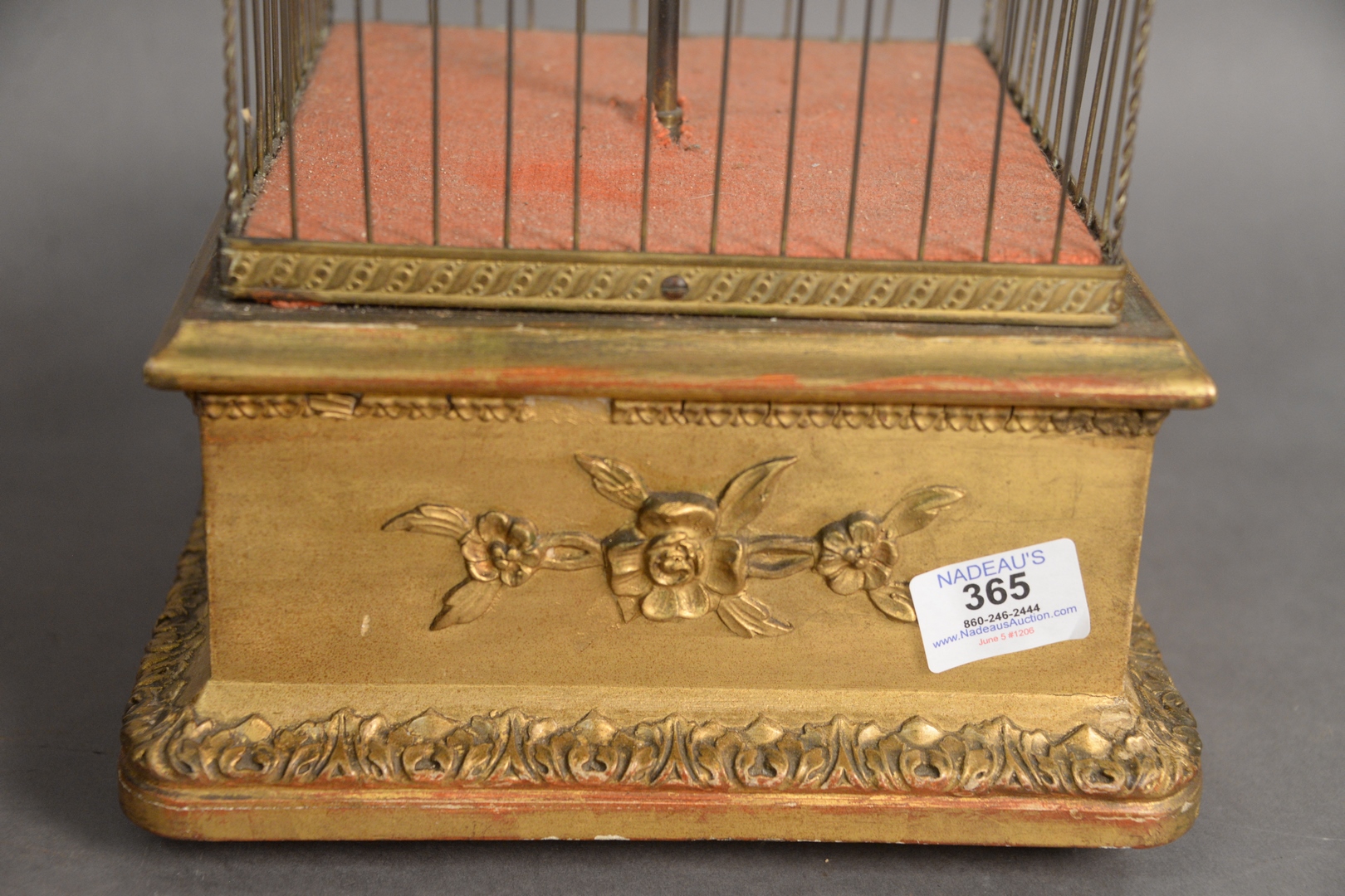 Lot 365: 19th Century or Later Giltwood and Brass Automaton Bird Cage, having mechanical singing bird in brass cage with music box case, moving head, in working condition, height 20 inches, width 9 1/2 inches, depth 9 1/2 inches.