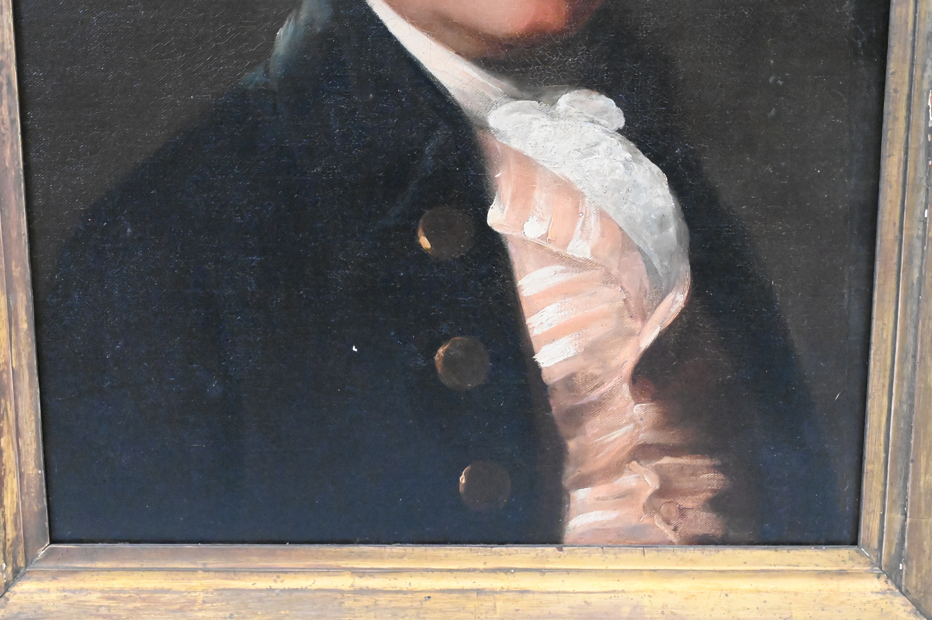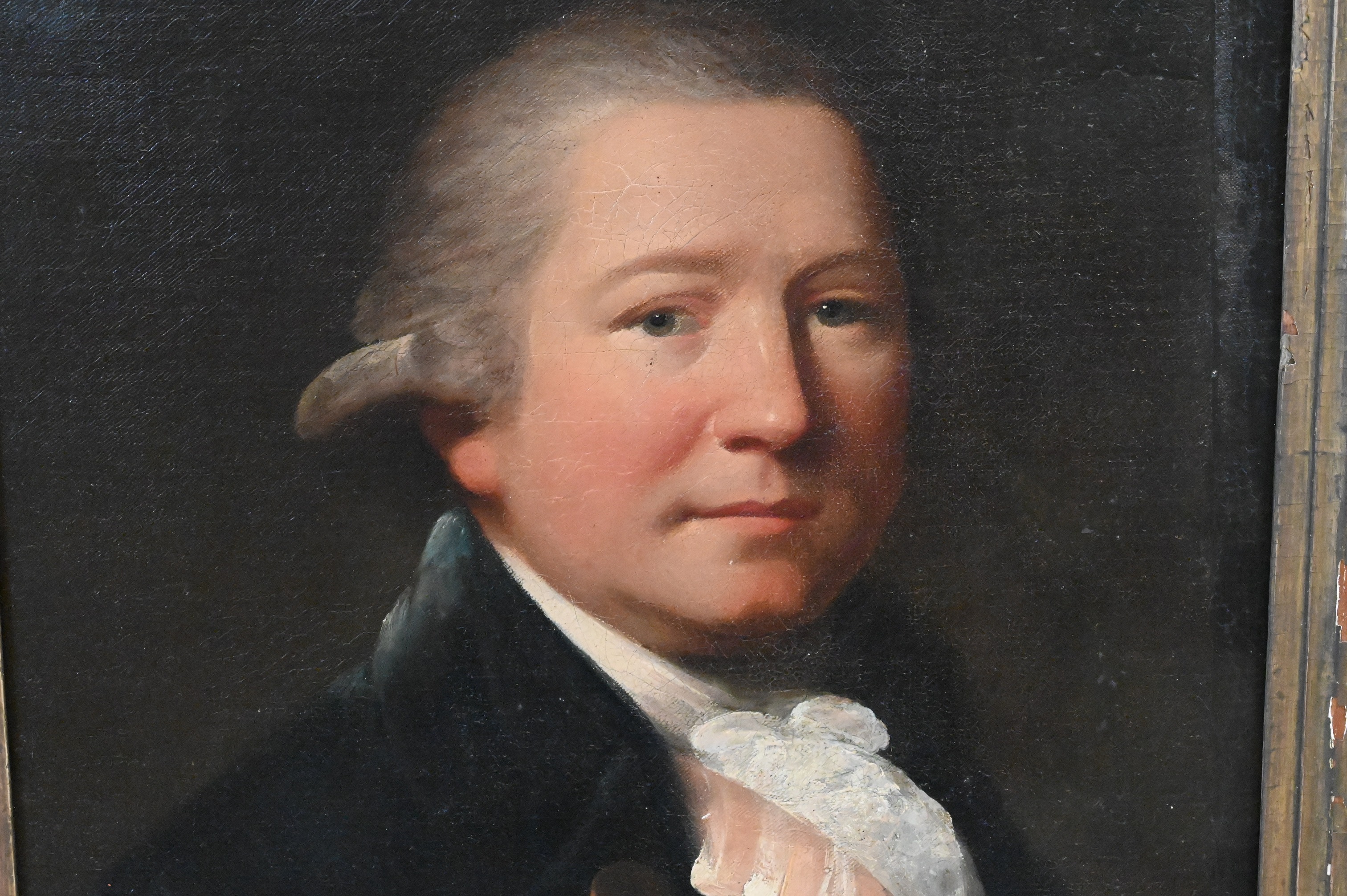 Depicting a gentleman in a dark coat with gilt buttons and a white cravat, his powdered hair tied back. Painted with restrained realism typical of late 18th century Anglo-American portraiture.