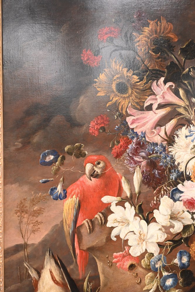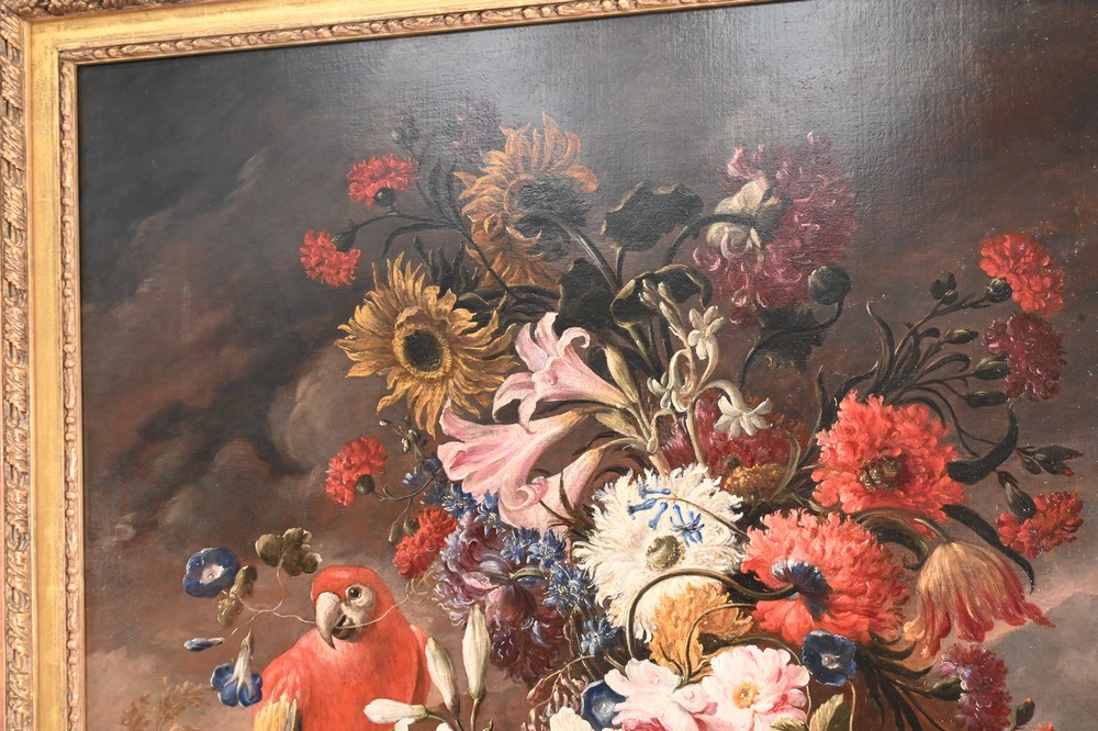 Lot 365: Attributed to Andrea Belvedere (1642 – 1732), floral still life with a parrot and ducks, oil on canvas, unsigned, 49 1/2″ x 39 1/4″….